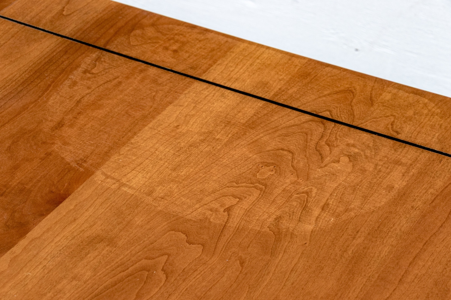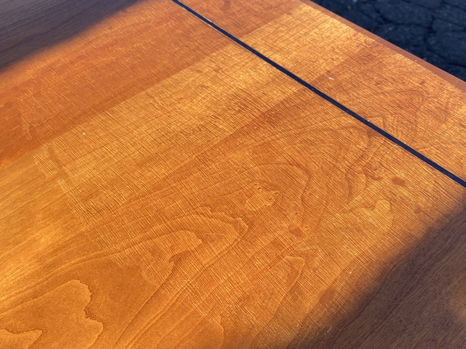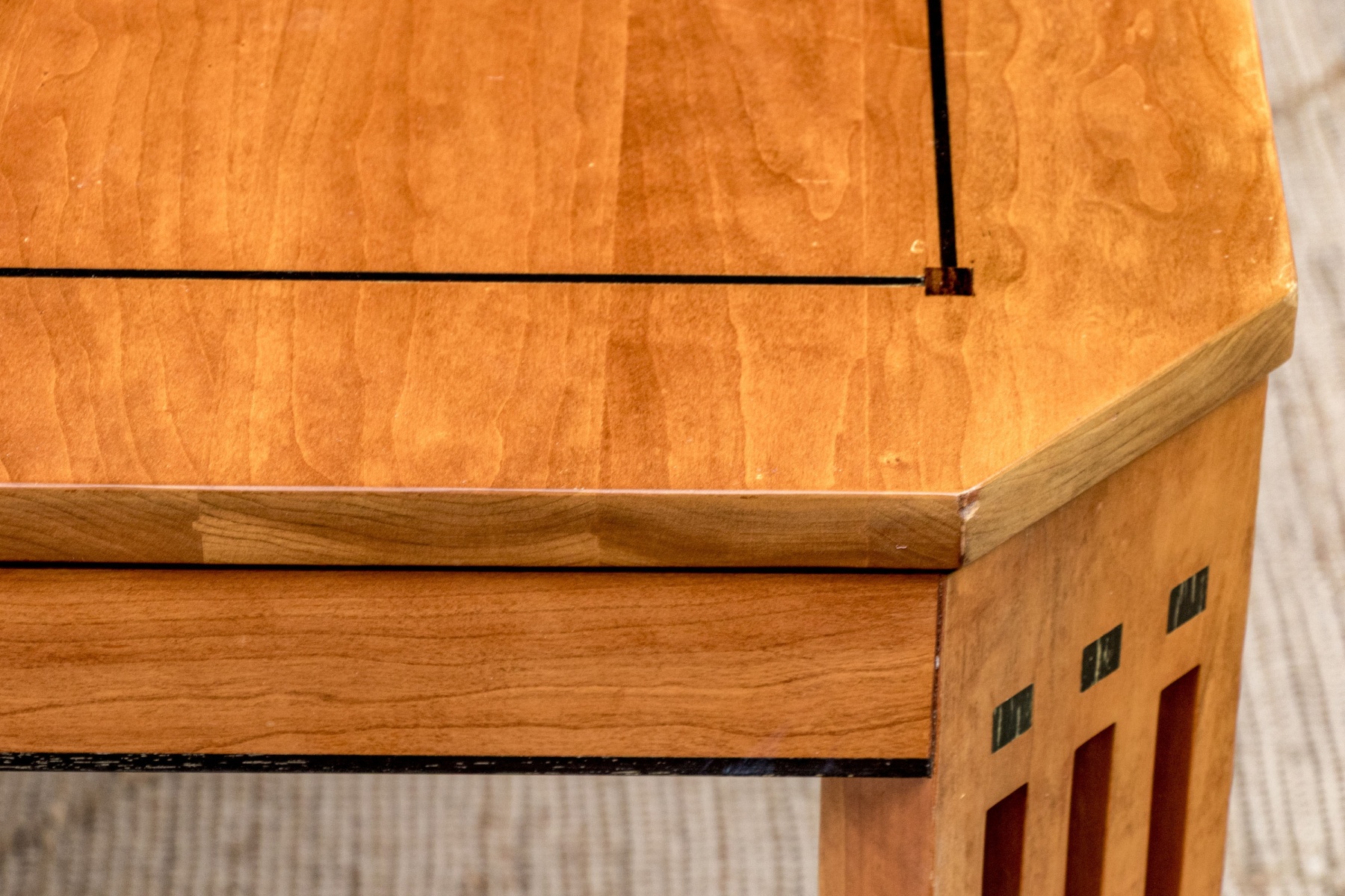 There is a fracture to one corner of the end of the table which can be seen but is completely stable. There is an area near one corner of the table top that has craquelure to the lacquer finish. Additional scuffs to the corners, trim and a scratch to one leg.