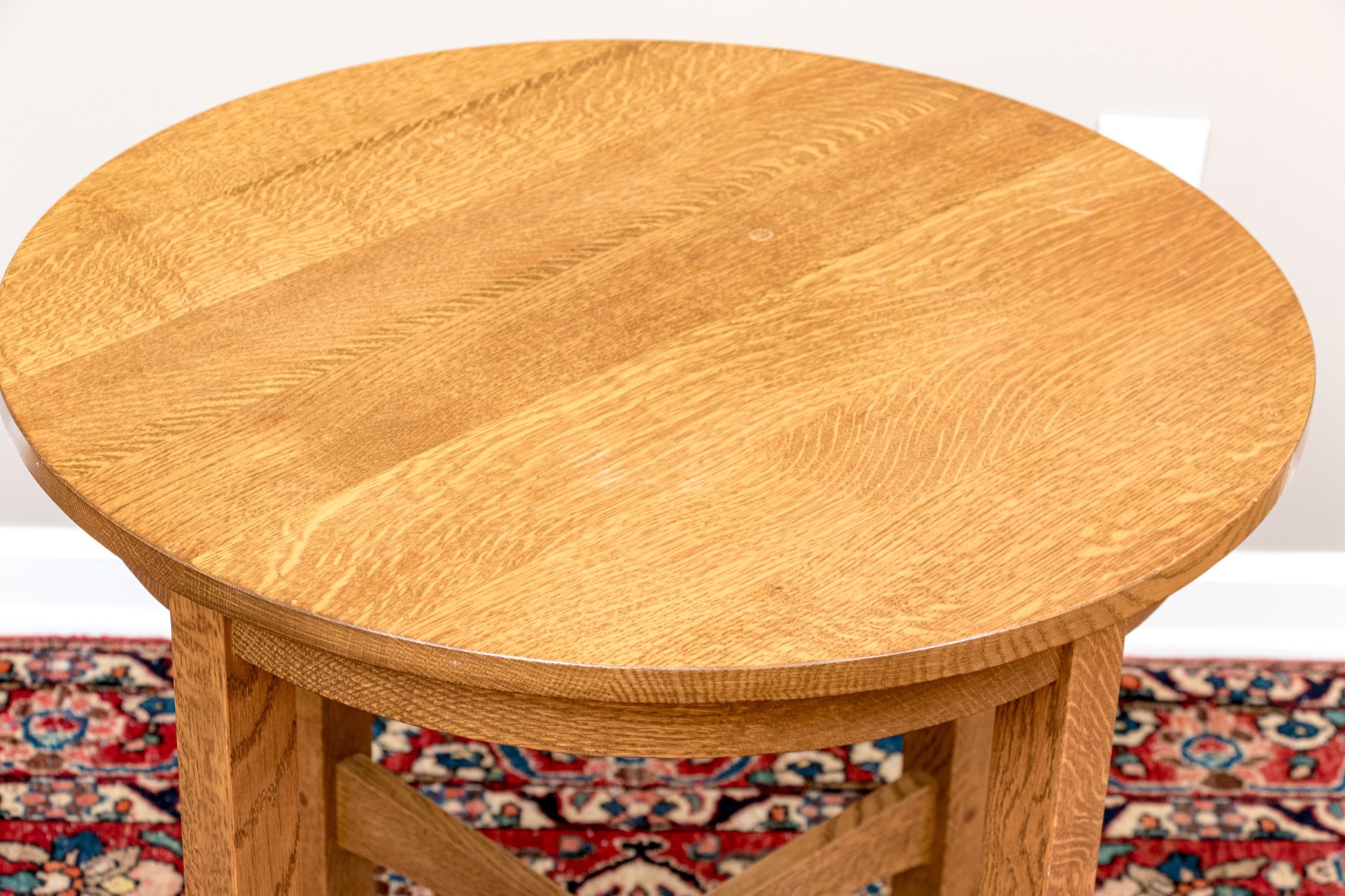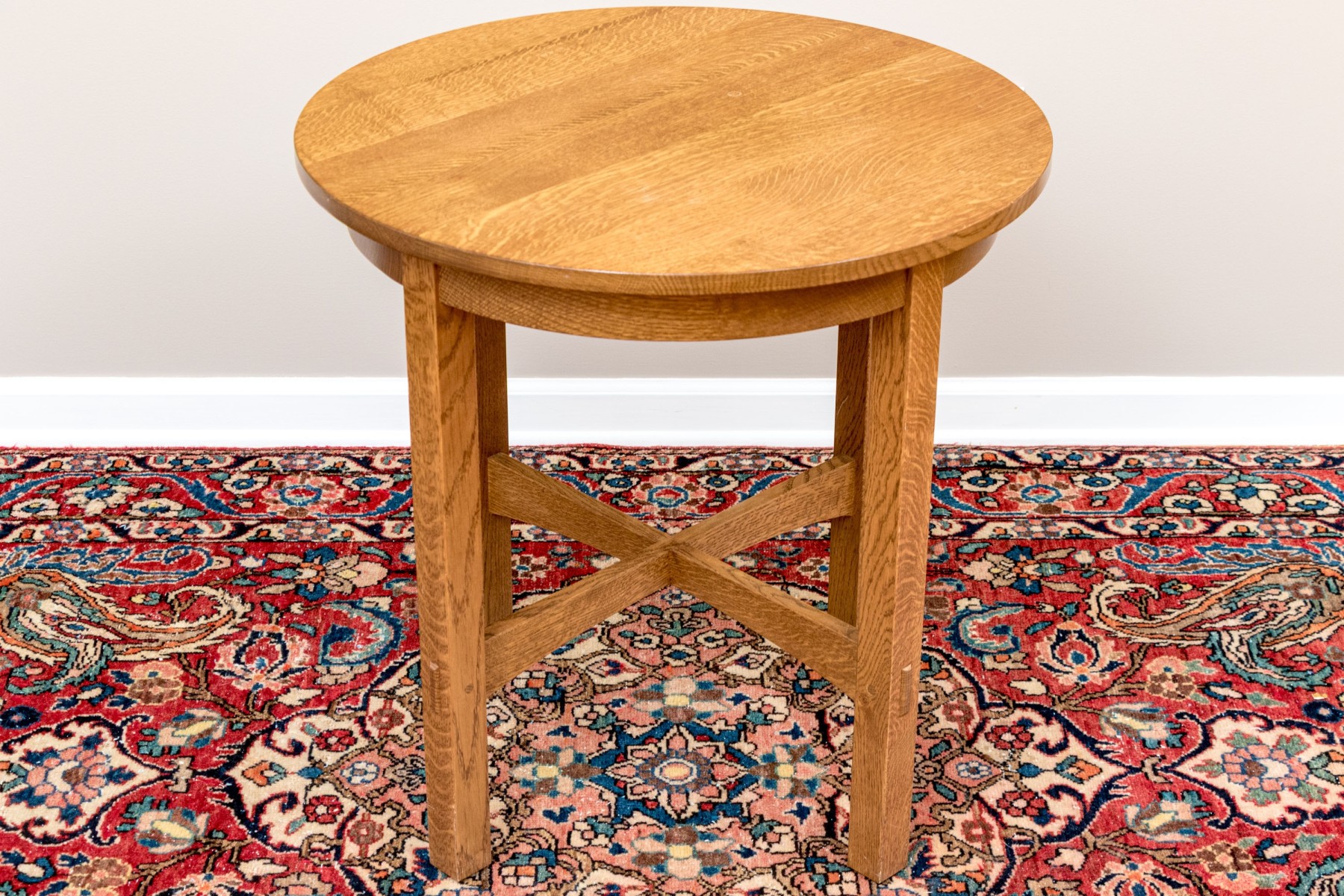 A high quality Stickley side table with a versatile, minimalist design well crafted in honeyed medium-light brown wood. The table sports a circular top and simple apron raised on straight legs with great wood grain and an X-stretcher with mortise and tenon joinery adding a handsome mission flair.