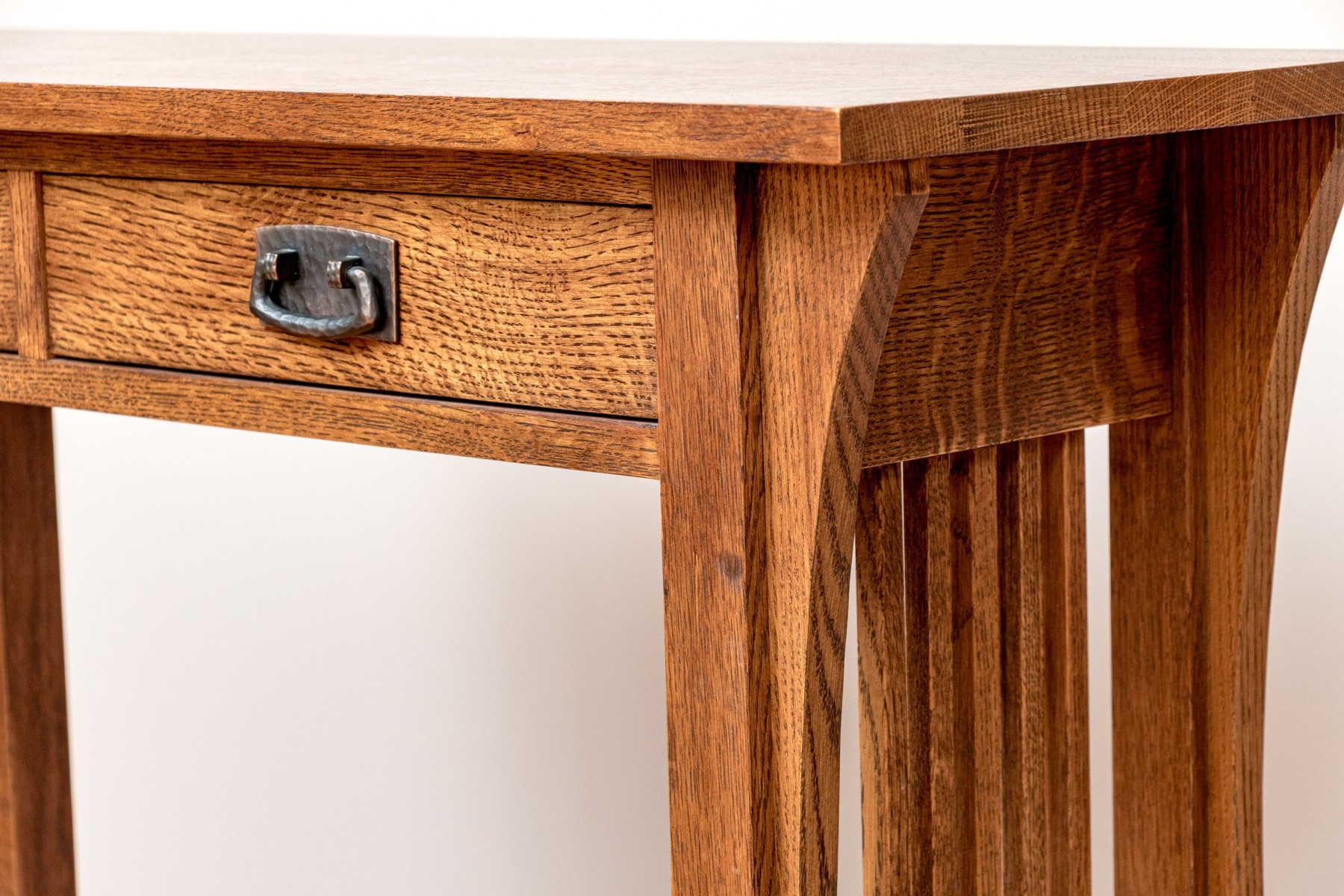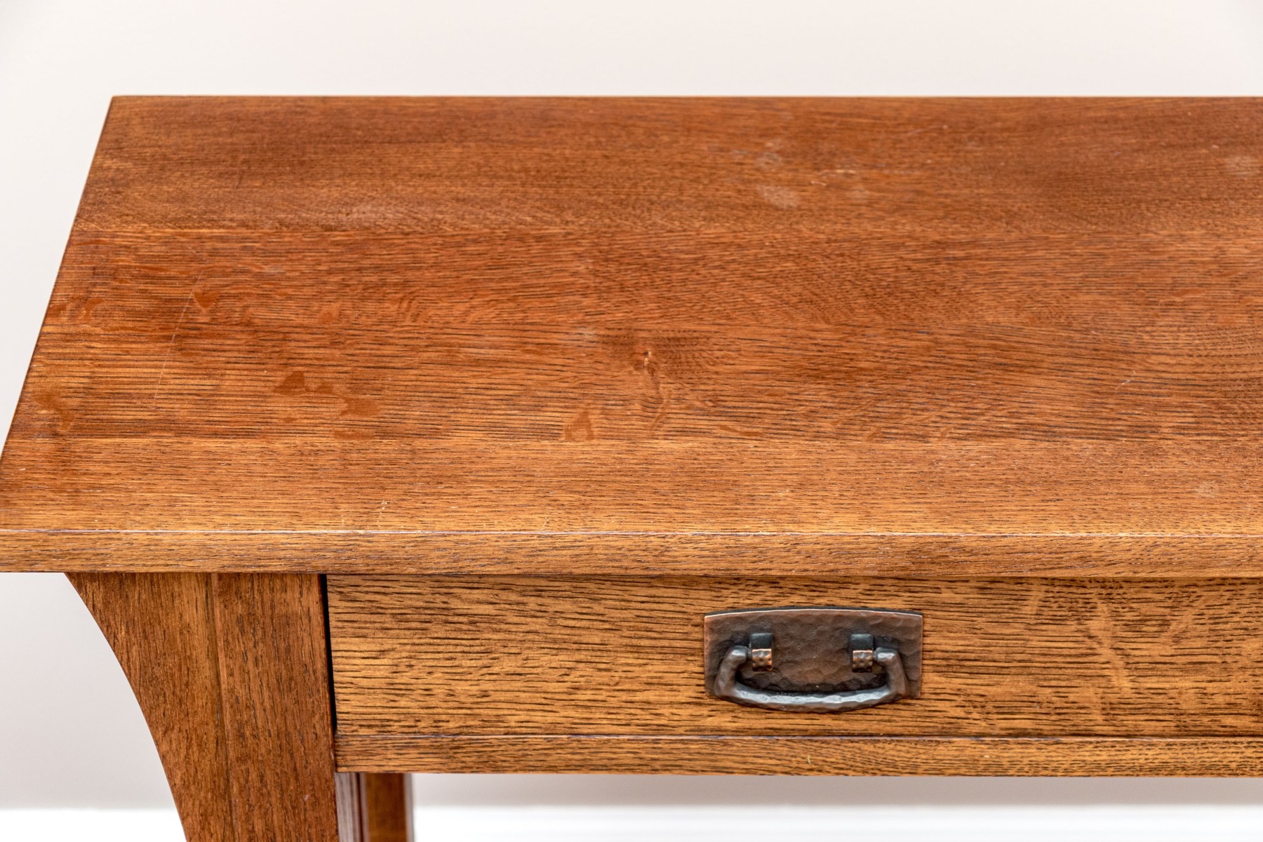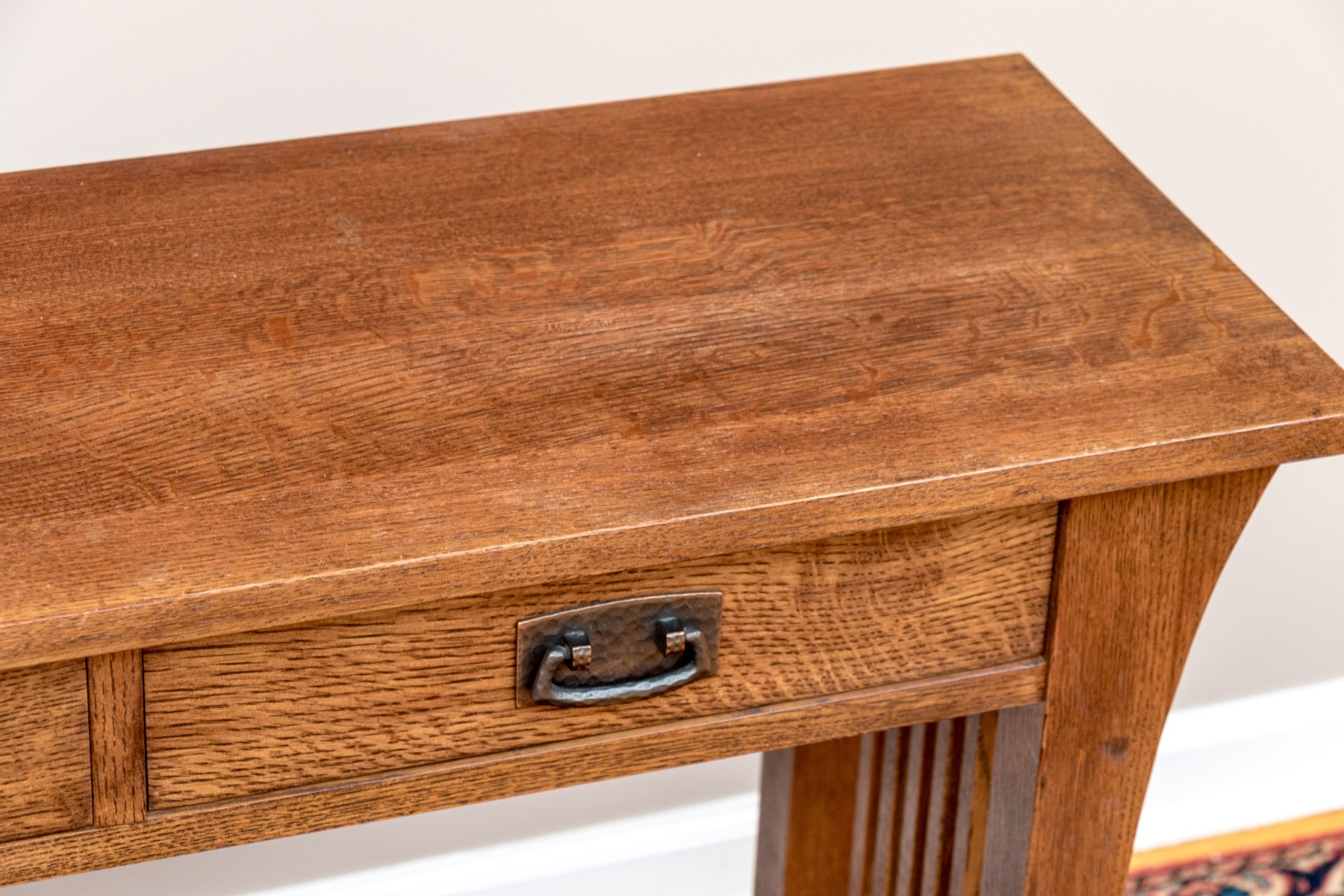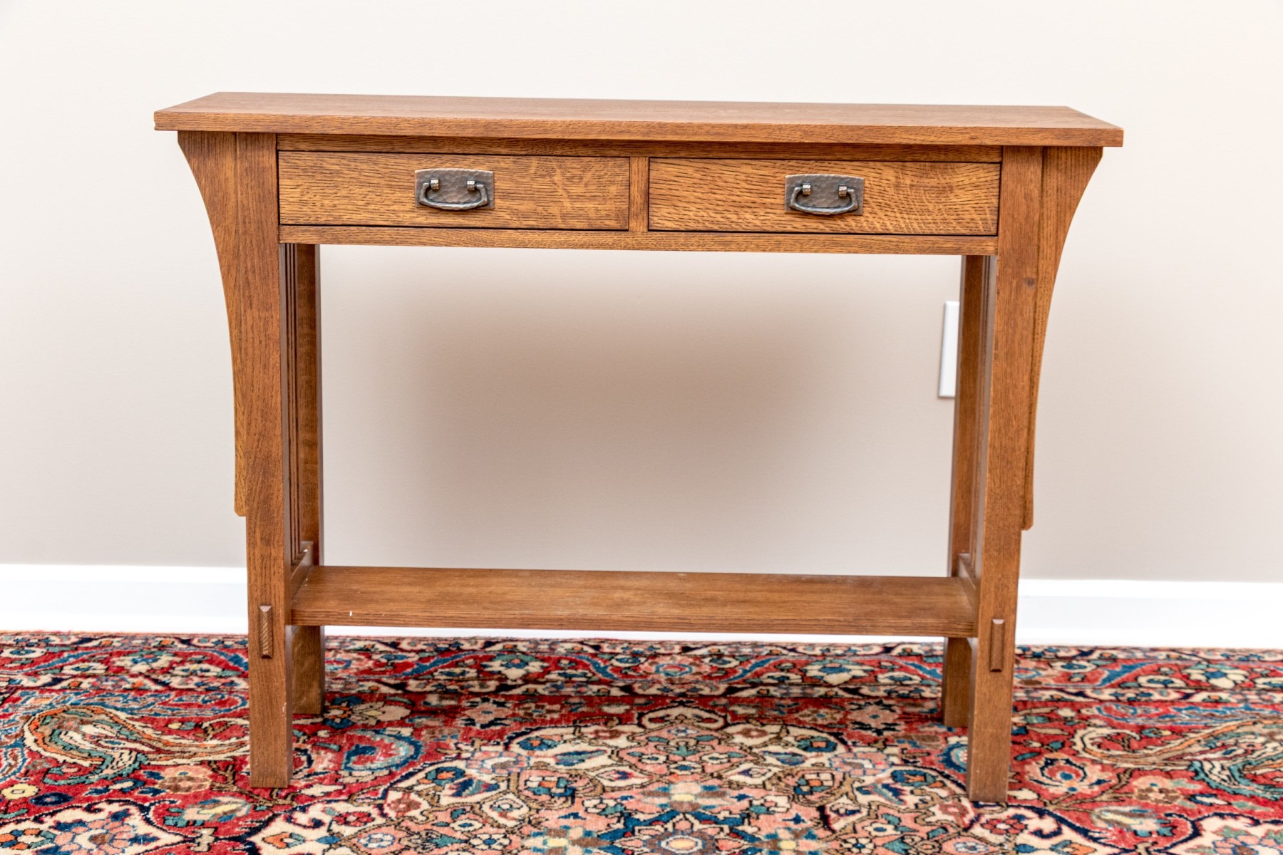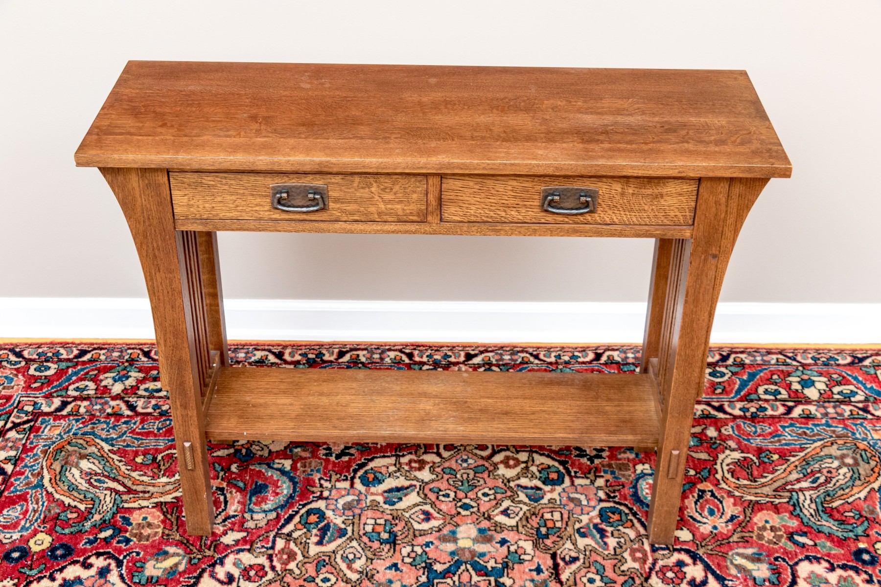 A high quality Stickley console table well crafted in warm-toned medium brown wood with excellent wood grain throughout, showcasing a rectangular top and a case of two drawers adorned with rustic gray metal bail handles on gently rounded rectangular plaques. Curved supports, rail sides, and mortise and tenon joinery supporting an open lower shelf contribute to a handsome mission style.