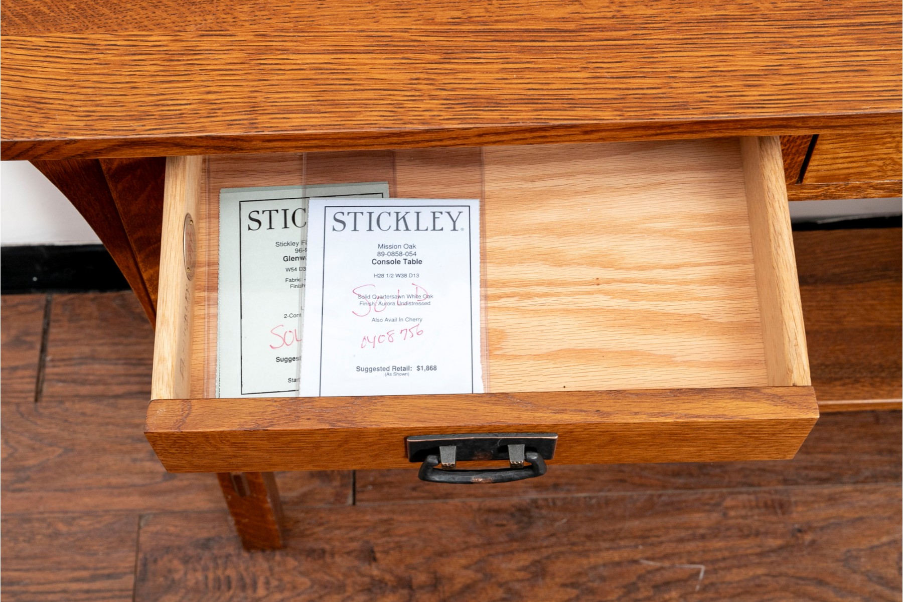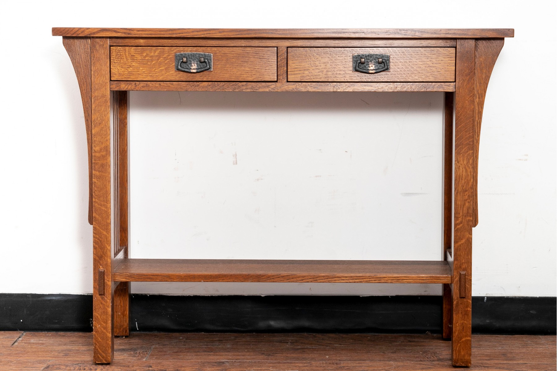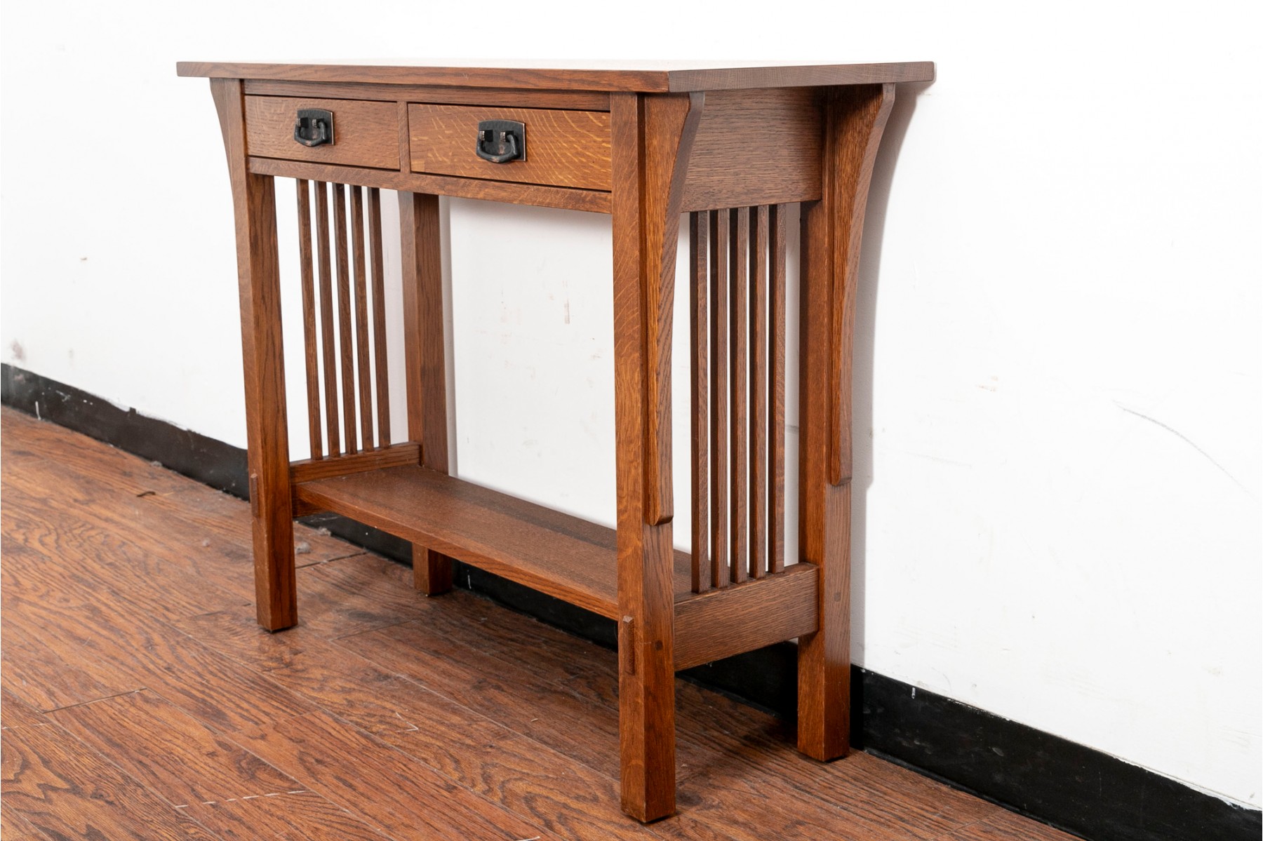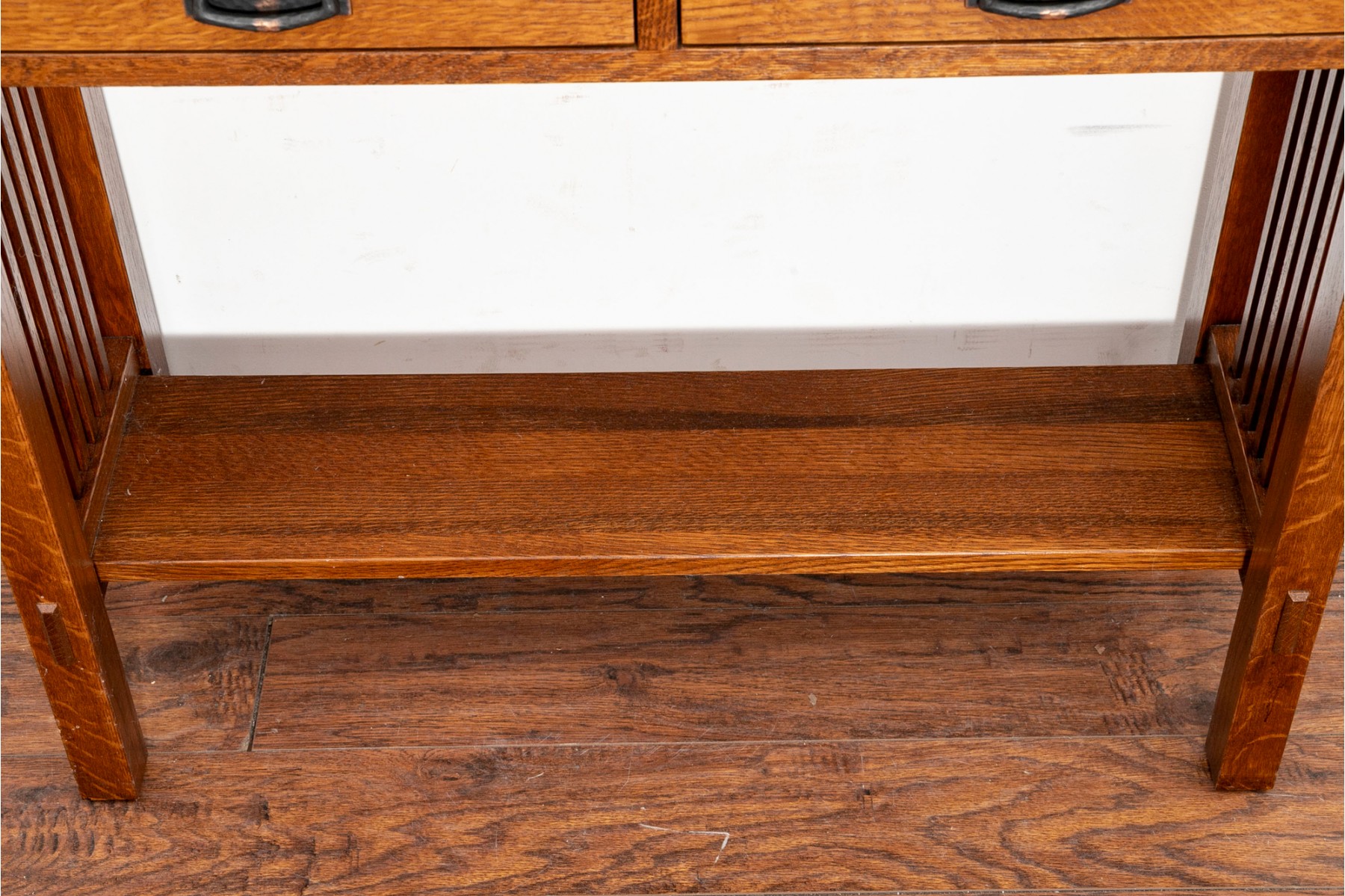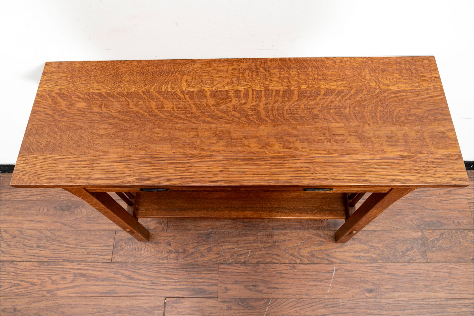 Stickley Mission "858" console table with a wonderful low-profile, simply elegant form in richly hued honeyed medium brown tiger oak. Features two drawers along tapering legs with slatted sides, leading to an open lower shelf flanked by tenon details.