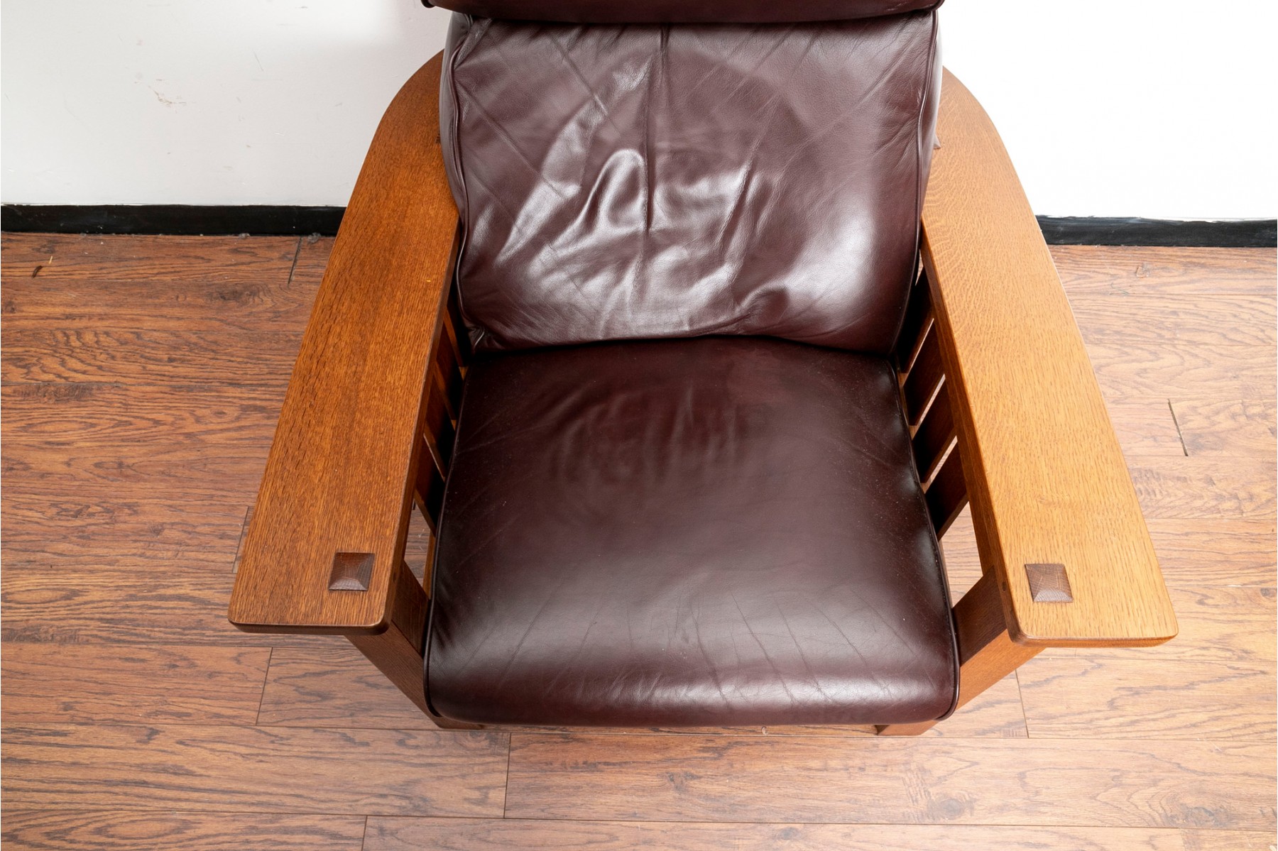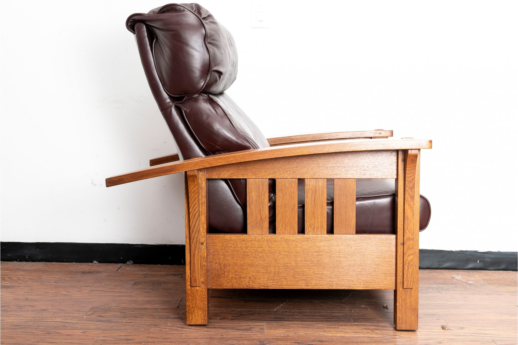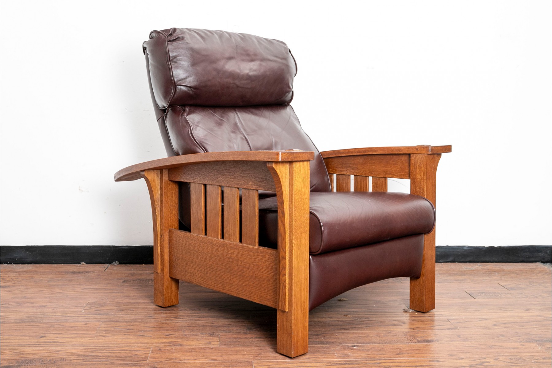 Stickley Morris Mission recliner in rich, burgundy-brown leather and honeyed medium brown oak, displaying gently bowed arms with tenon details over slatted sides.