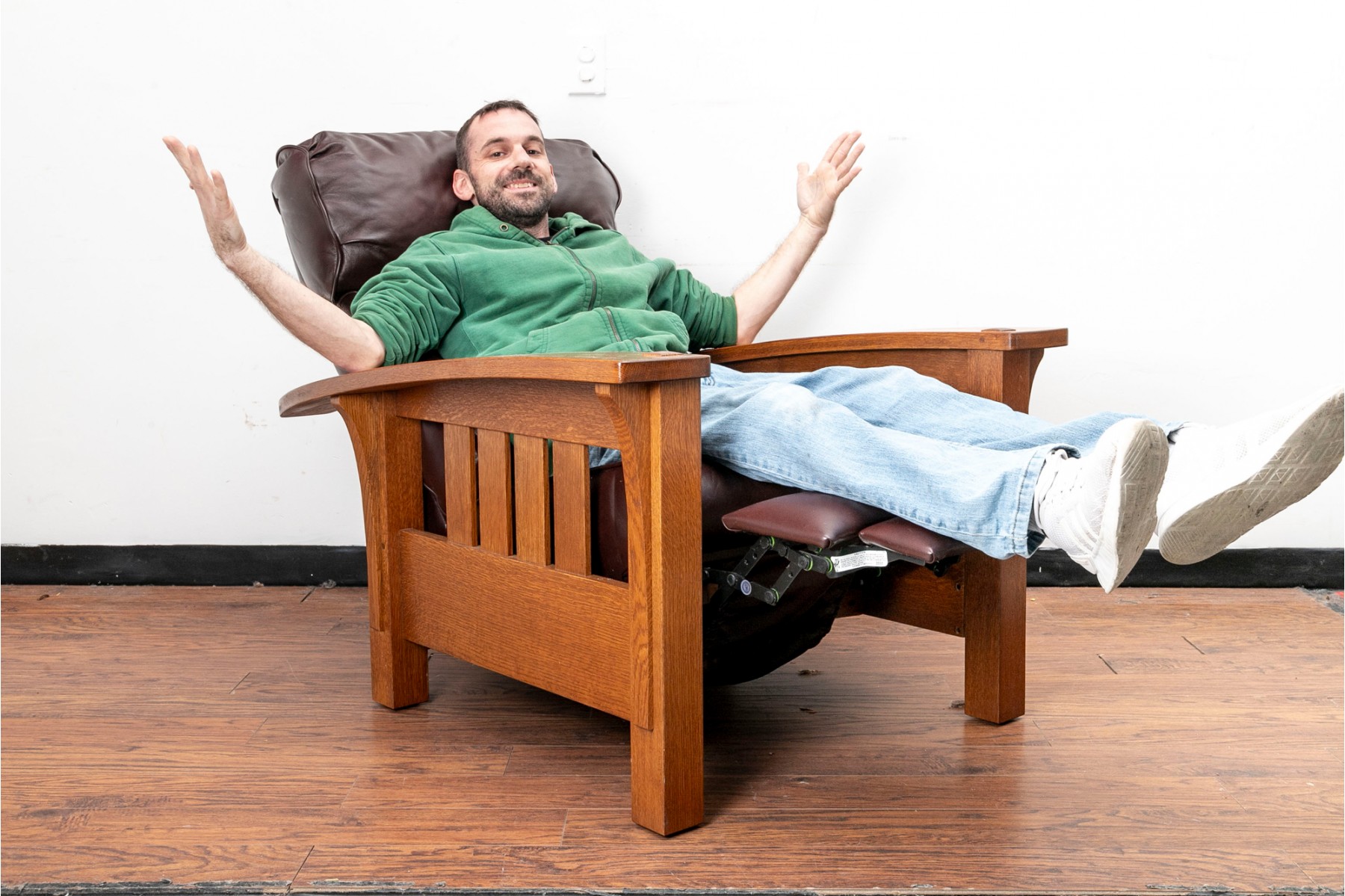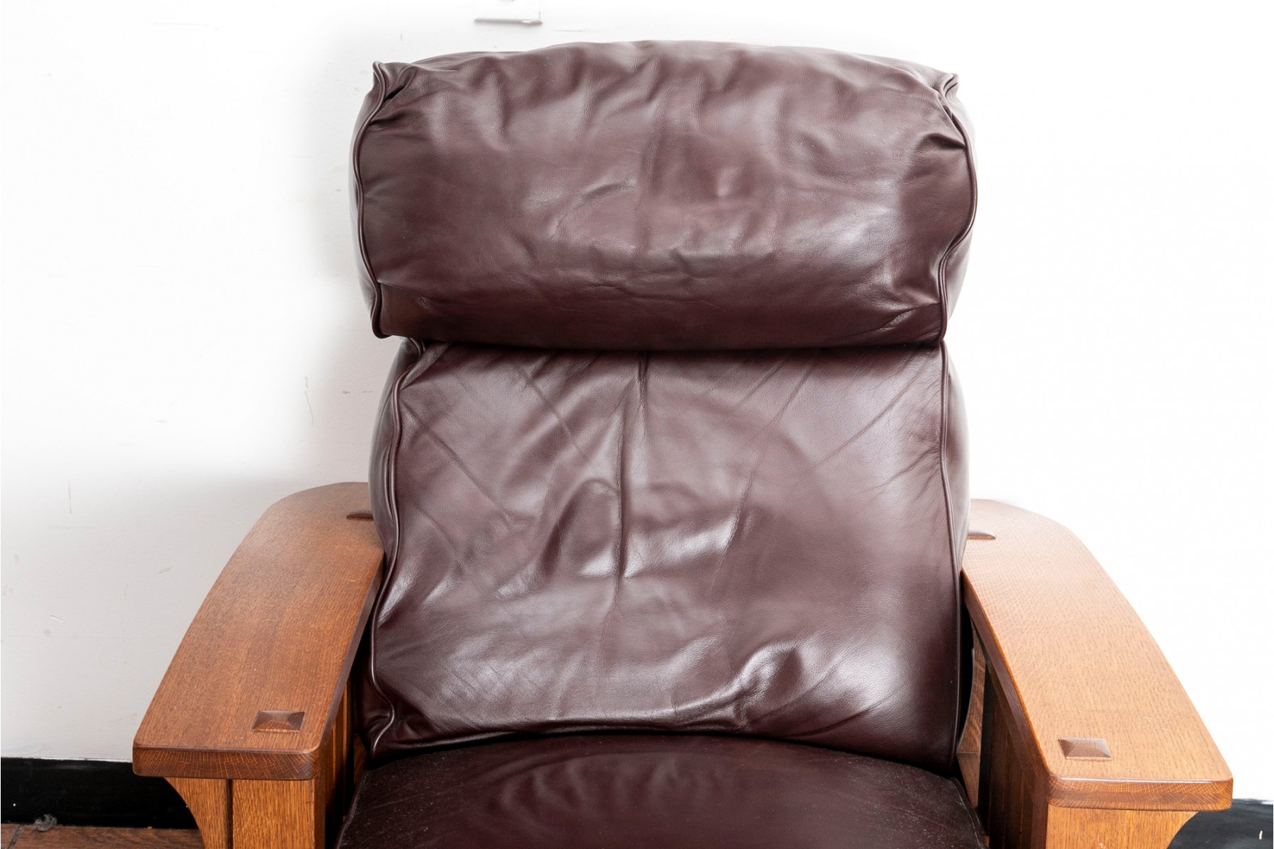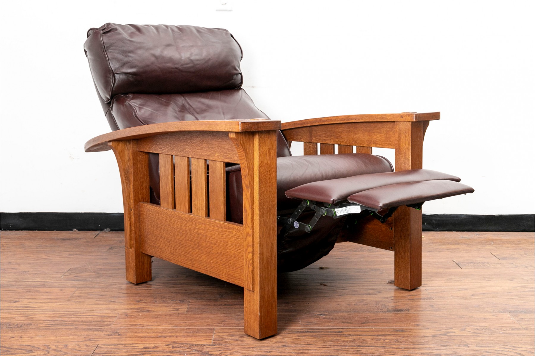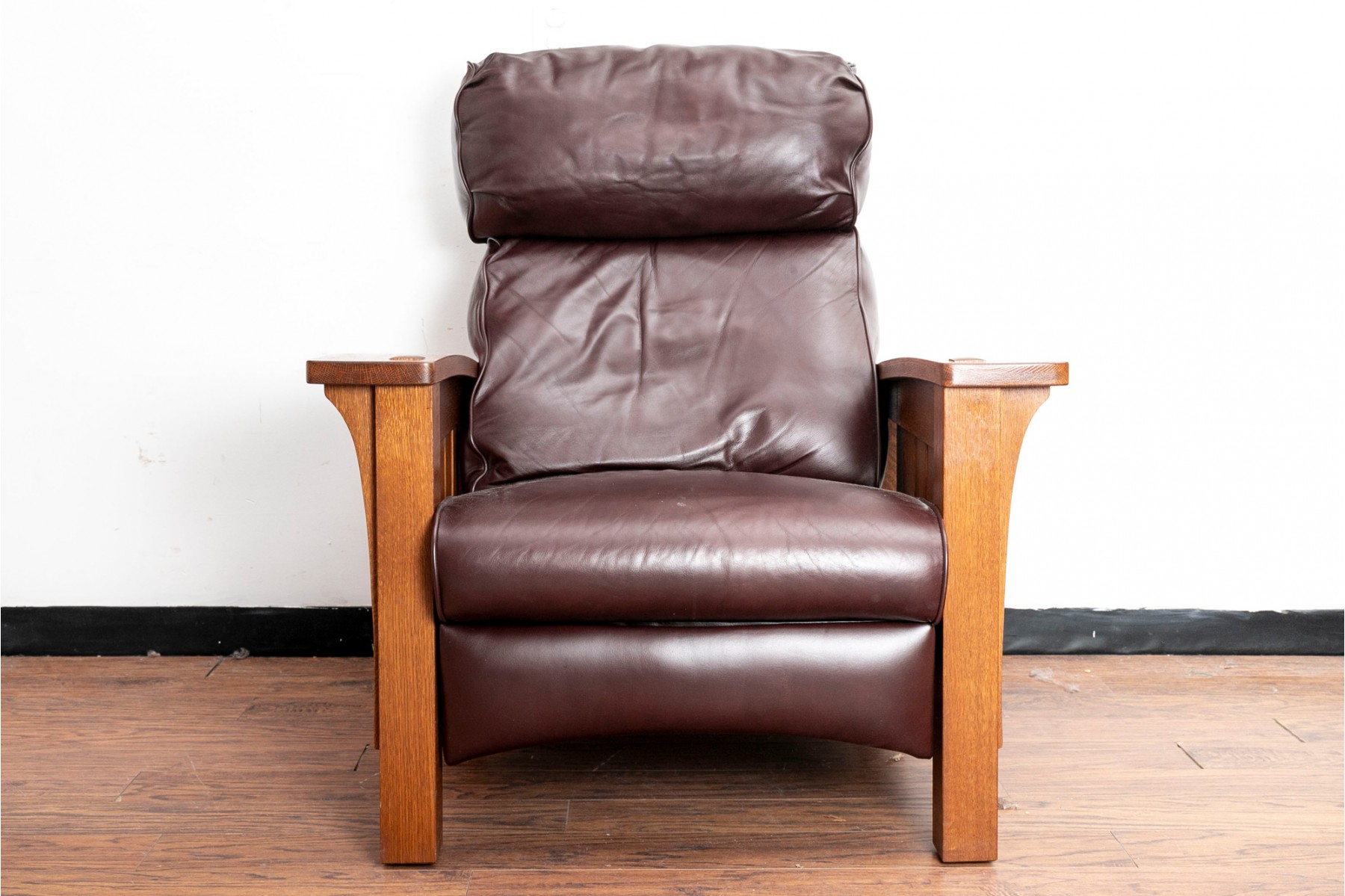 Stickley Morris Mission recliner in rich, burgundy-brown leather and honeyed medium brown oak, displaying gently bowed arms with tenon details over slatted sides.