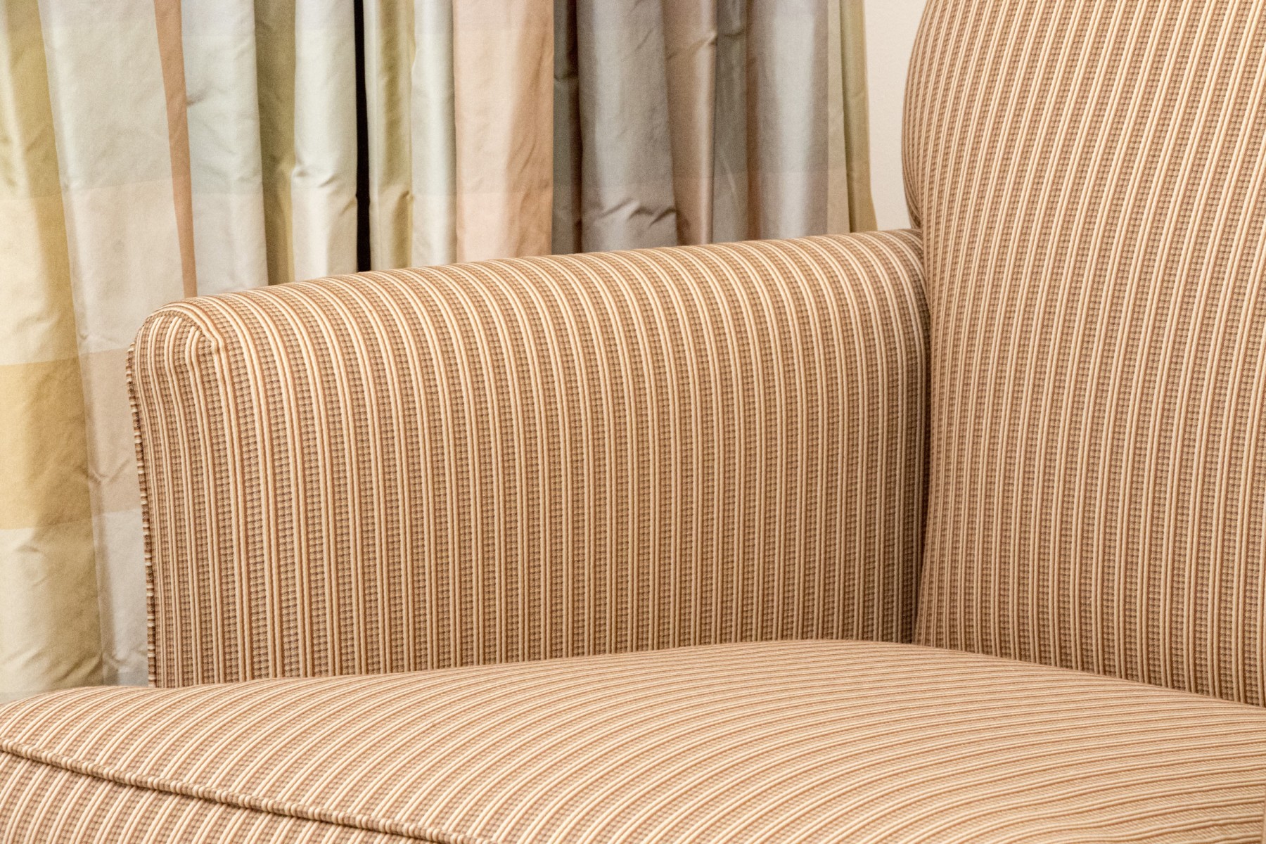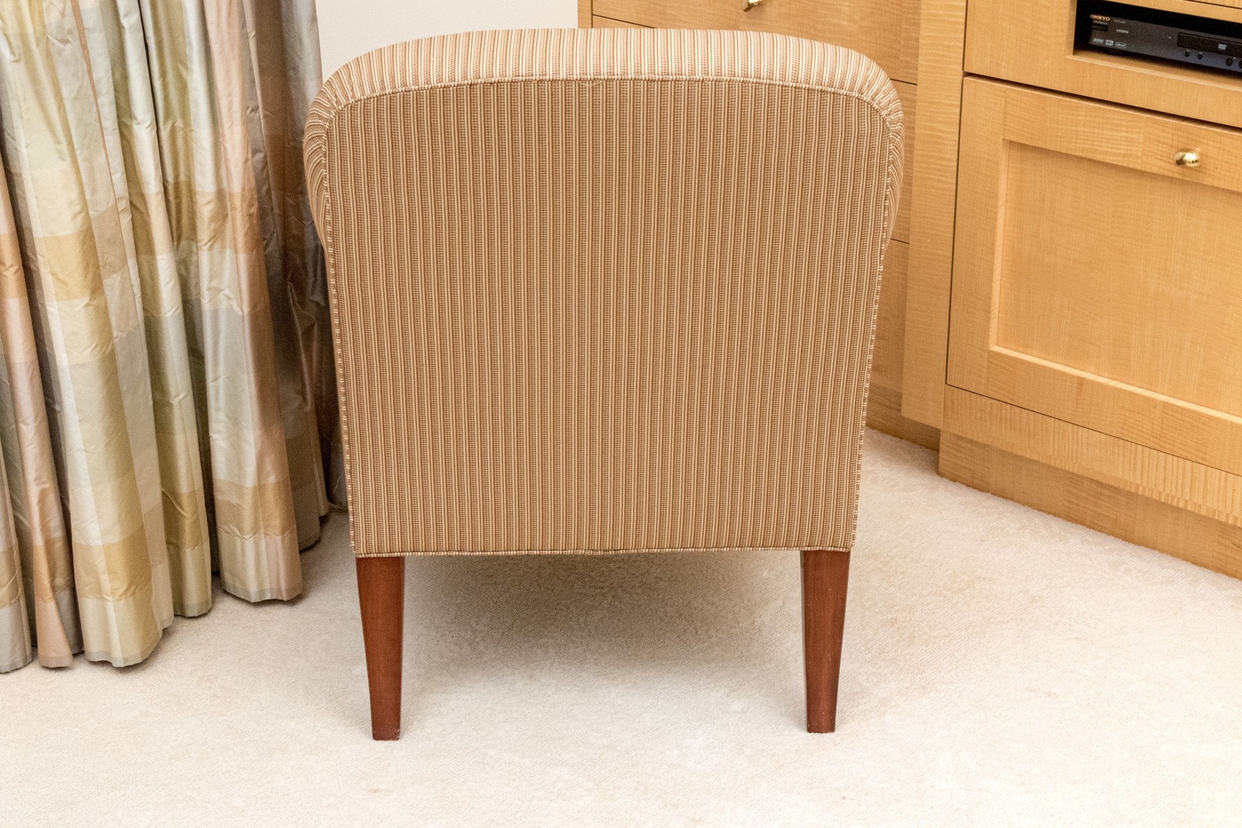 A wonderful Stickley armchair with a versatile, elegant form. Features a rounded back and gently flared arms flanking a loose cushion raised on medium brown curved legs. Upholstered in a lovely beige-brown, cream, and red-brown striped fabric. Manufacturer's label under the cushion.