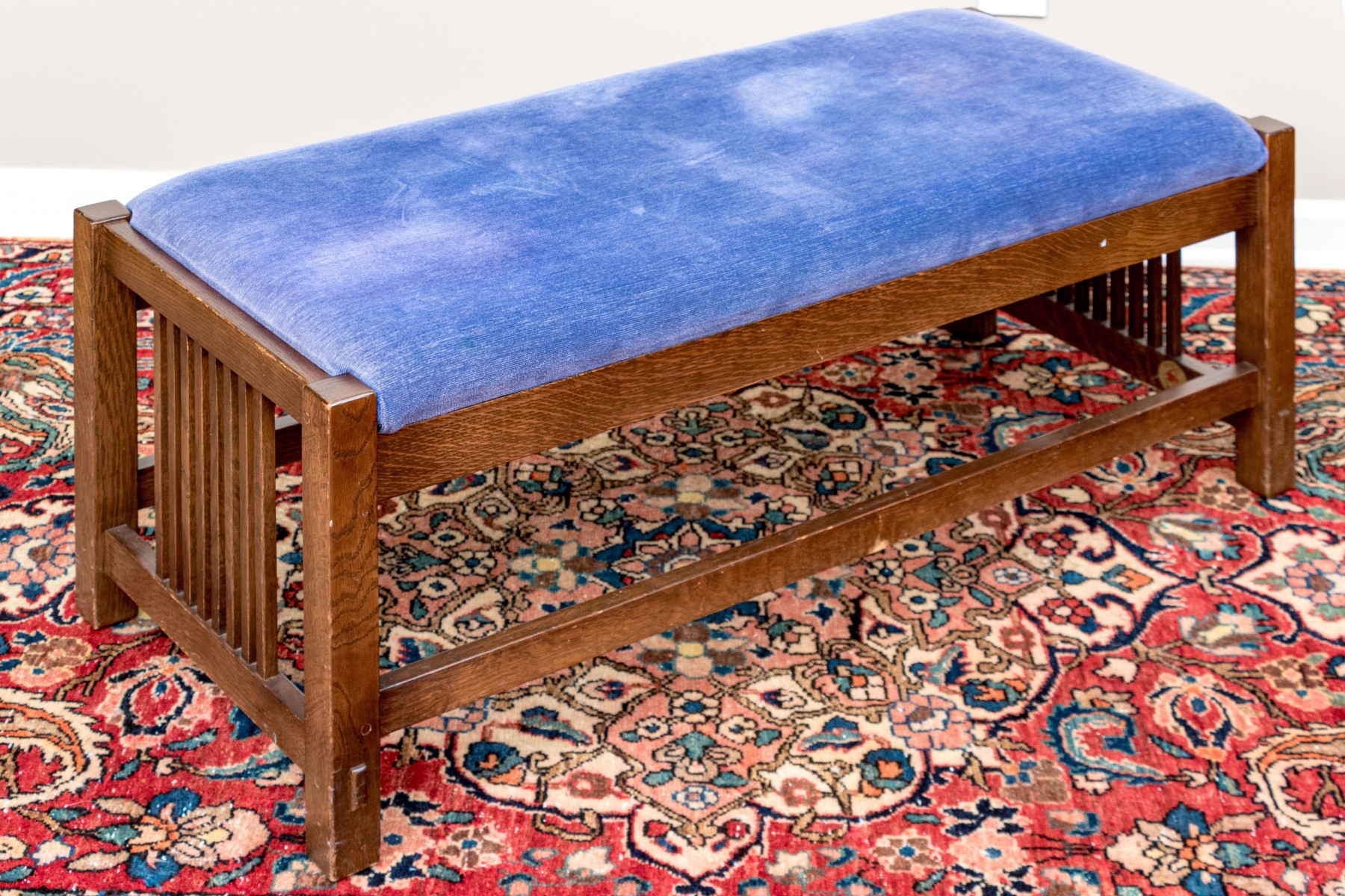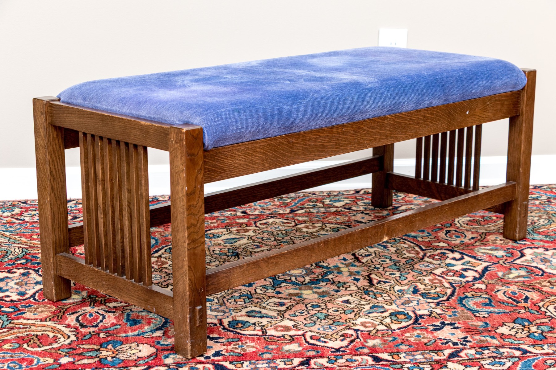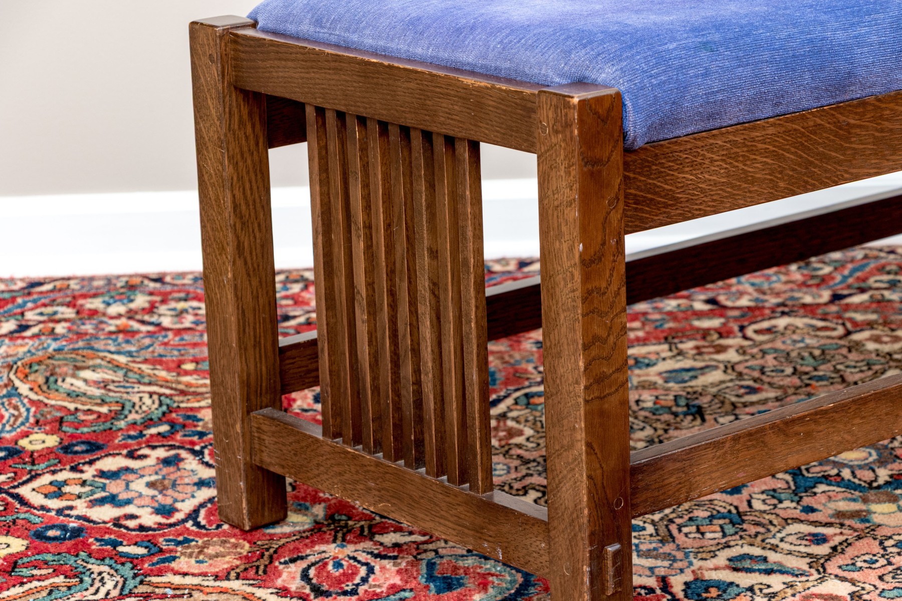 A high quality Stickley bench with great mission appeal, well crafted in warm-toned medium brown wood with great wood grain throughout. Made comfortable with a cornflower blue upholstered cushion and supported by a handsome rectangular frame with slatted sides and mortise and tenon joinery around the box stretcher.