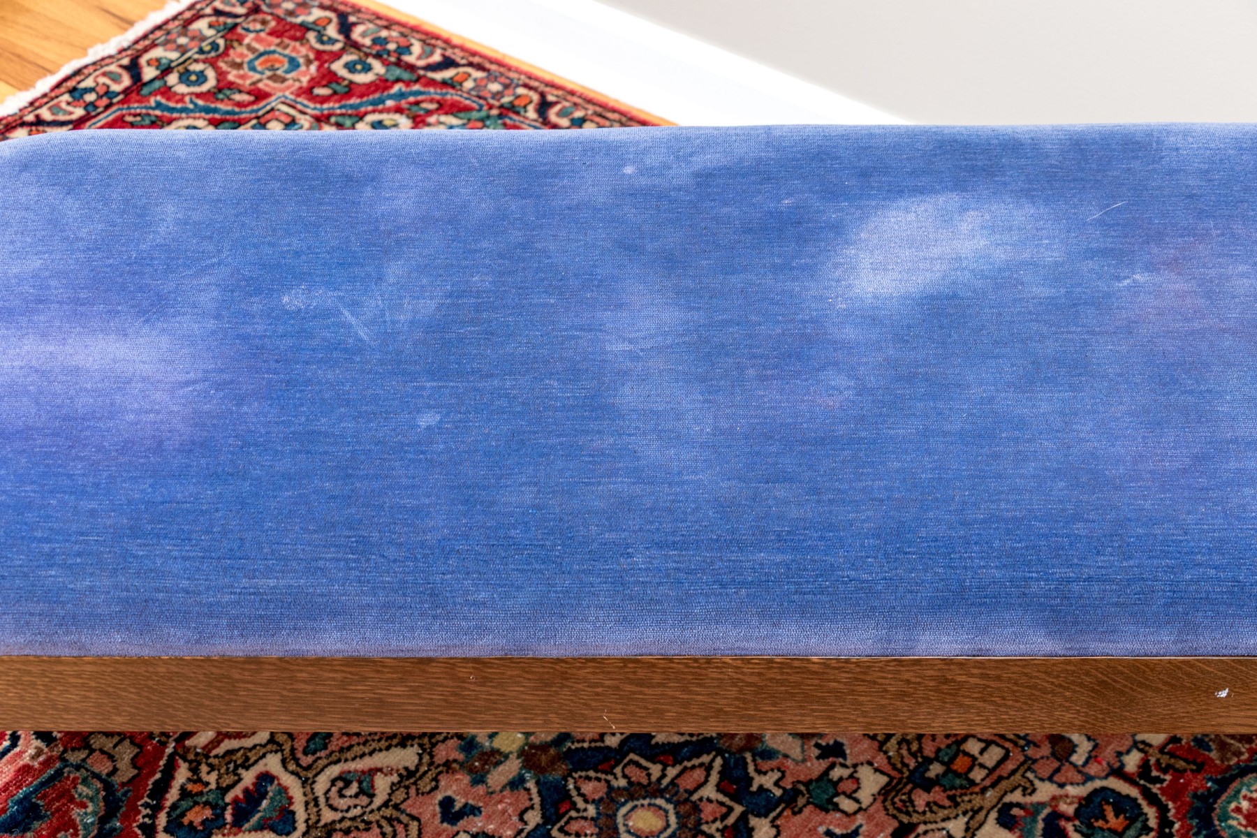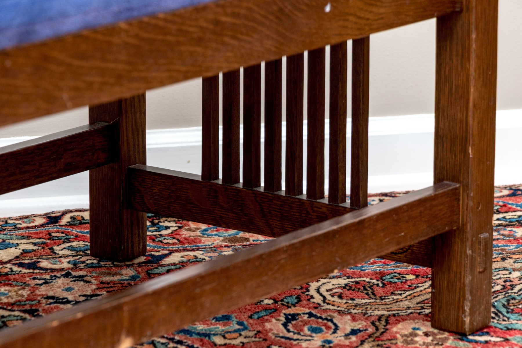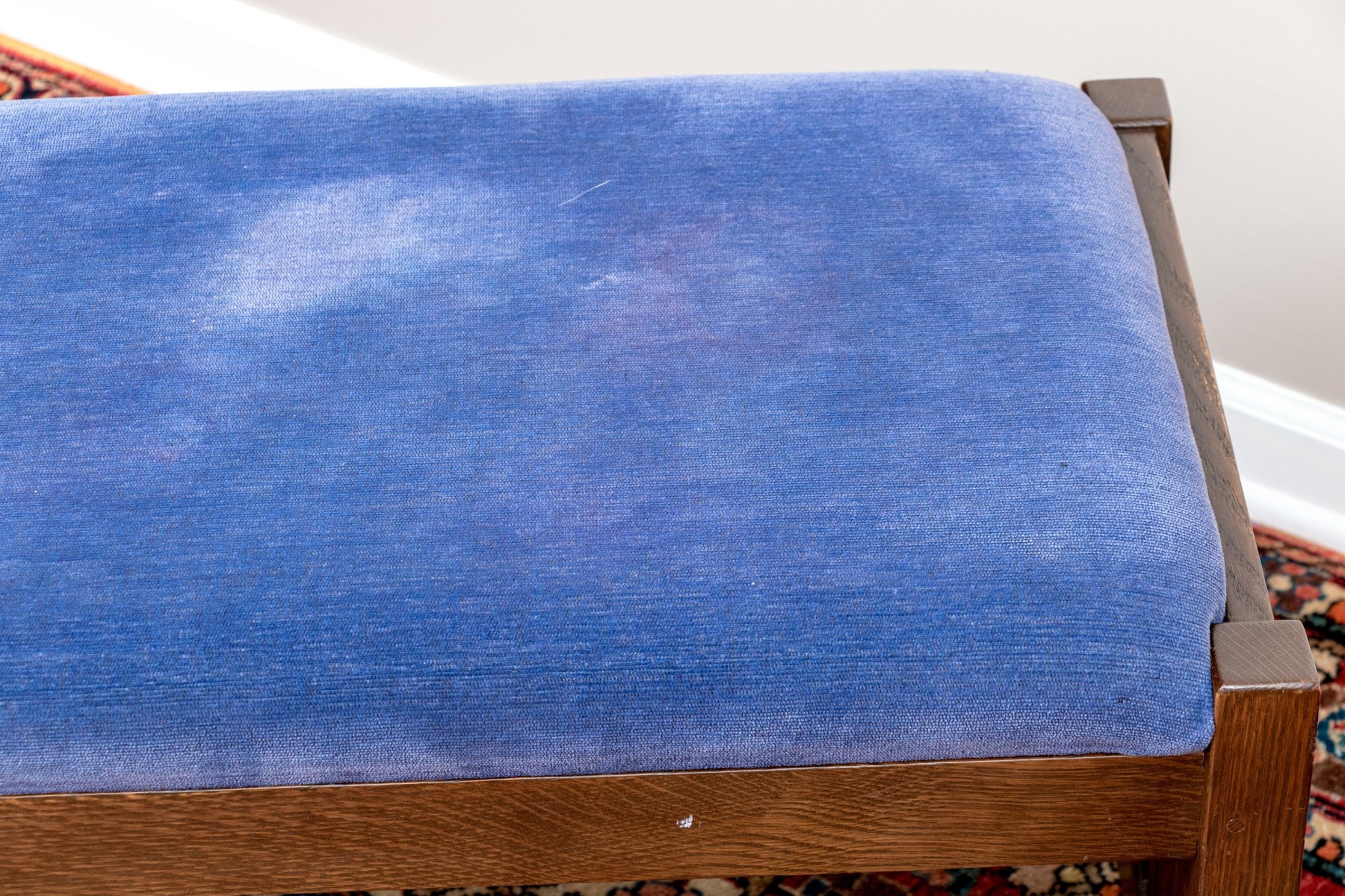 A high quality Stickley bench with great mission appeal, well crafted in warm-toned medium brown wood with great wood grain throughout. Made comfortable with a cornflower blue upholstered cushion and supported by a handsome rectangular frame with slatted sides and mortise and tenon joinery around the box stretcher.