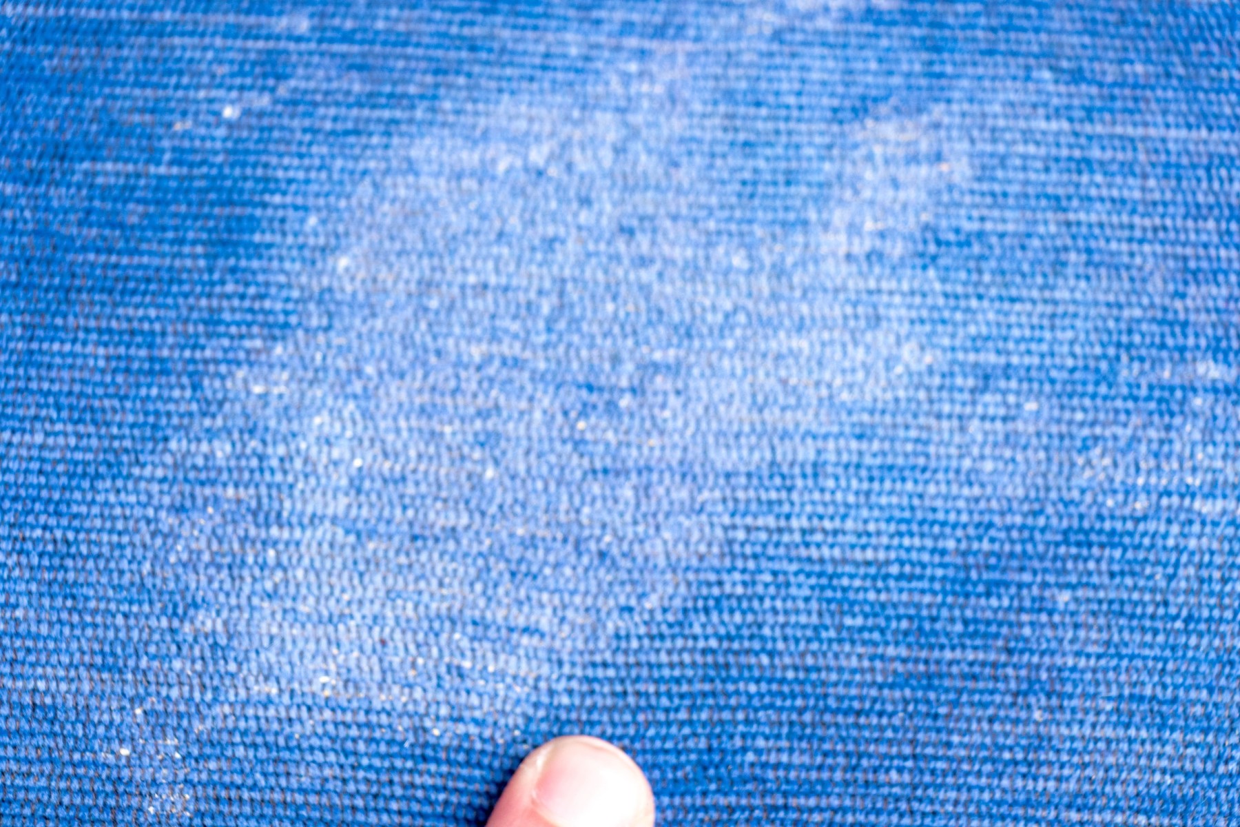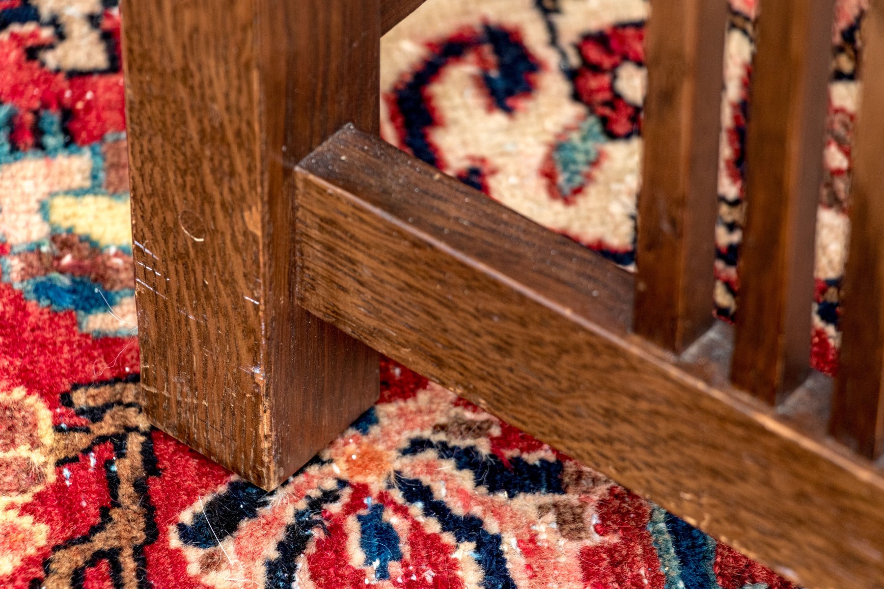 A stained spot that appears to have been cleaned to the cushion. A blemish with loss of finish to the center of one of the long stretcher supports but overall in good form and presents very well.