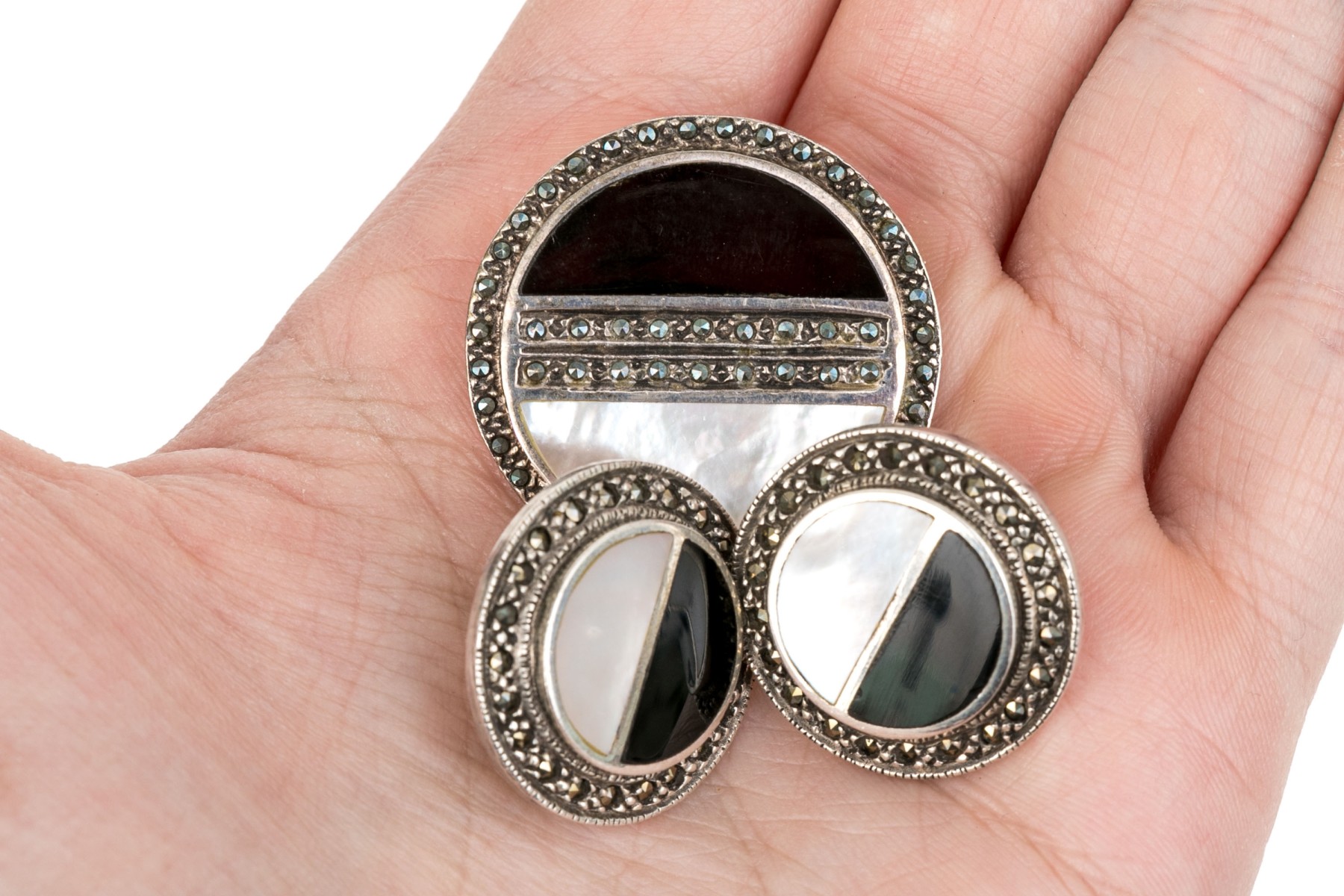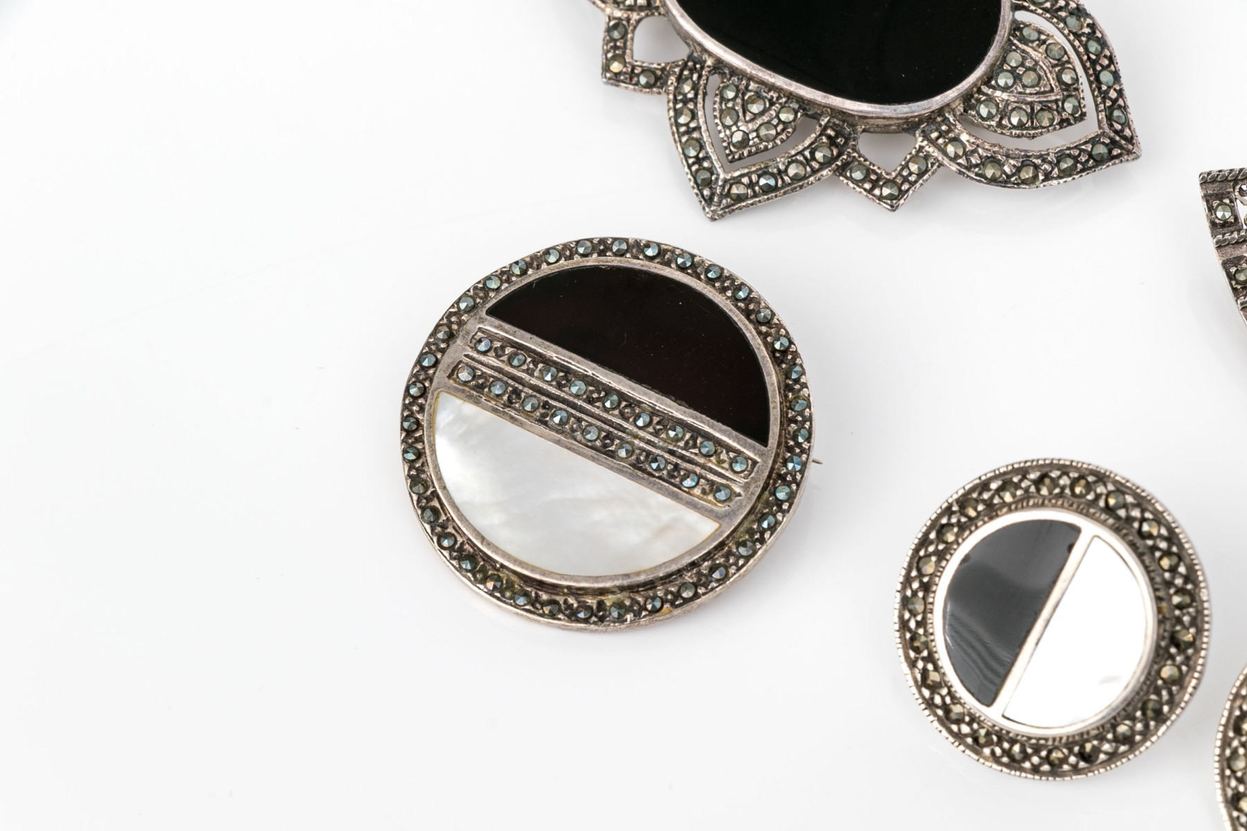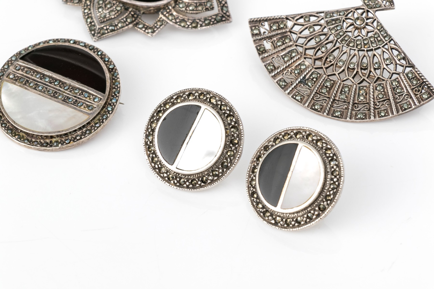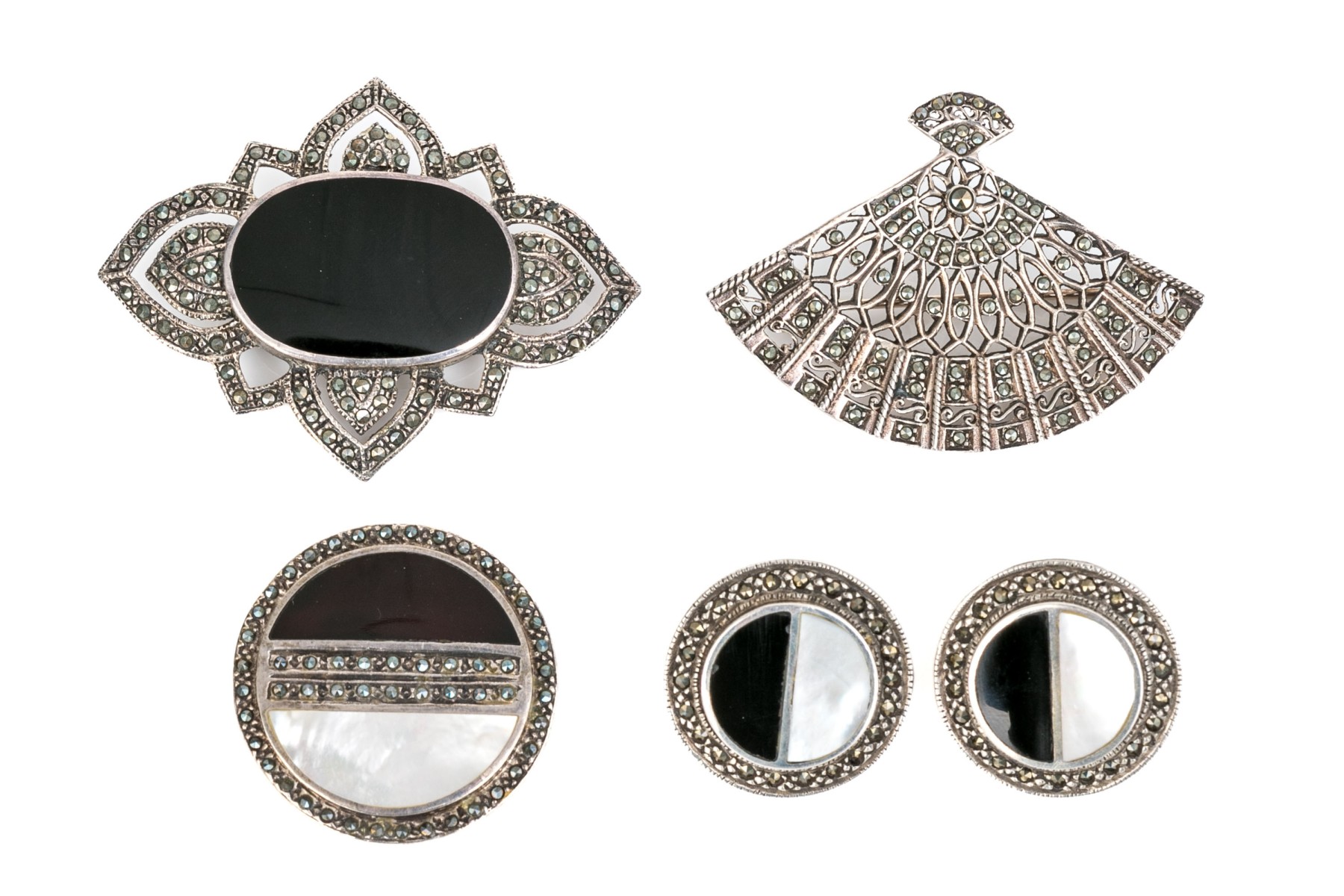 Striking collection of sterling silver and marcasite jewelry pieces, including onyx and mother-of-pearl matching brooch and earrings