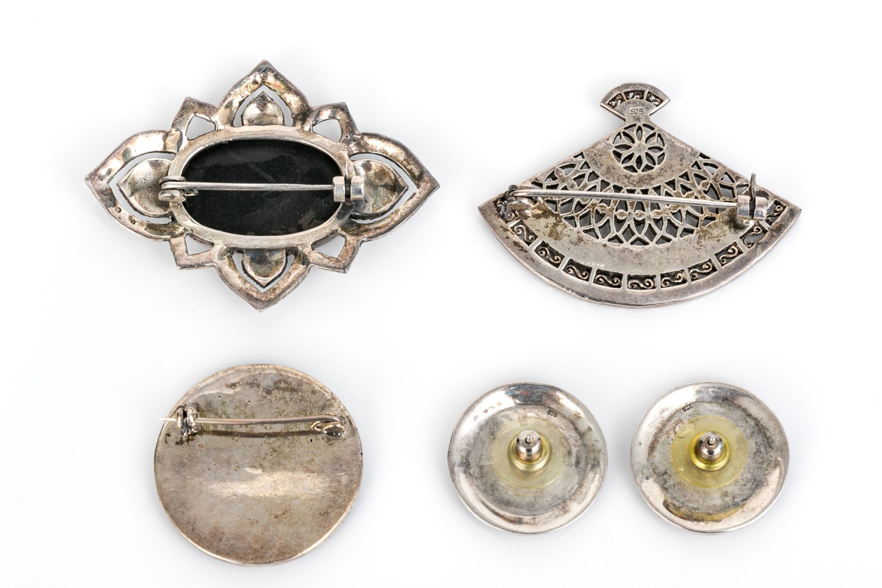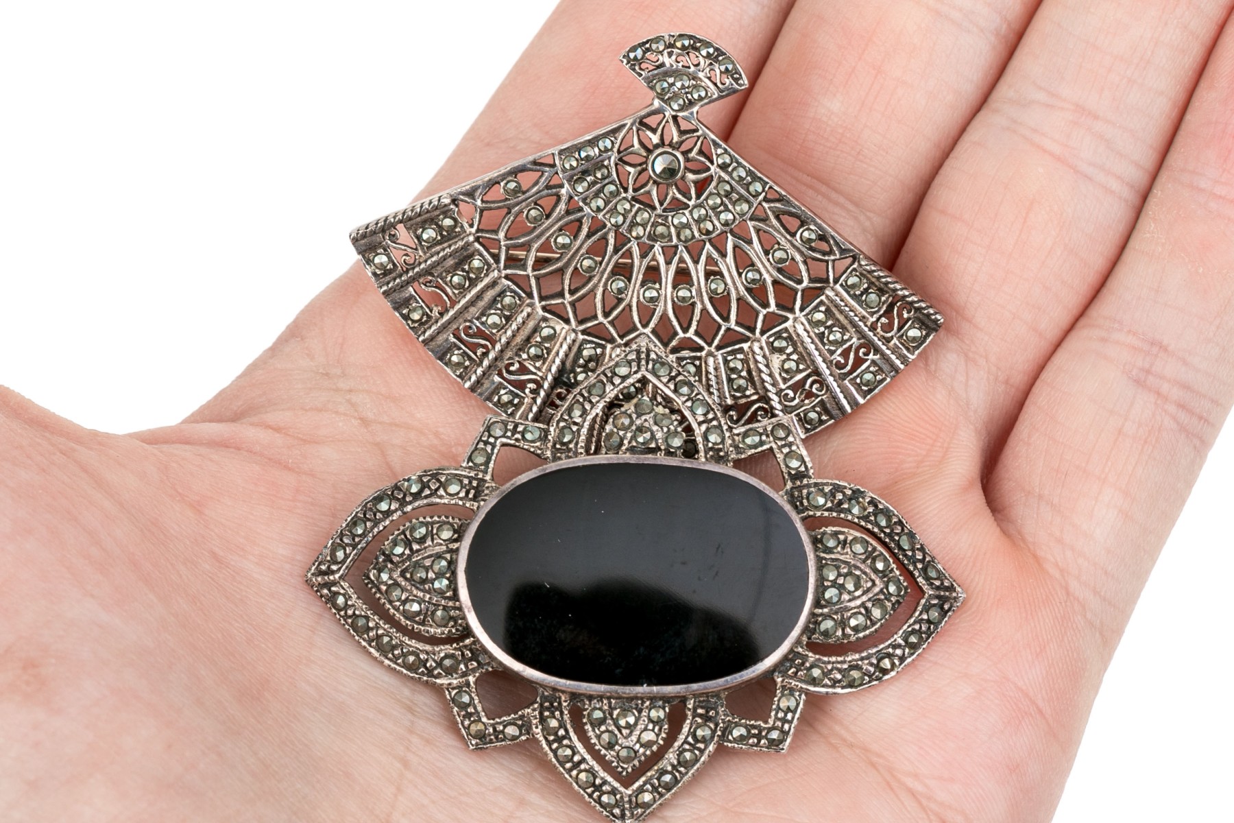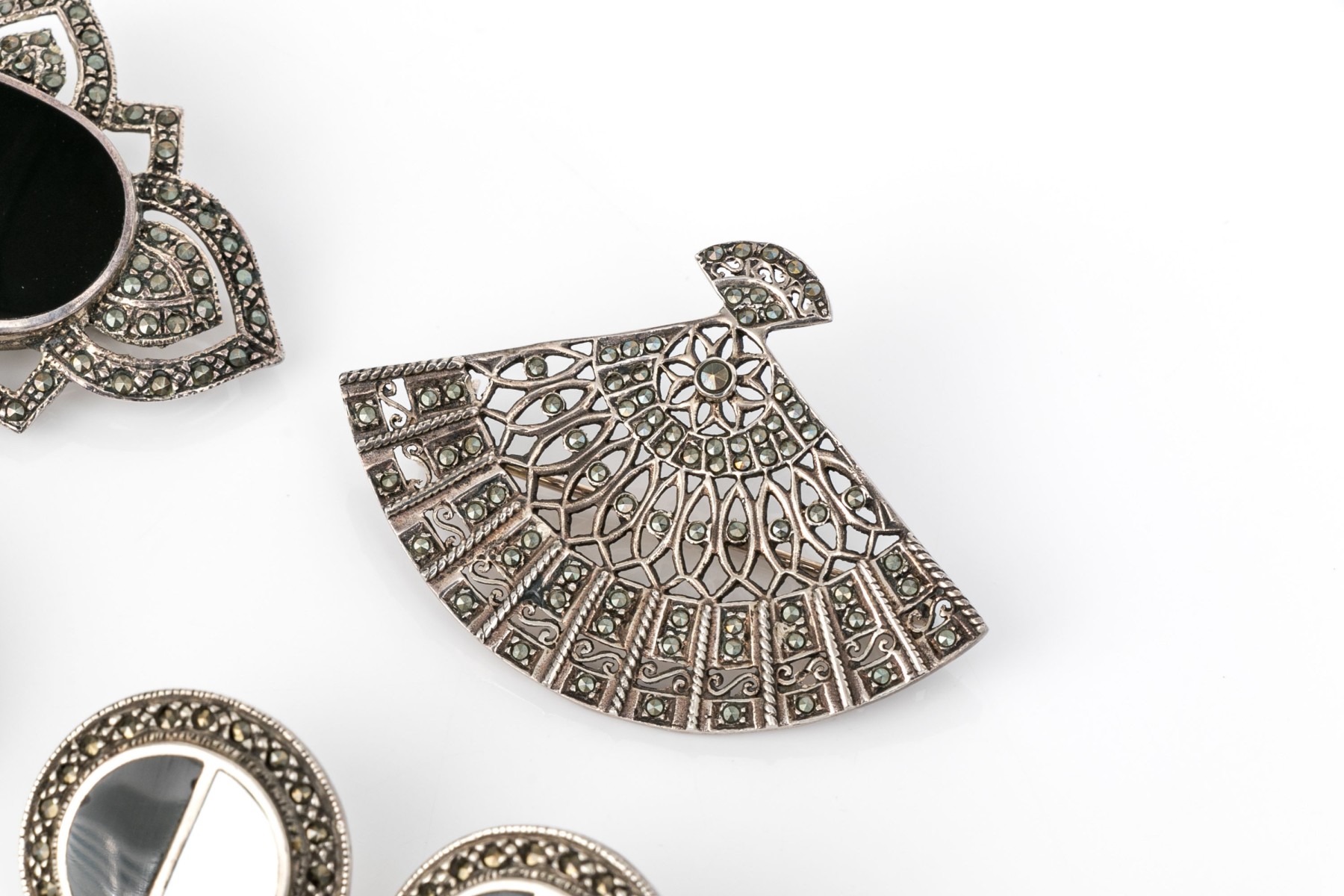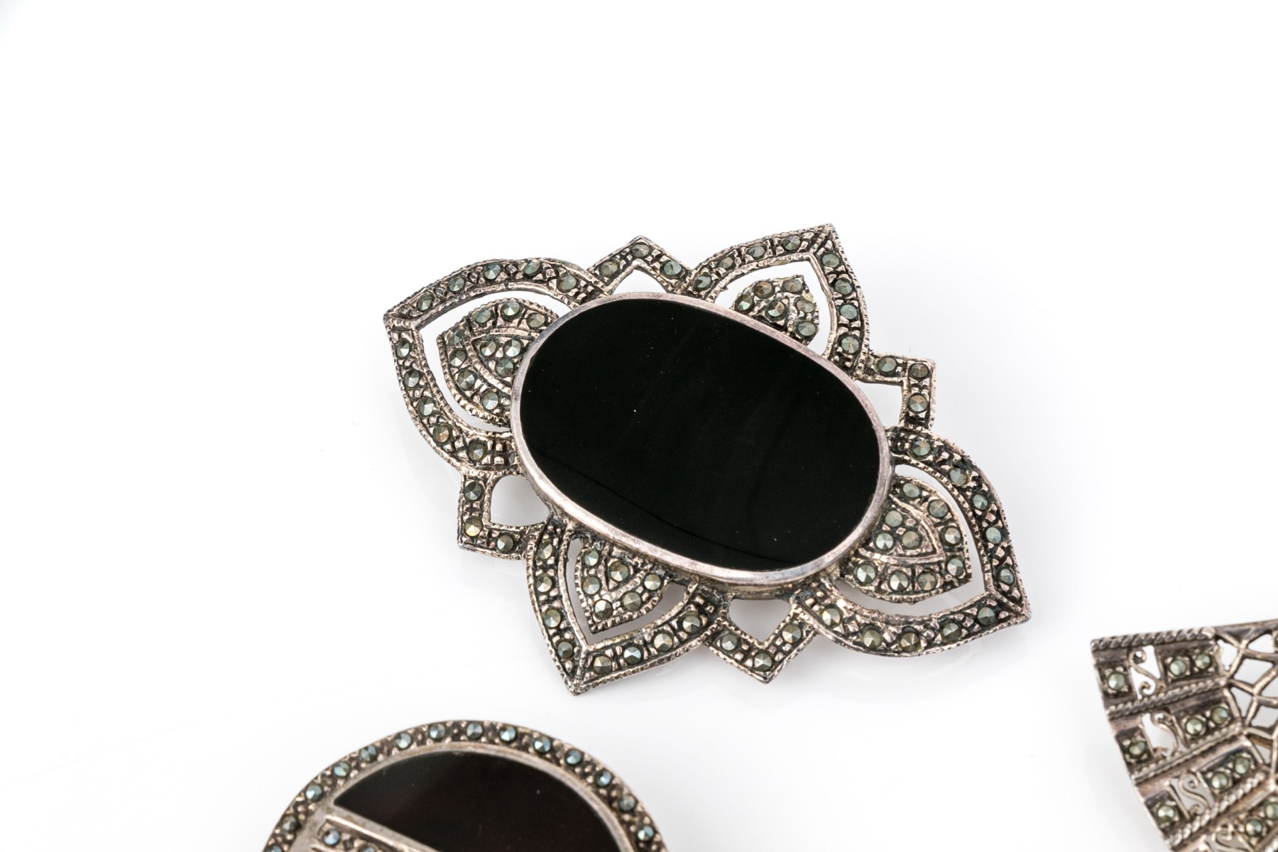 Striking collection of sterling silver and marcasite jewelry pieces, including onyx and mother-of-pearl matching brooch and earrings