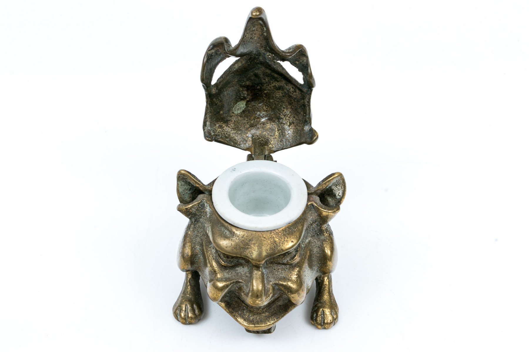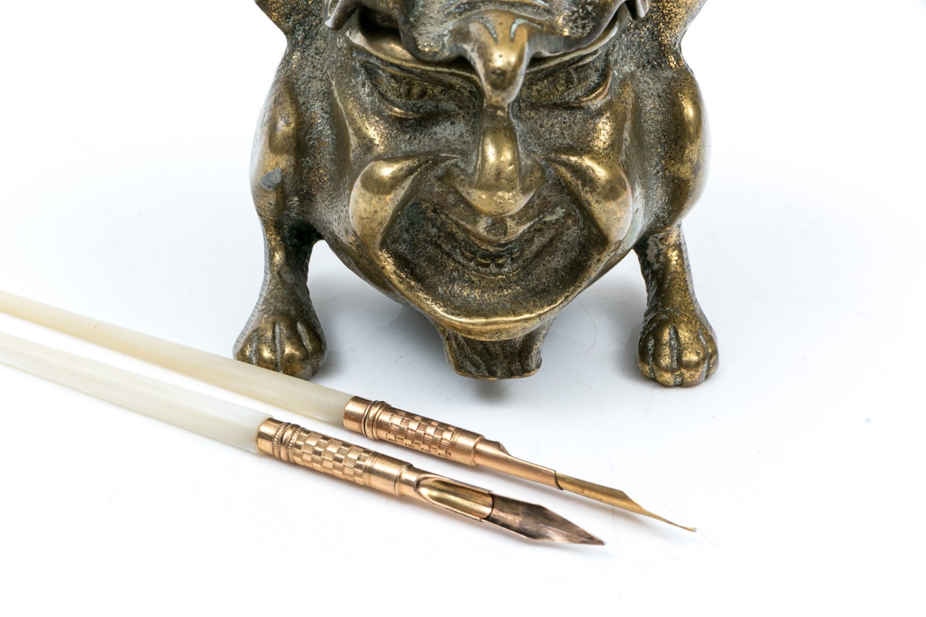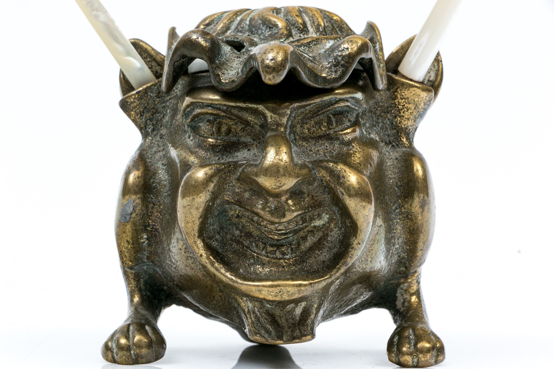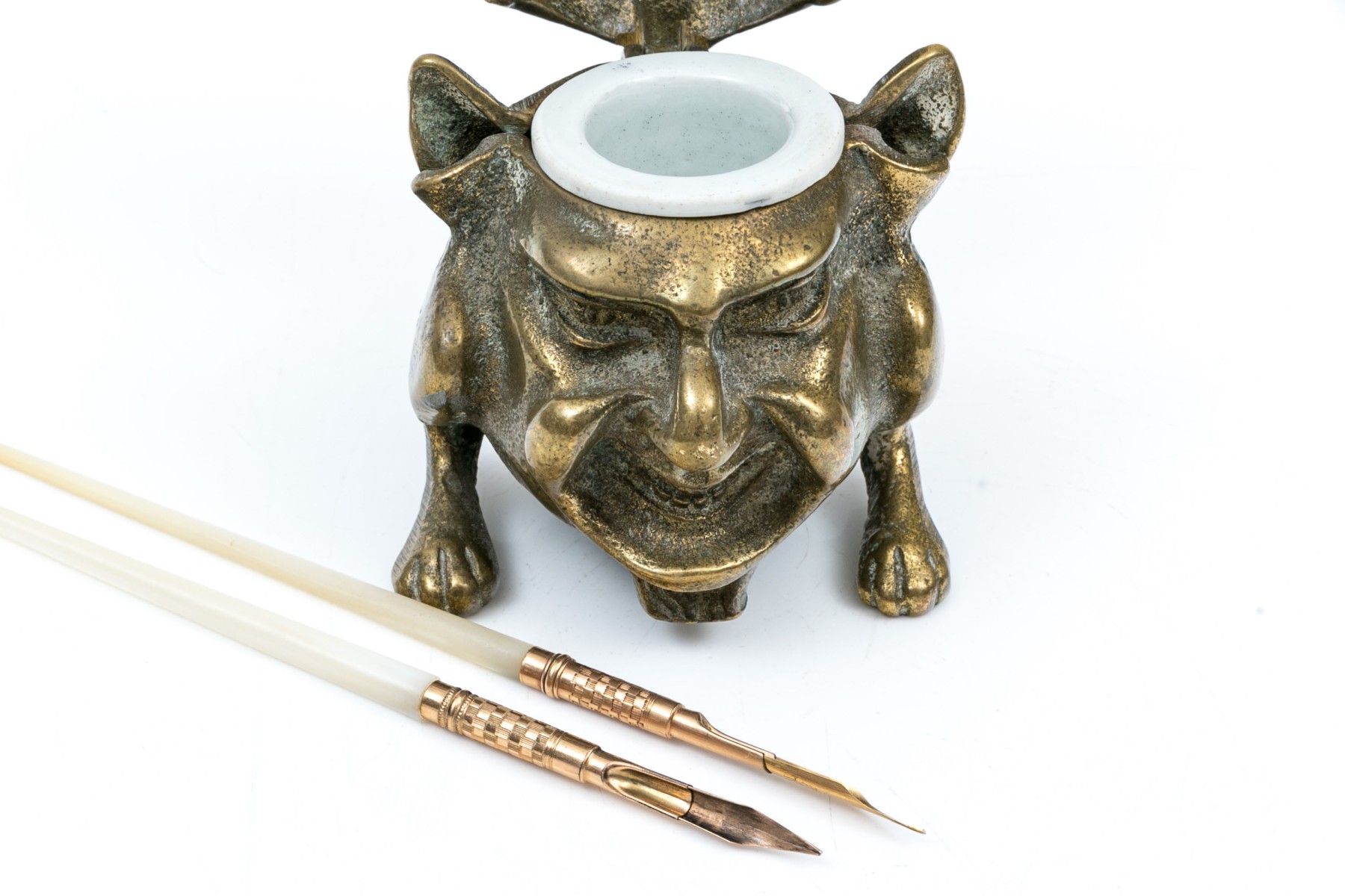 Striking groteque form spelter inkwell, with complementary mother-of-pearl writing instruments