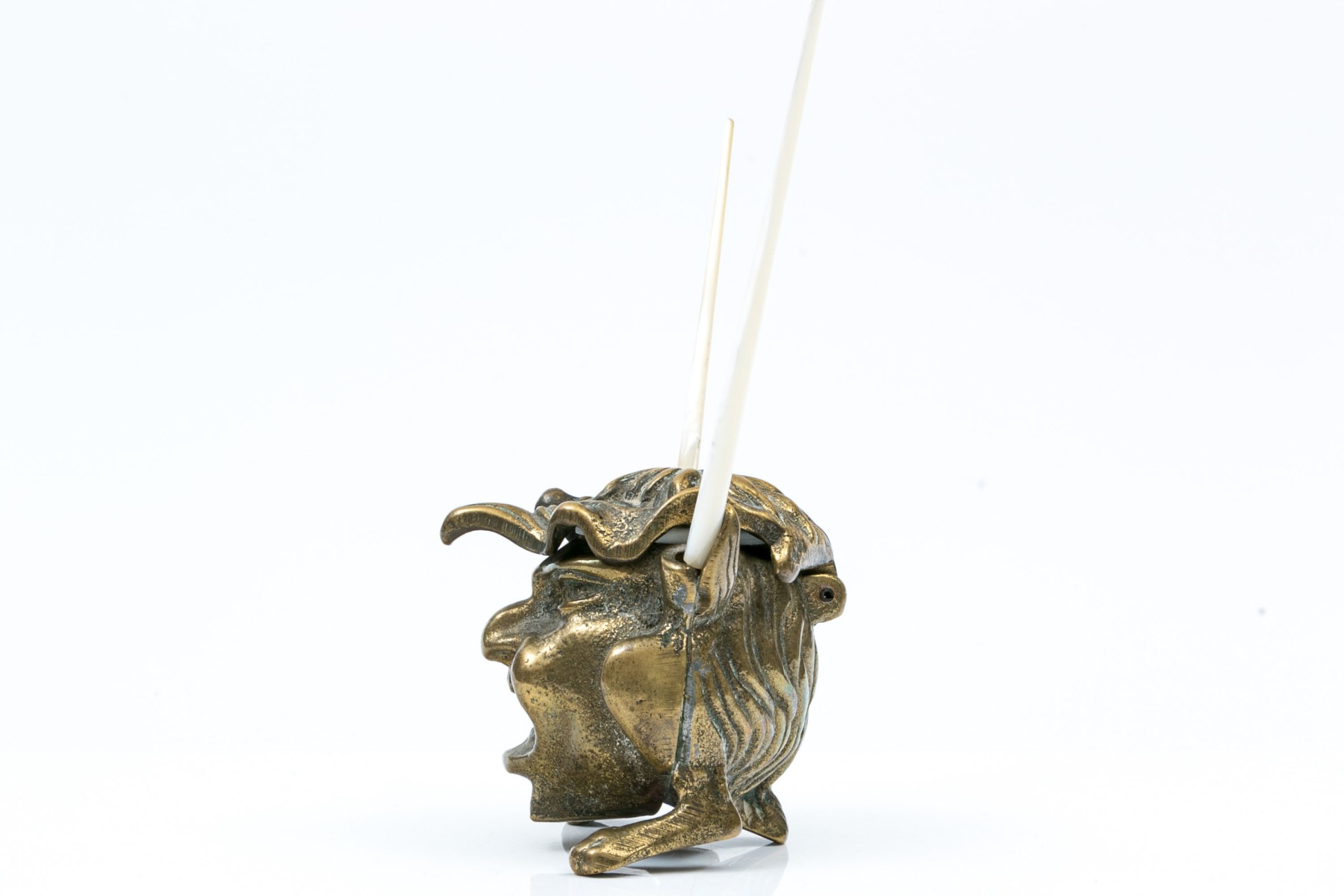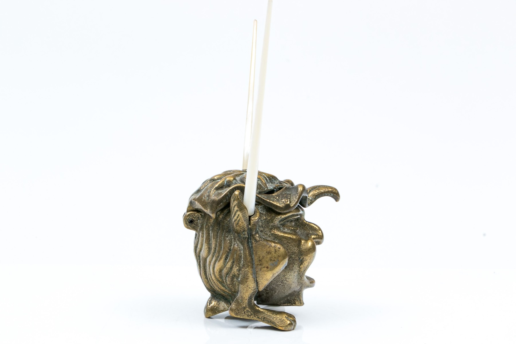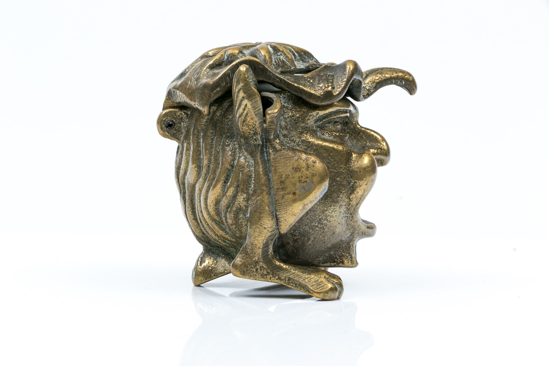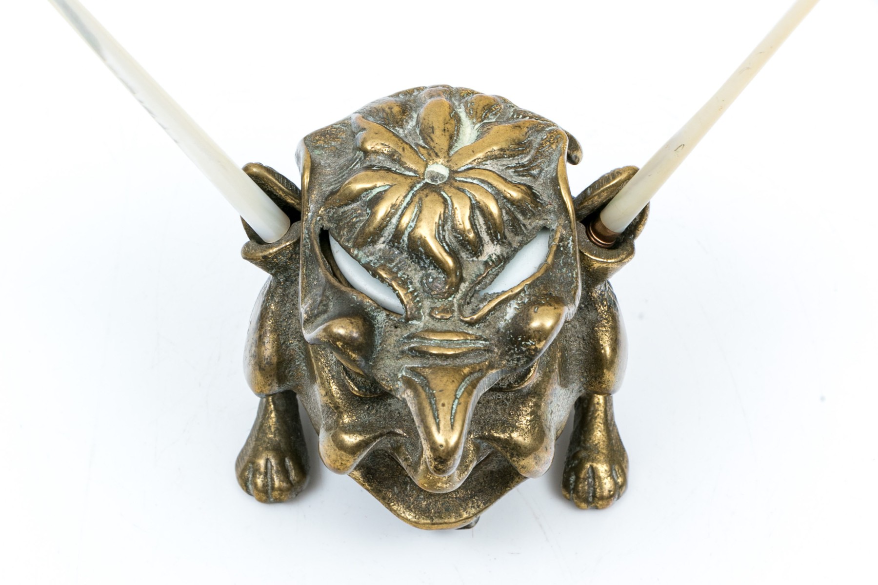 Striking groteque form spelter inkwell, with complementary mother-of-pearl writing instruments