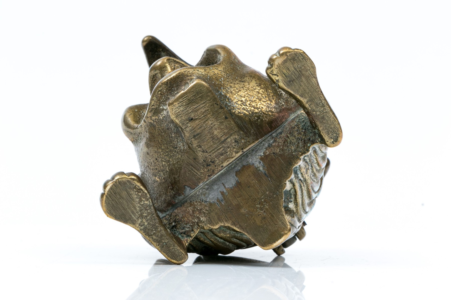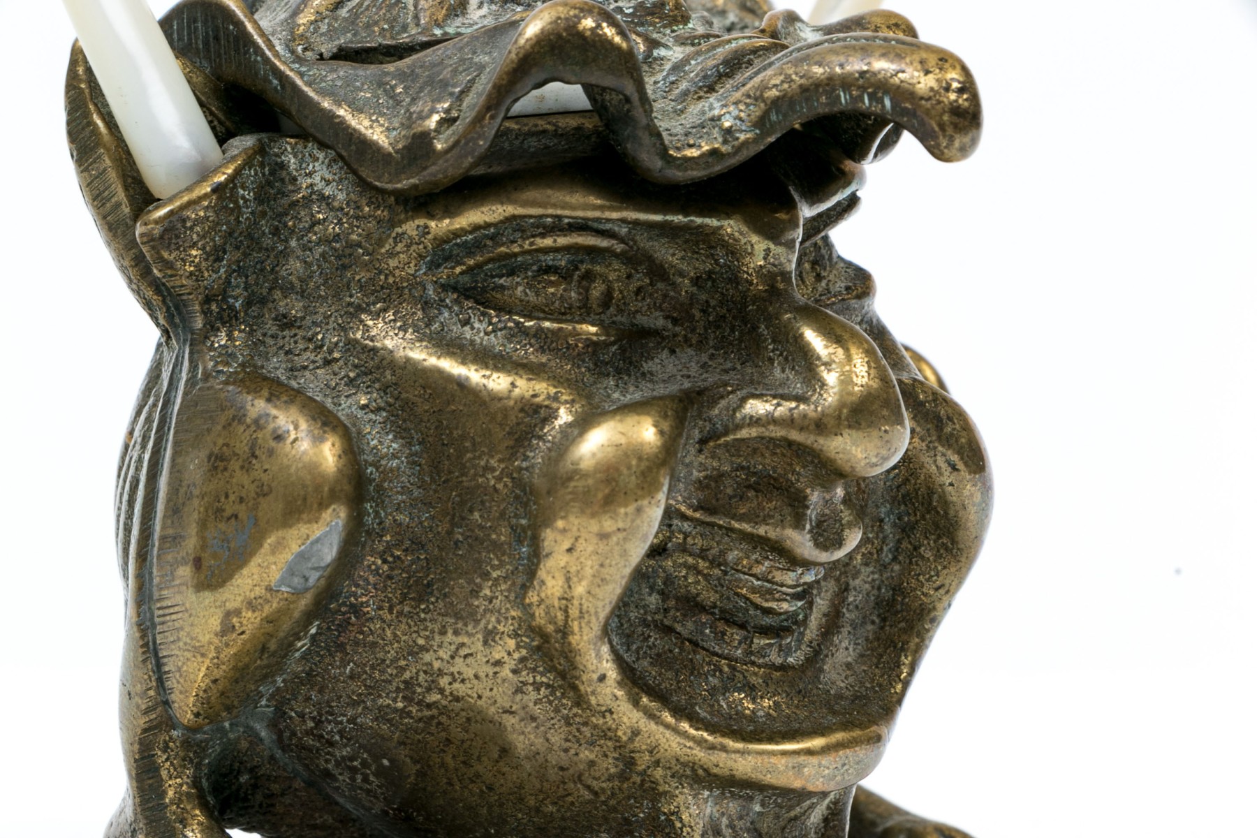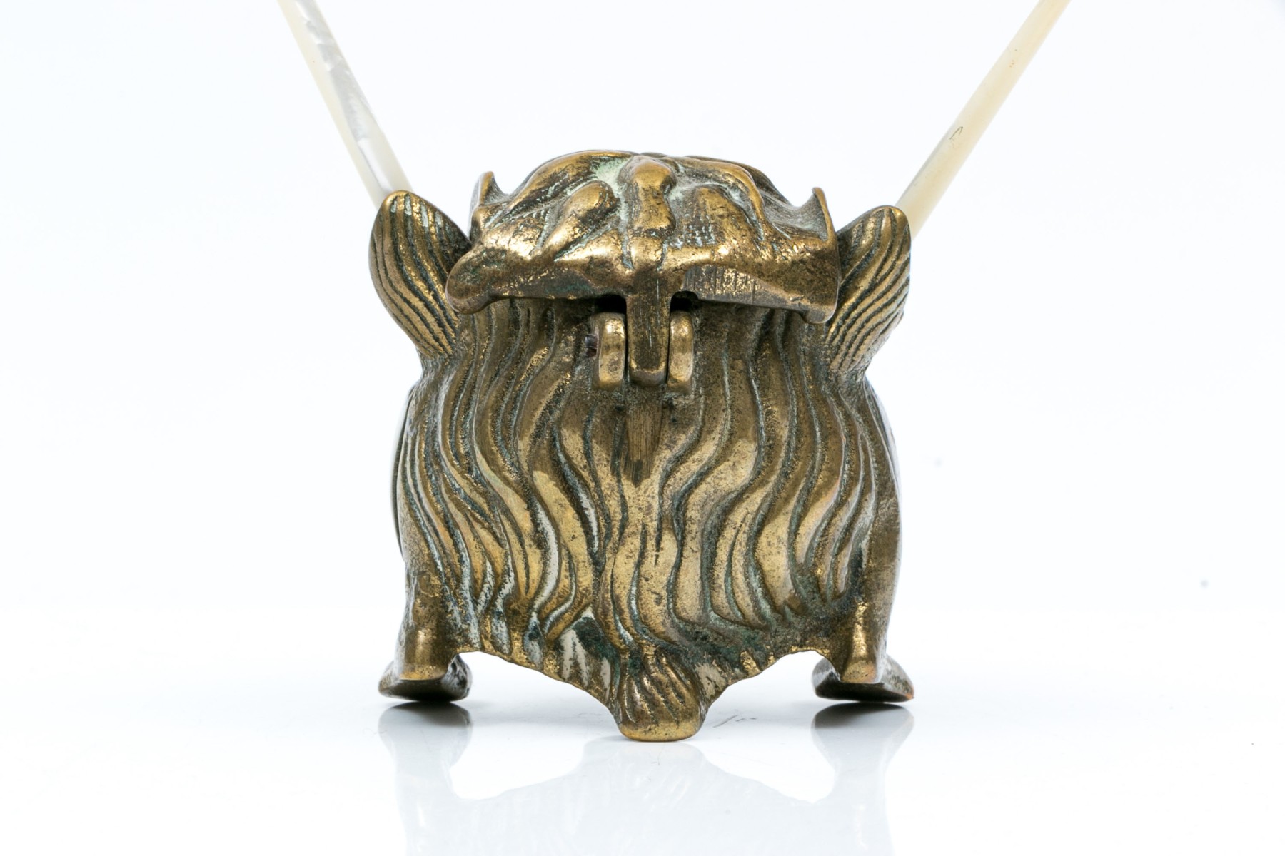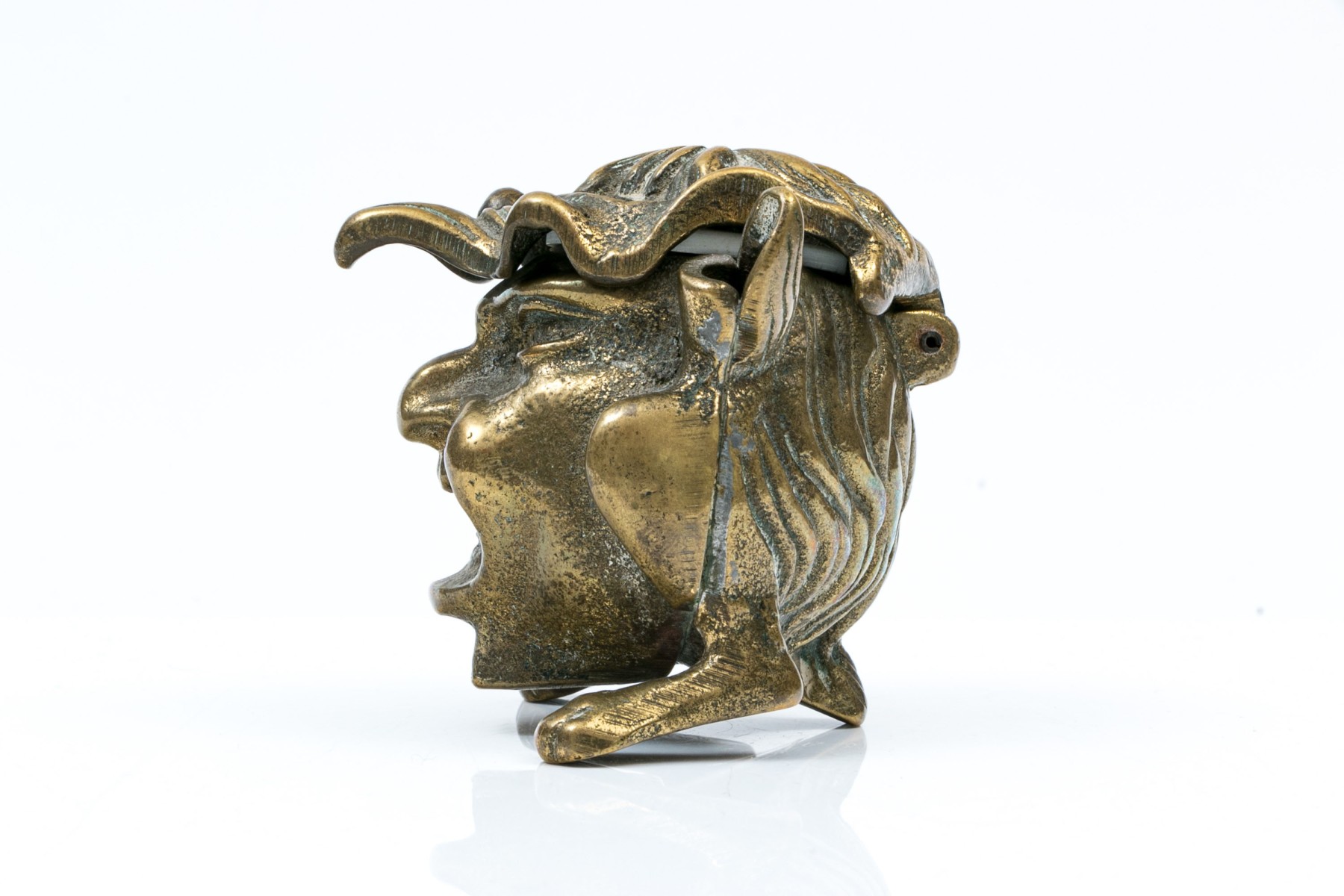 Striking groteque form spelter inkwell, with complementary mother-of-pearl writing instruments