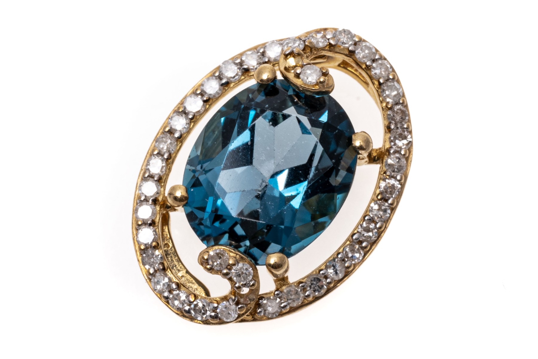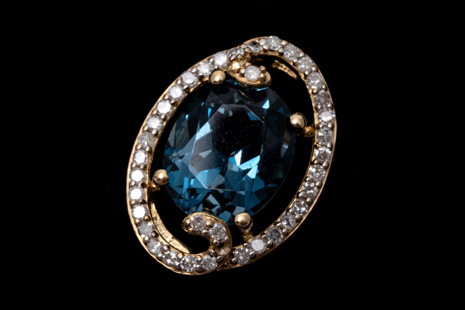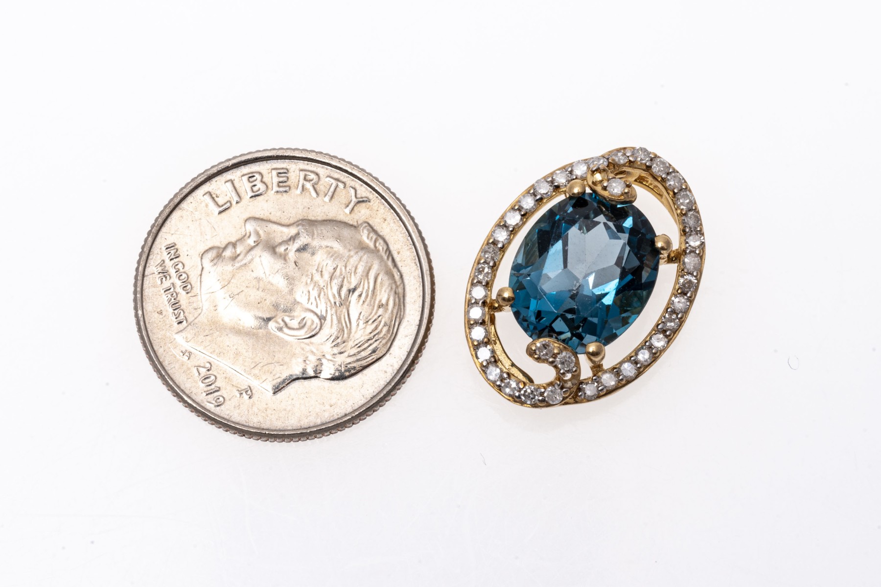 10K yellow gold pendant displays a striking oval cut London blue topaz stone set within a scrollwork frame of diamonds. Topaz approximately 2.5 cts., and the diamonds are approximately 0.32 TCW.