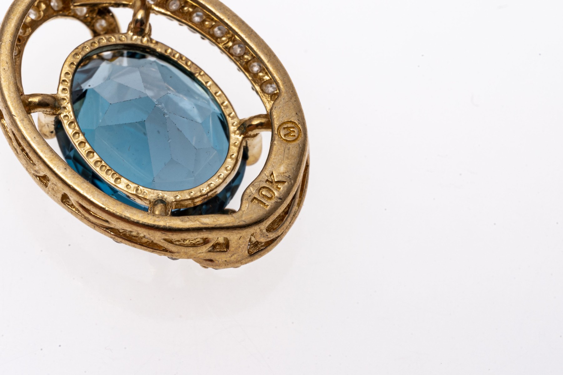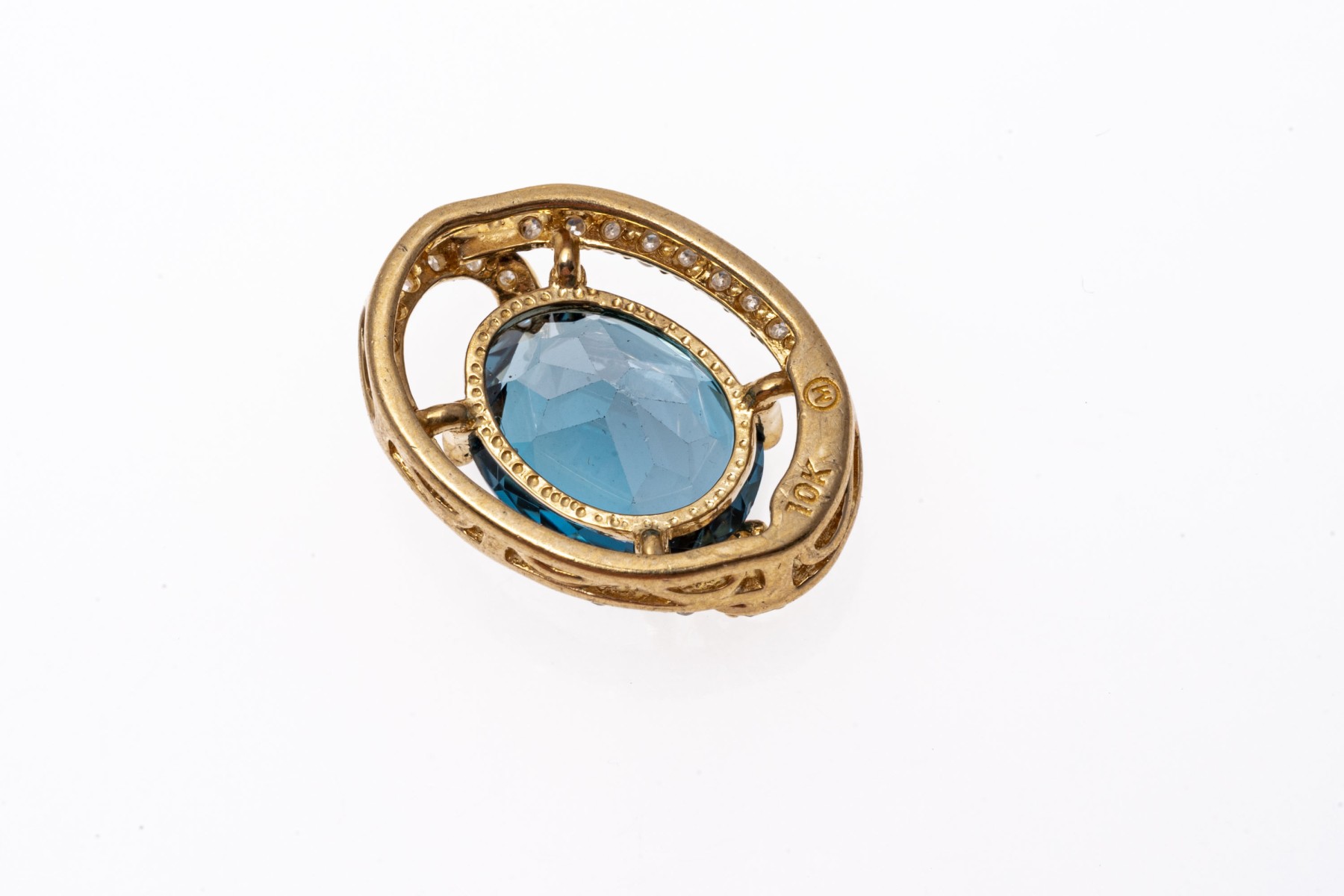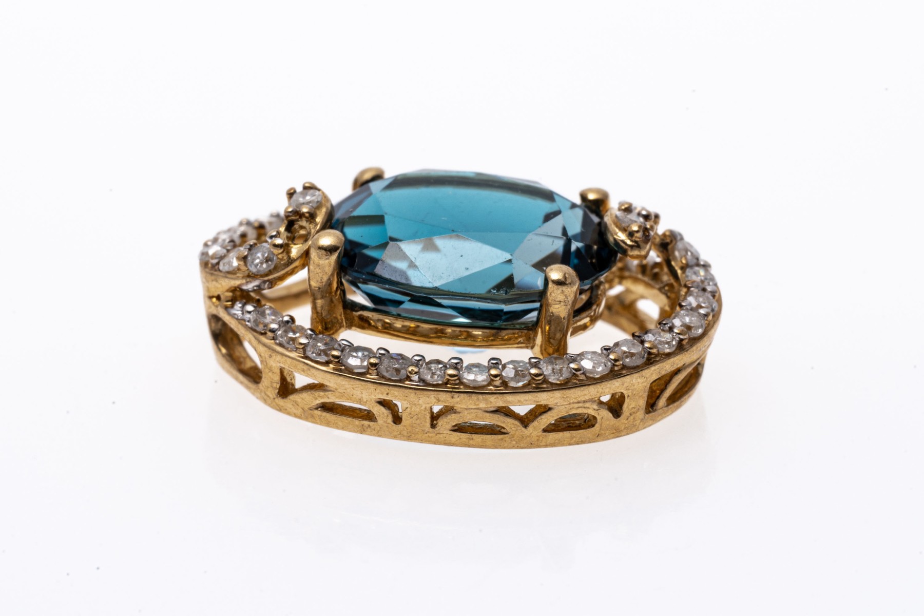 10K yellow gold pendant displays a striking oval cut London blue topaz stone set within a scrollwork frame of diamonds. Topaz approximately 2.5 cts., and the diamonds are approximately 0.32 TCW.