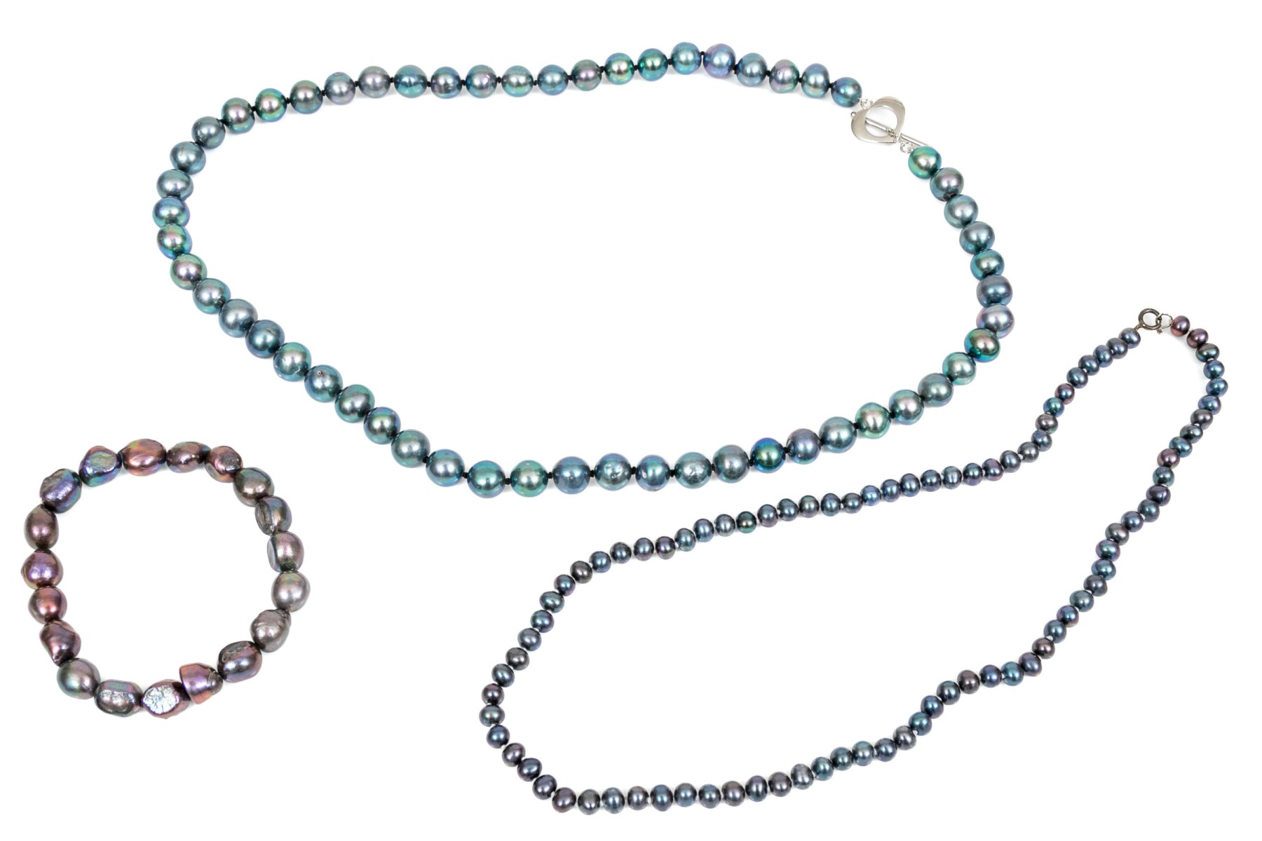 Striking lot of two cultured black freshwater pearl necklaces, and bracelet