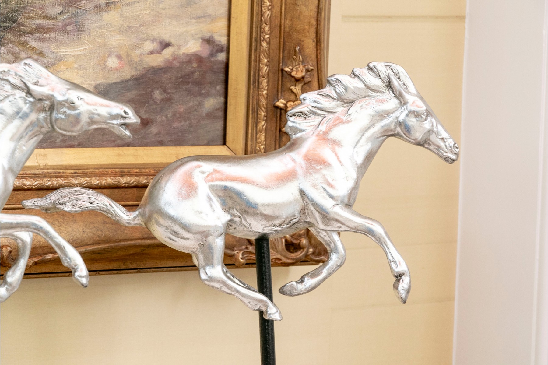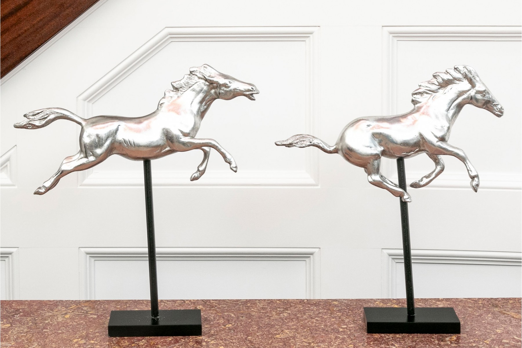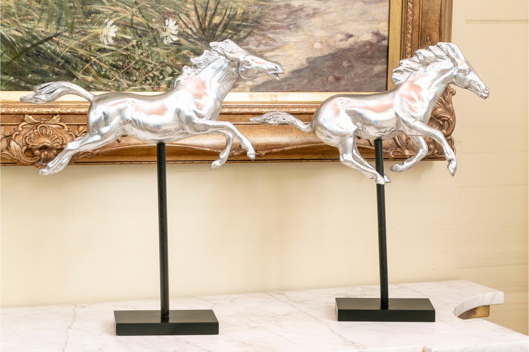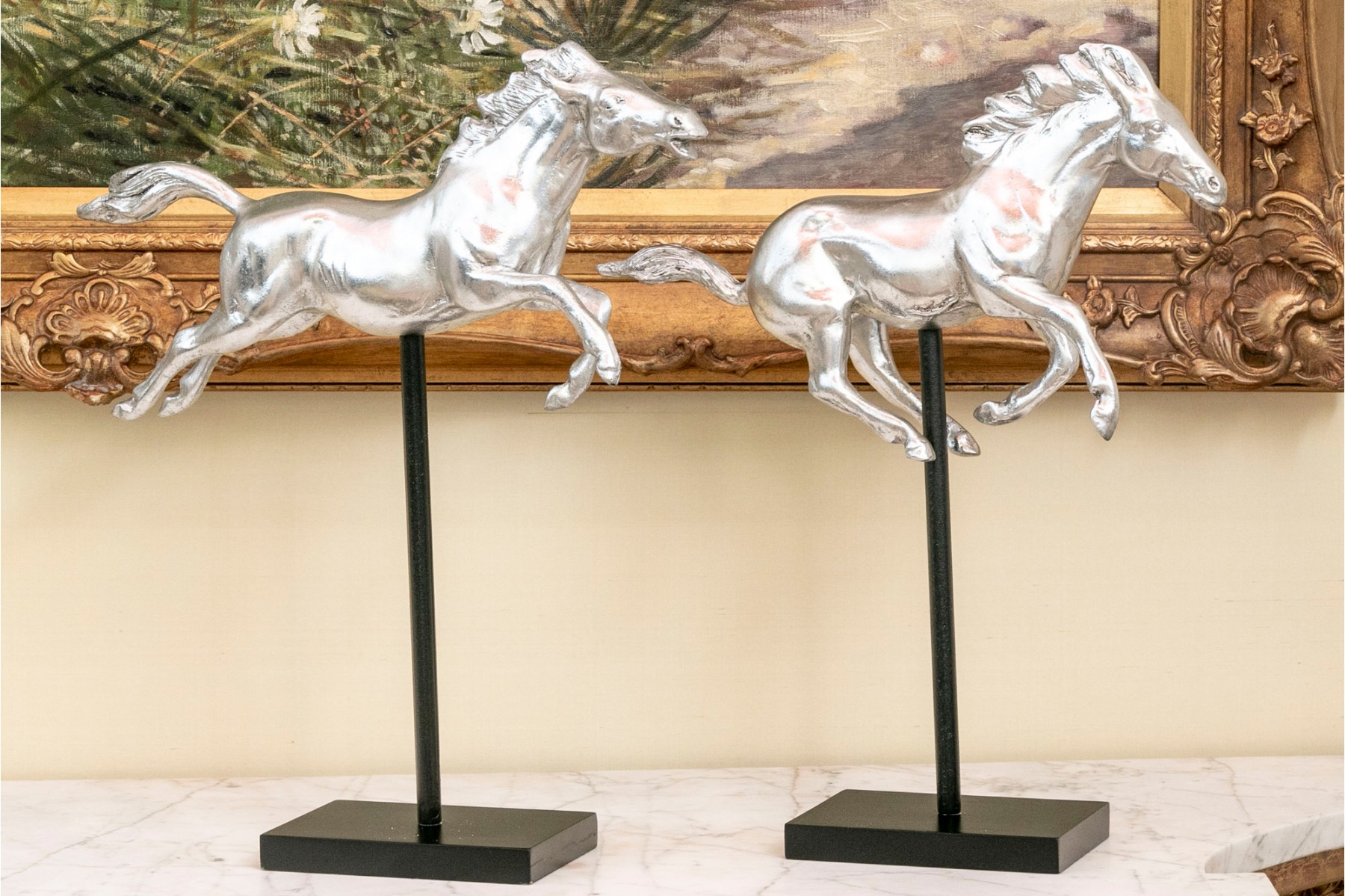 A striking pair of silver-gilded horse figures elegantly poised on black-finished stands.