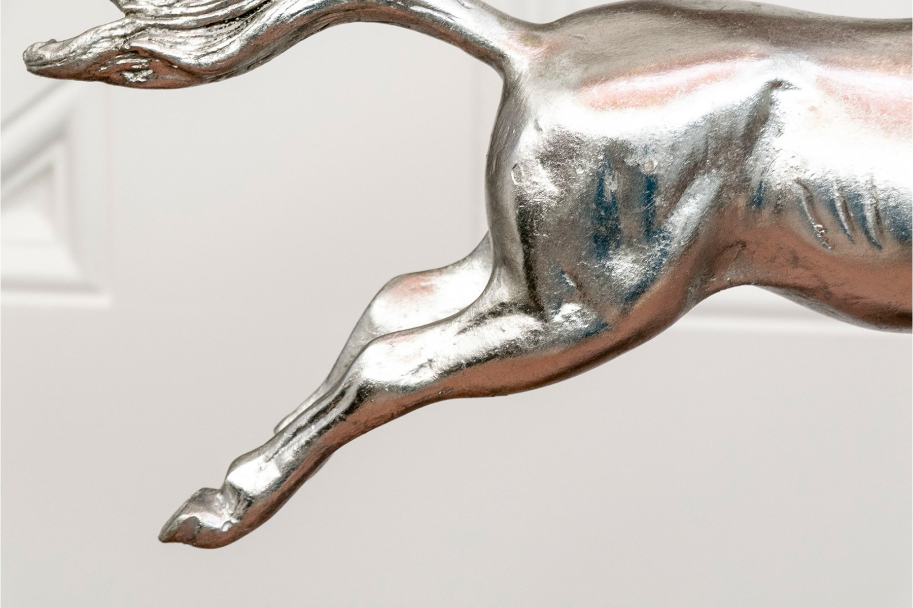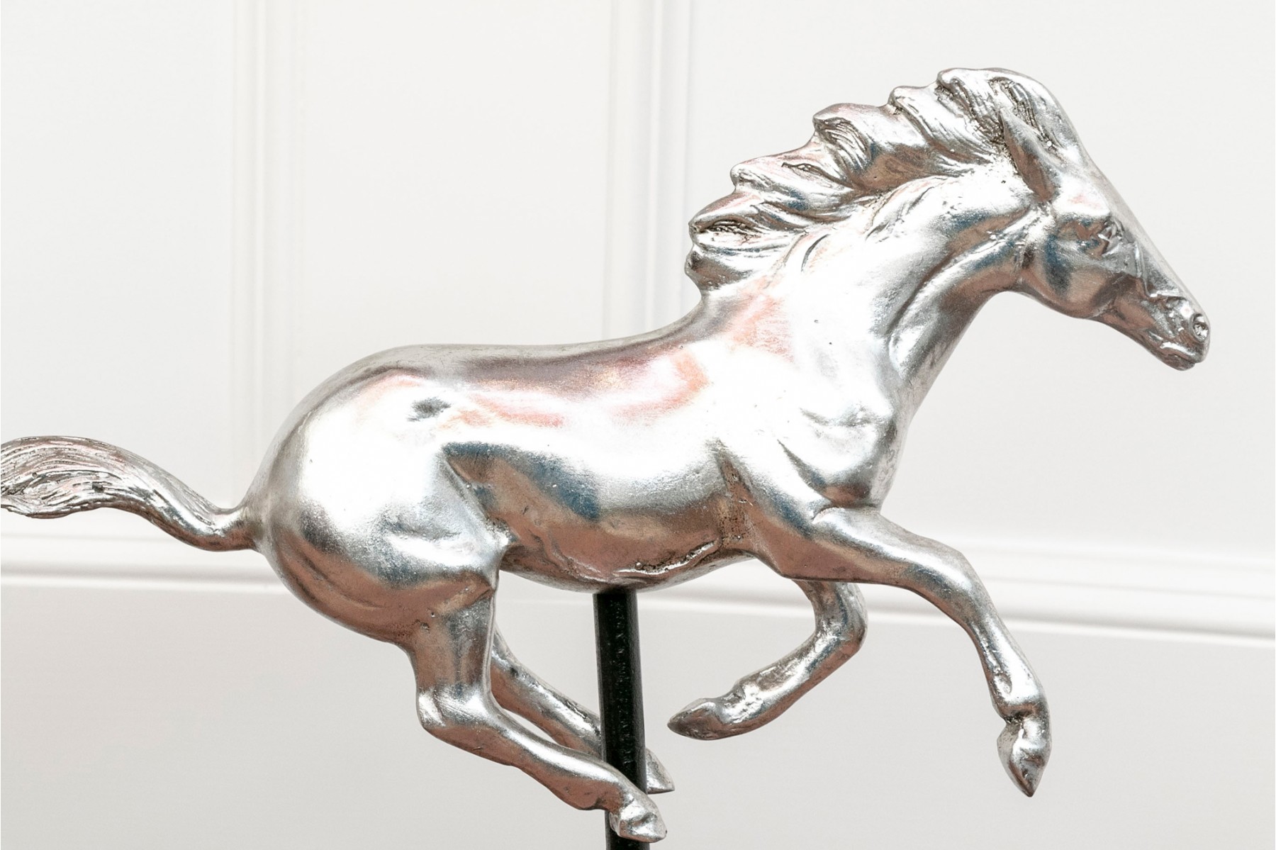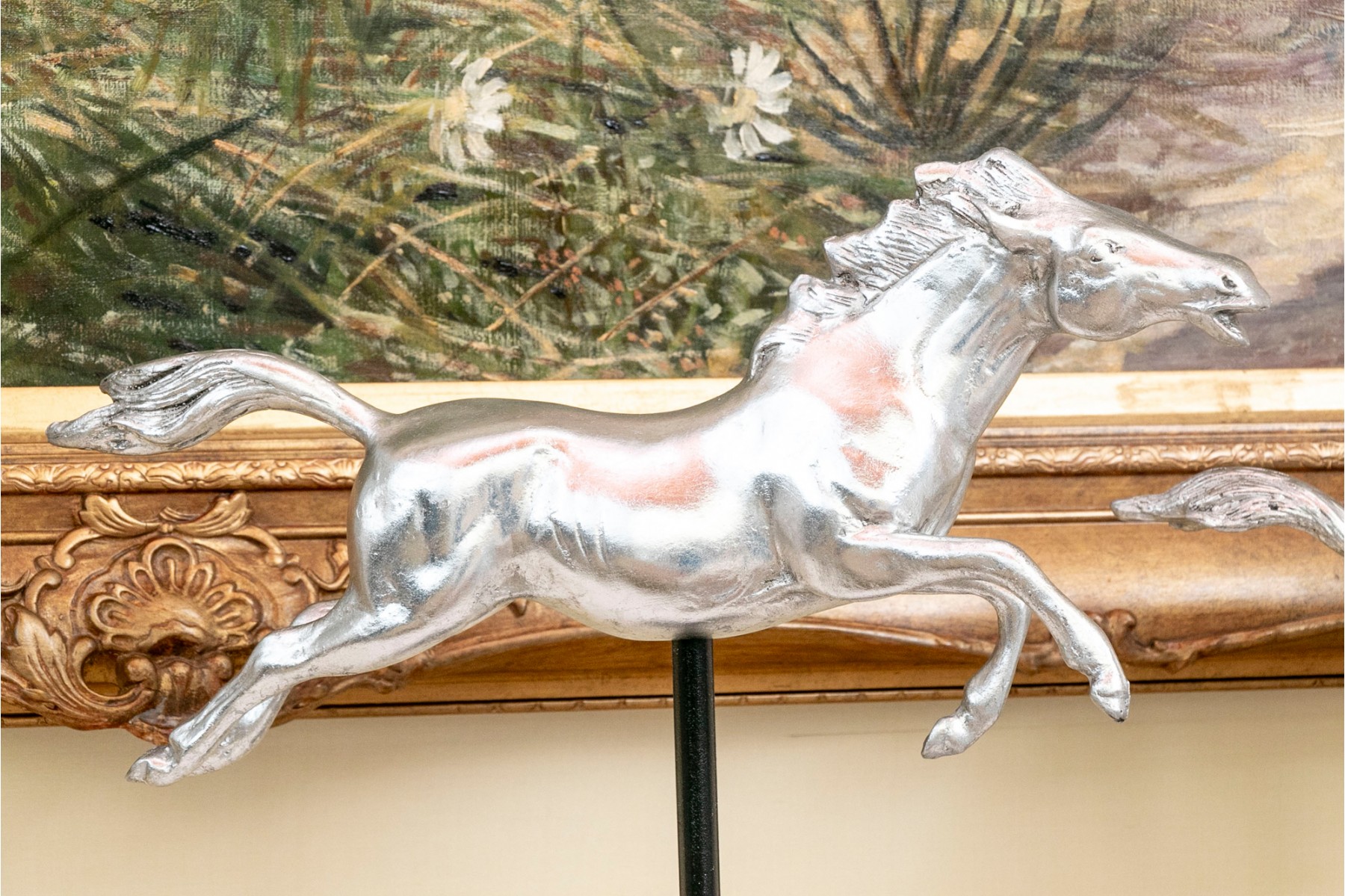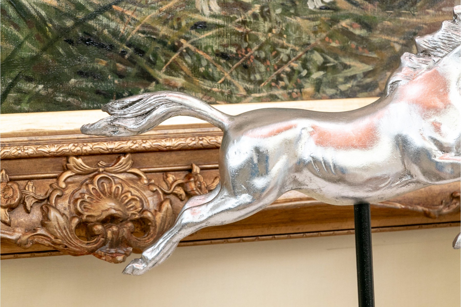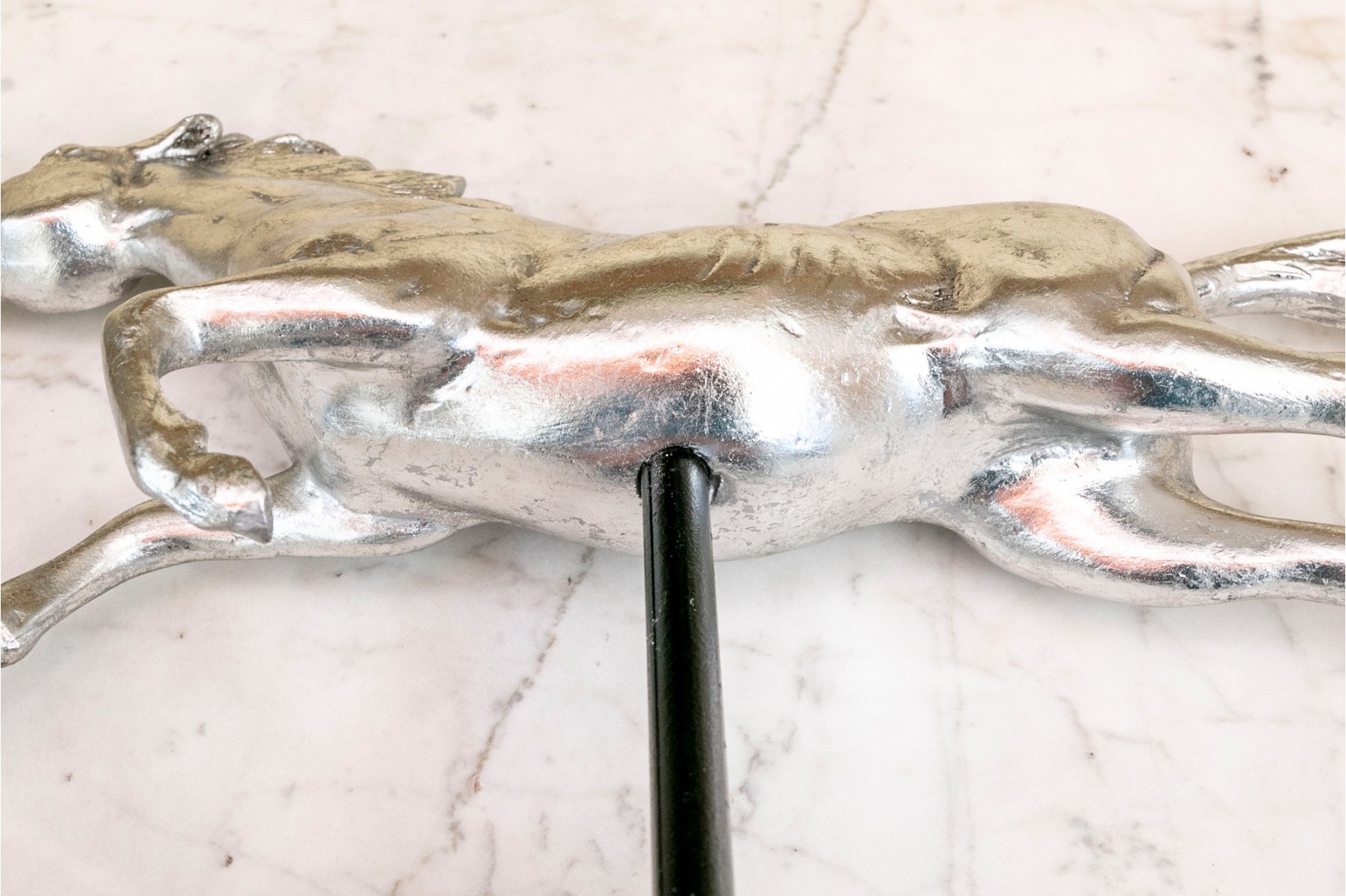 A striking pair of silver-gilded horse figures elegantly poised on black-finished stands.