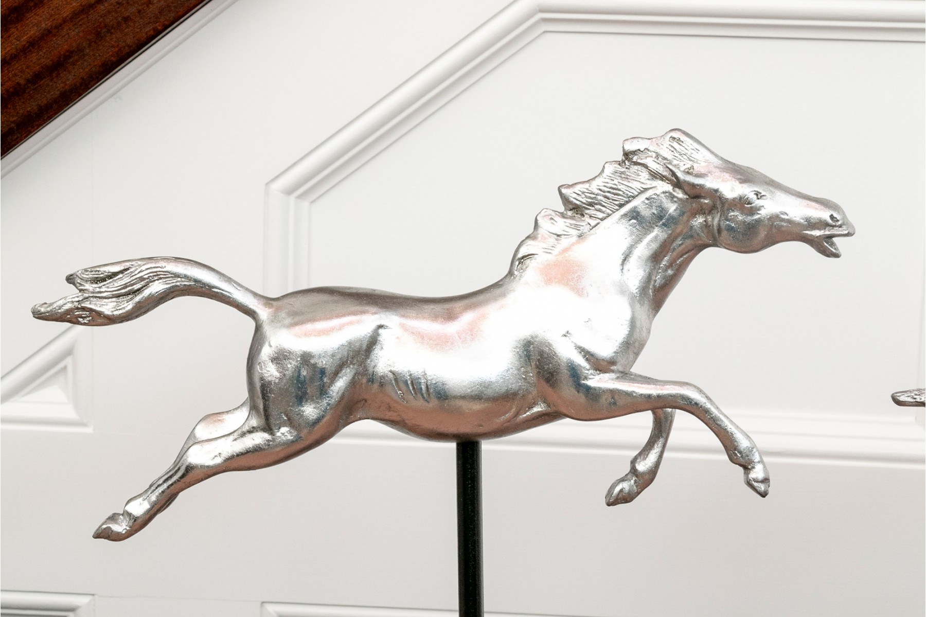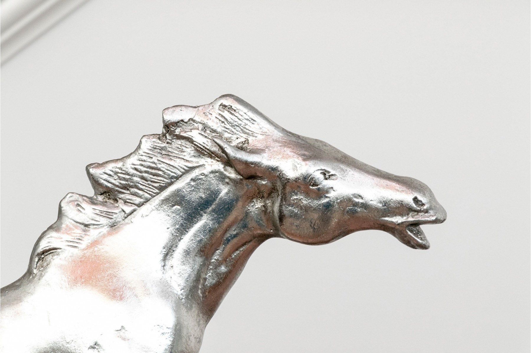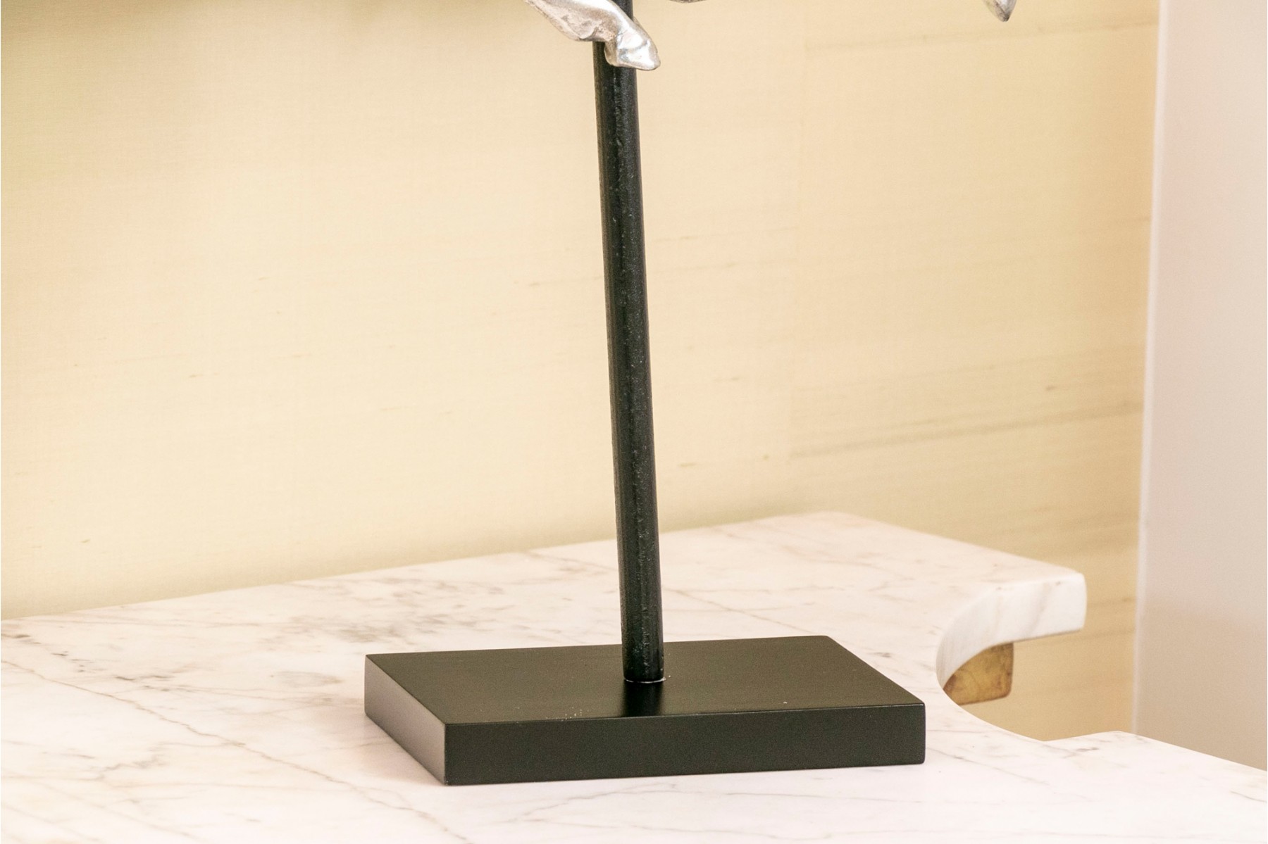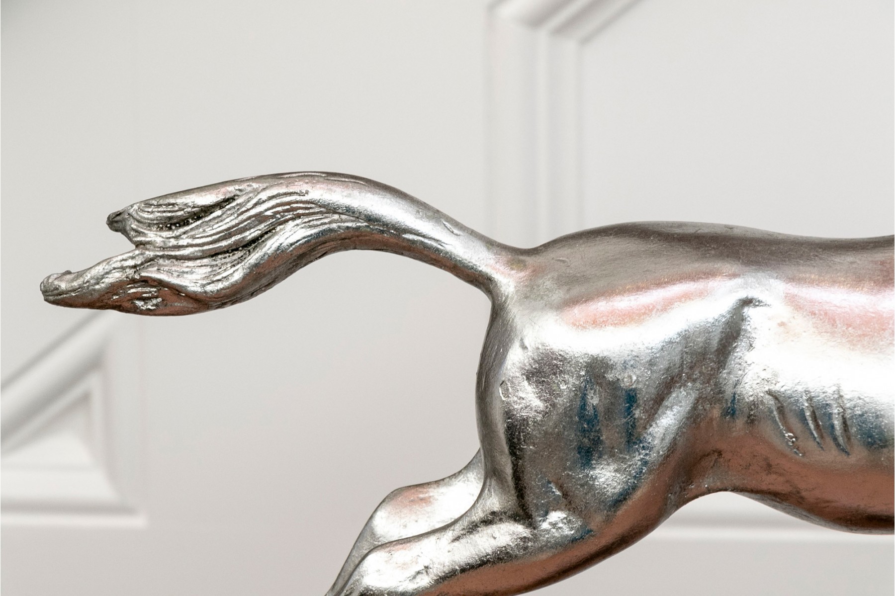 A striking pair of silver-gilded horse figures elegantly poised on black-finished stands.