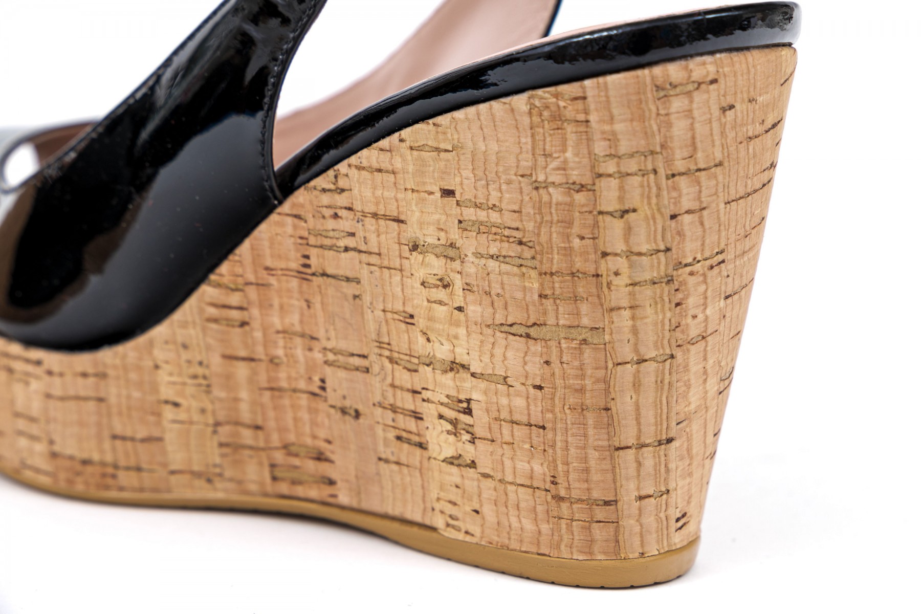 Stuart Weitzman fun black patent leather peep toe cork platform wedges, size 6 1/2