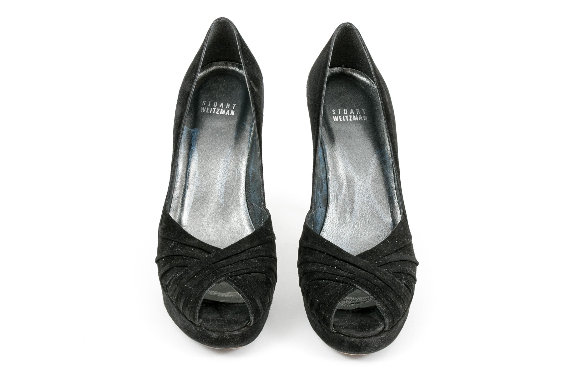 Stuart Weitzman impactful black suede gathered peep toe platform stiletto, size 8 M