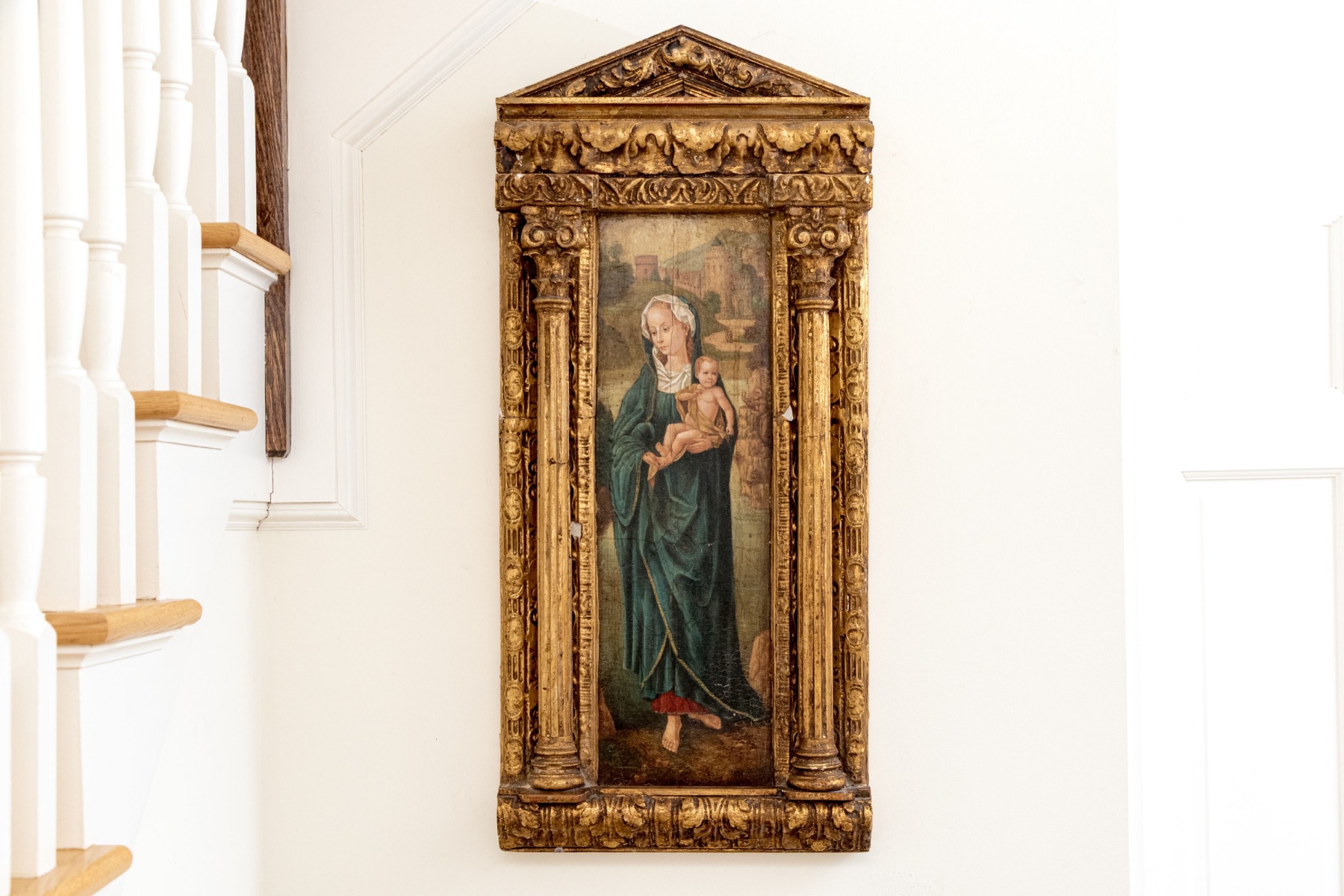 Displayed in a stunning aedicula style gilt wood and gesso architectural frame designed with a triangular pediment over a wide scalloped border and composite style fluted columns leading to a lower band of elegant acanthus leaf relief.