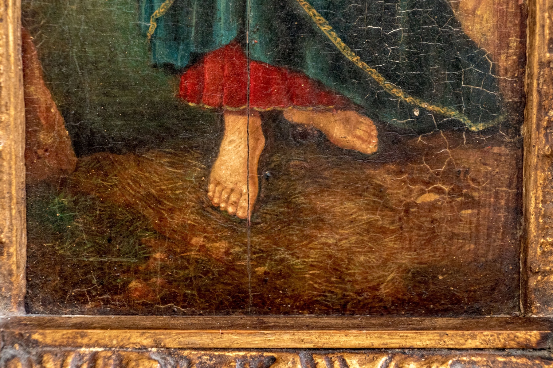 Craquelure to the painting and a split down the center of the panel. Finish wear and gesso loss to the frame, most notably on the left side. Despite wear still a gorgeous piece with a wonderful time-loved aesthetic and classical presence.