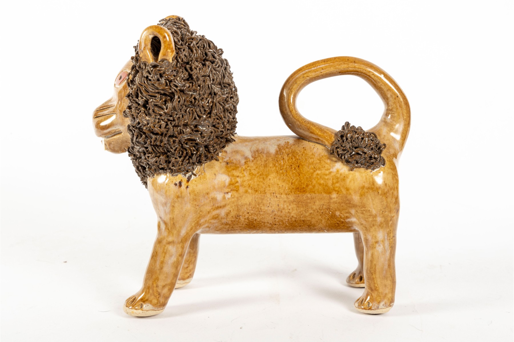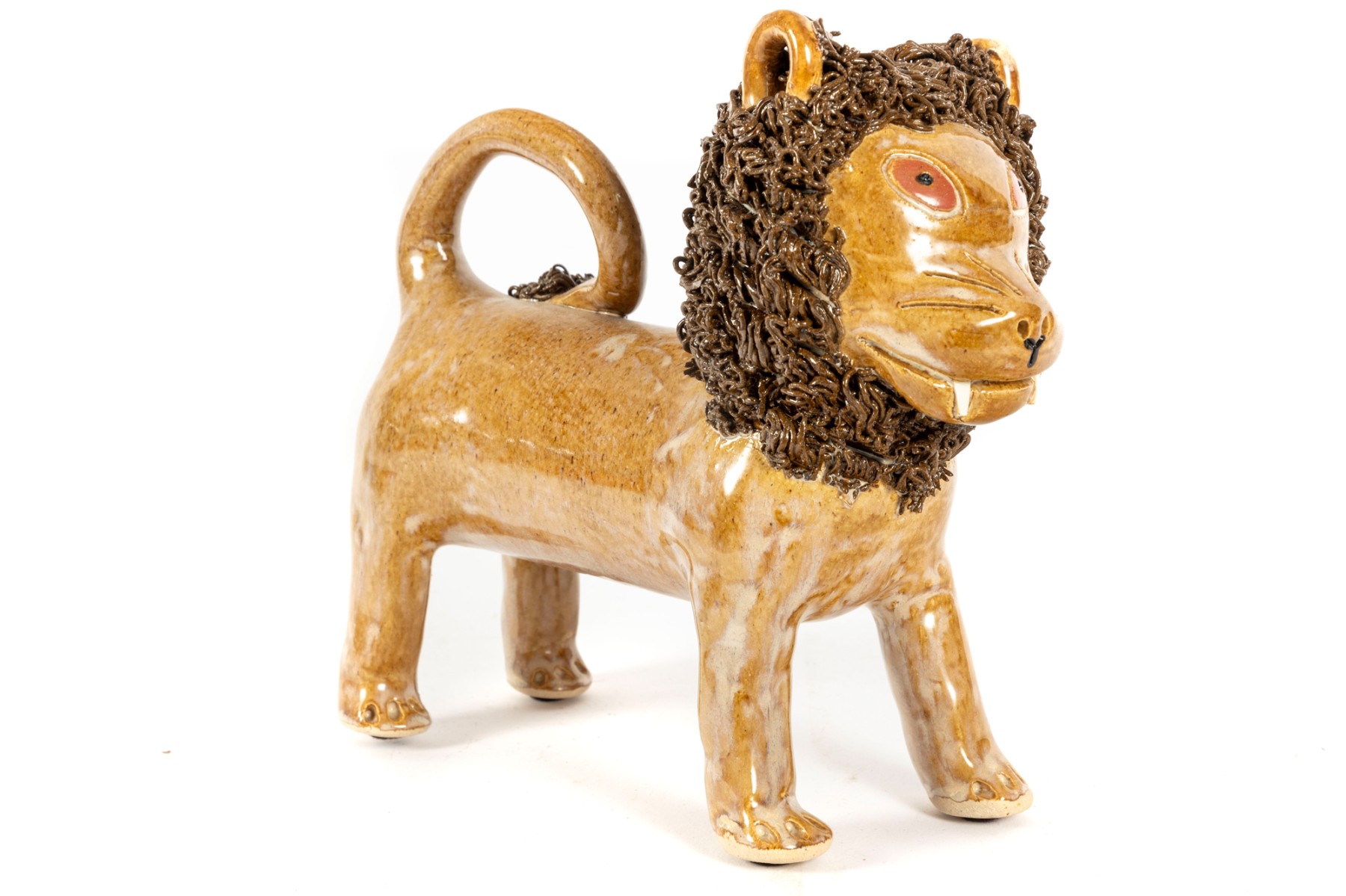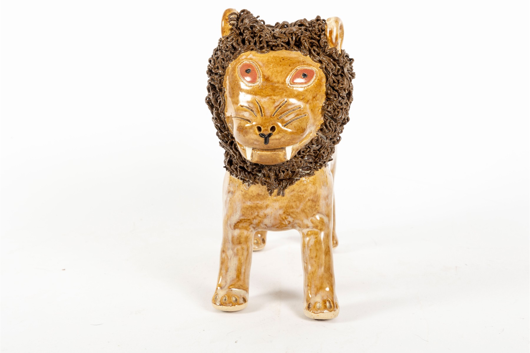 A striking young lion figure, crackle-glazed over fine ceramic sporting meticulous hand-sculpted detail. The example — signed indistinctly, is likely inspired by examples produced in the early 2000's by Crystal King Pottery. The signature is inscribed beneath the main body.