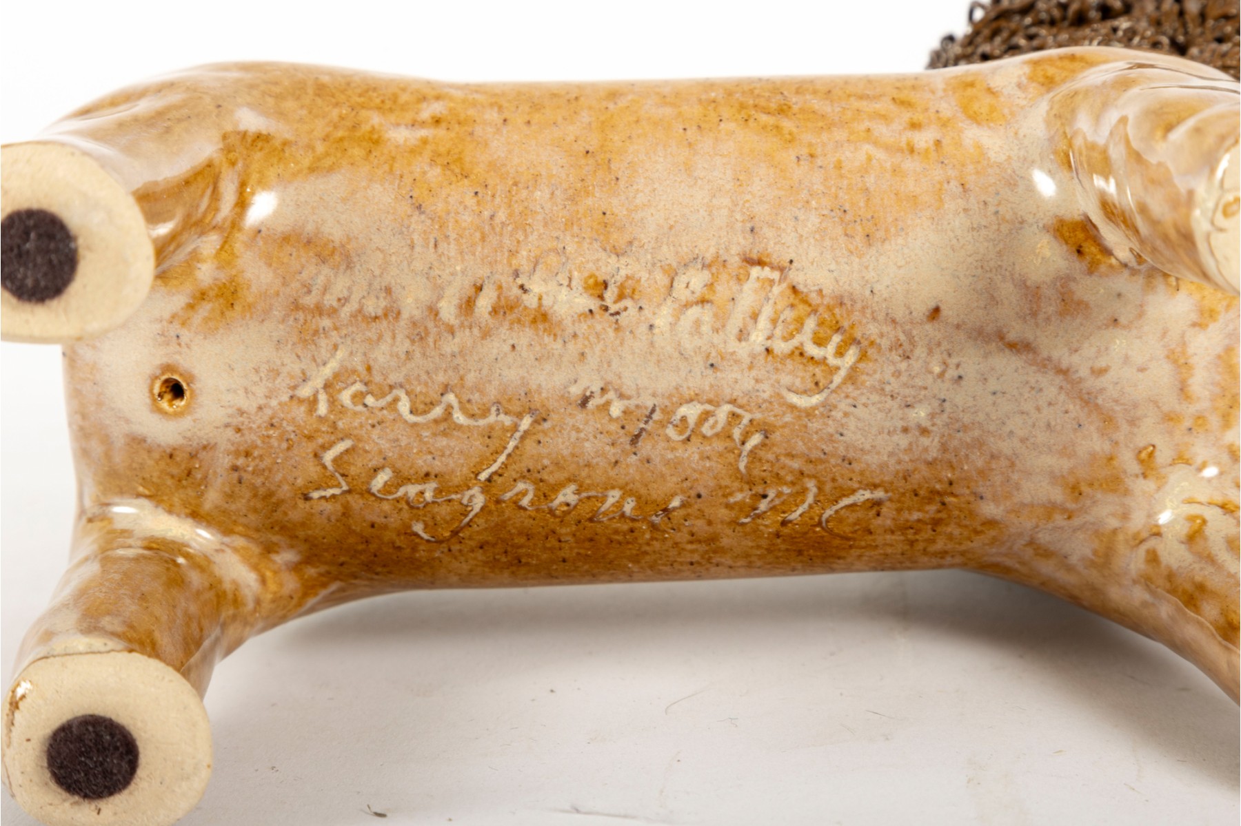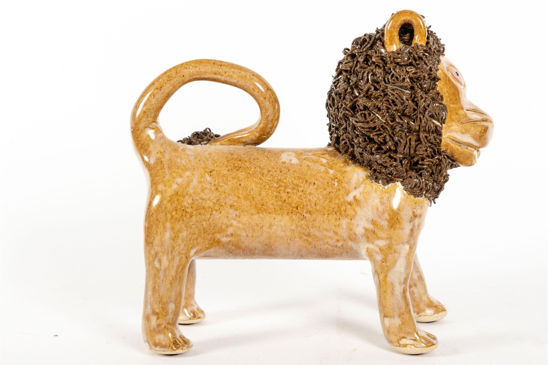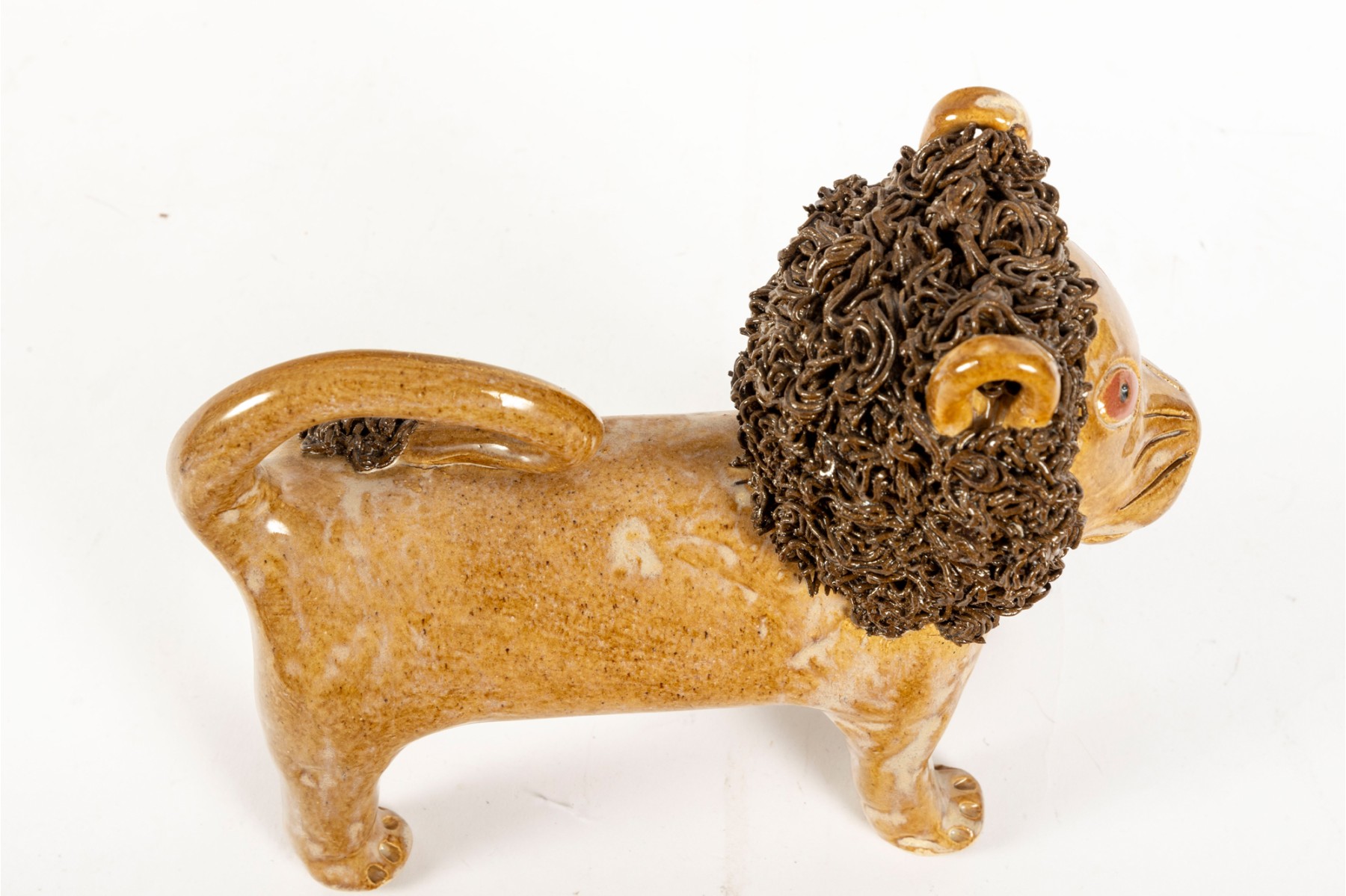 A striking young lion figure, crackle-glazed over fine ceramic sporting meticulous hand-sculpted detail. The example — signed indistinctly, is likely inspired by examples produced in the early 2000's by Crystal King Pottery. The signature is inscribed beneath the main body.