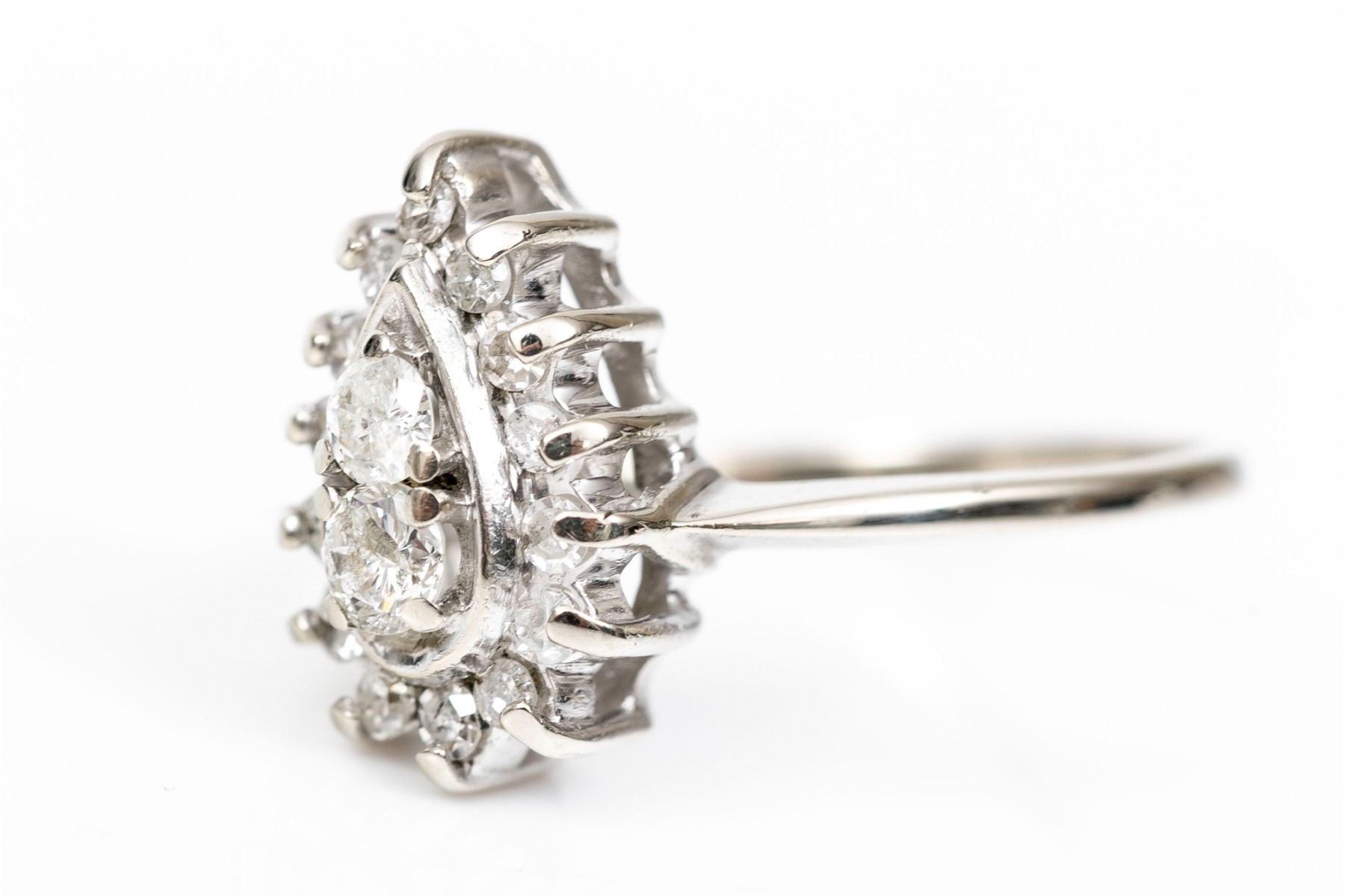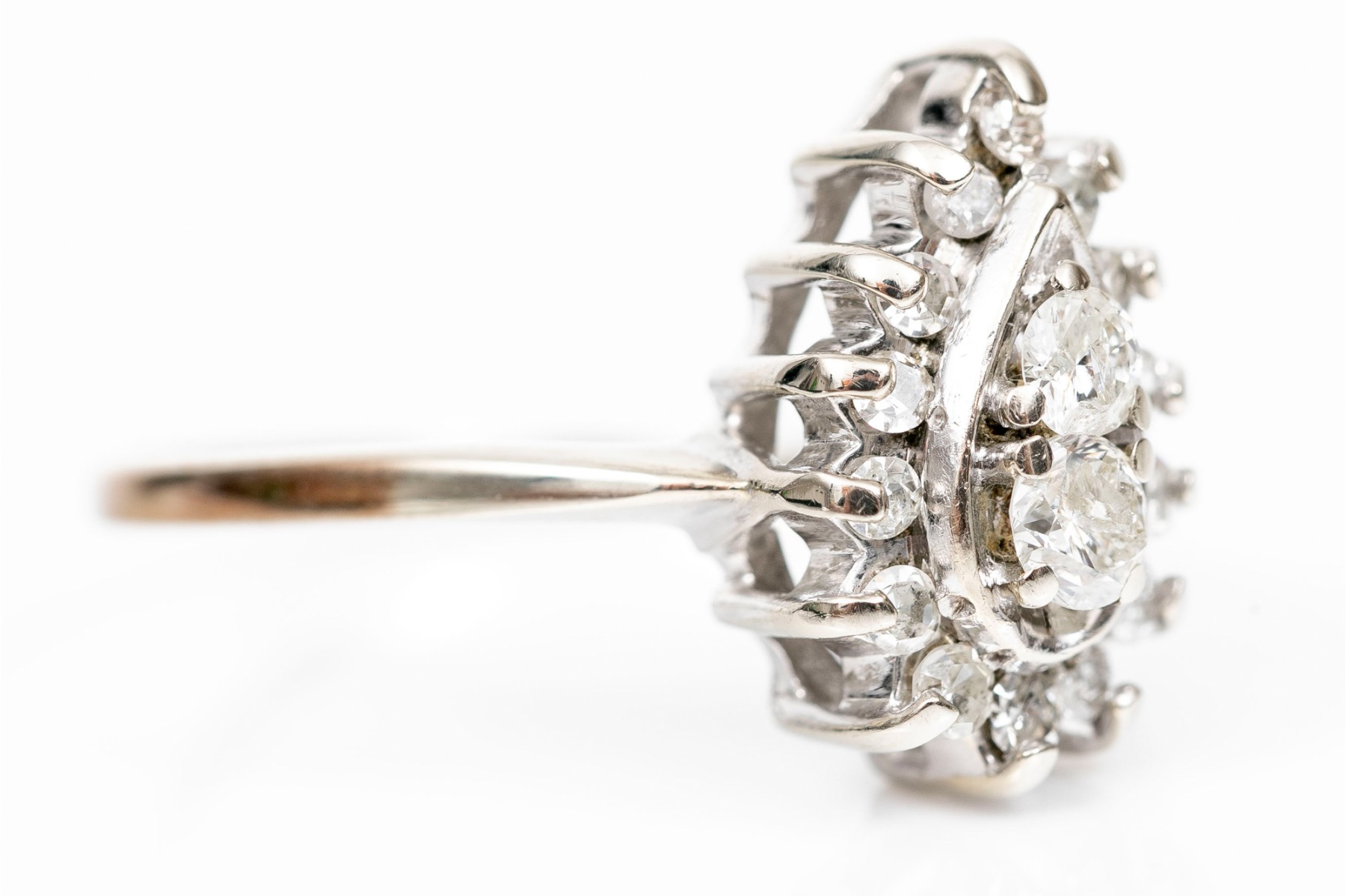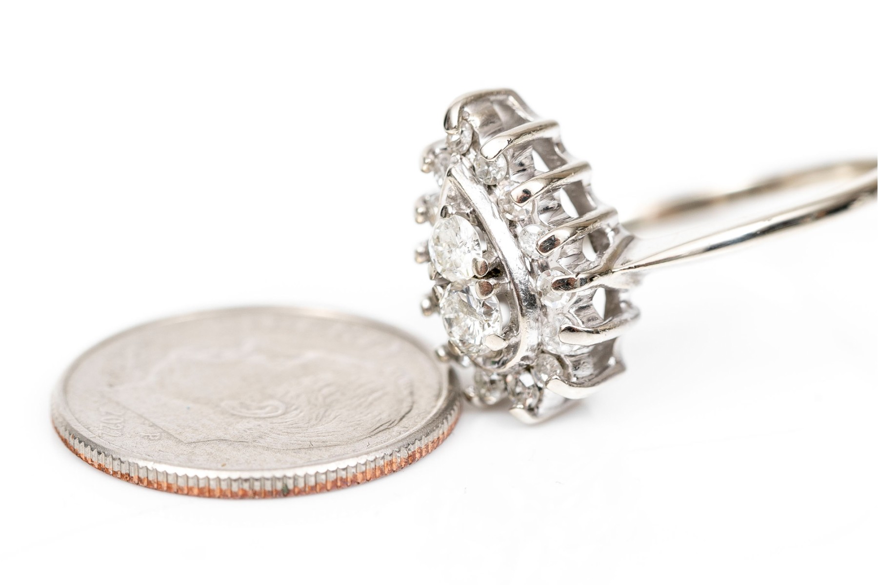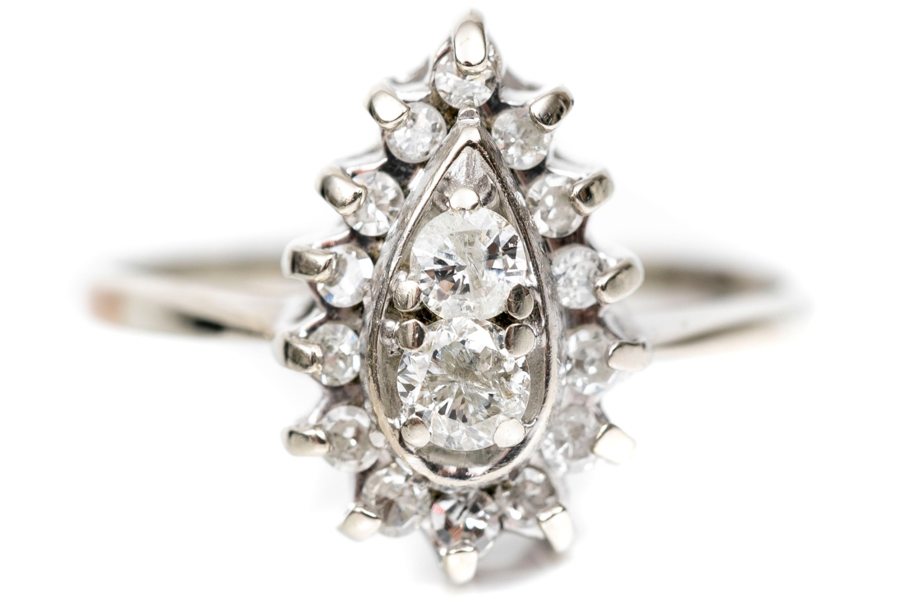 Stunning pear form 14K white gold ring. Set with round brilliant cut diamonds for a stunning shimmer. The diamonds are approximately 0.38 TCW. Ring size 8-.