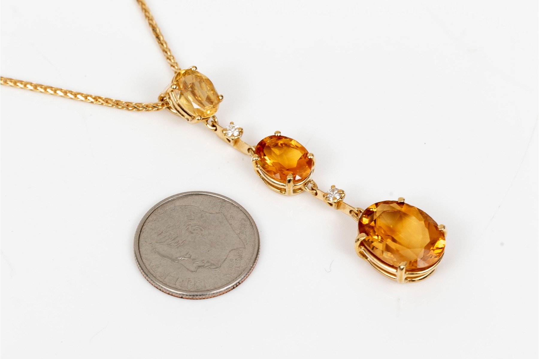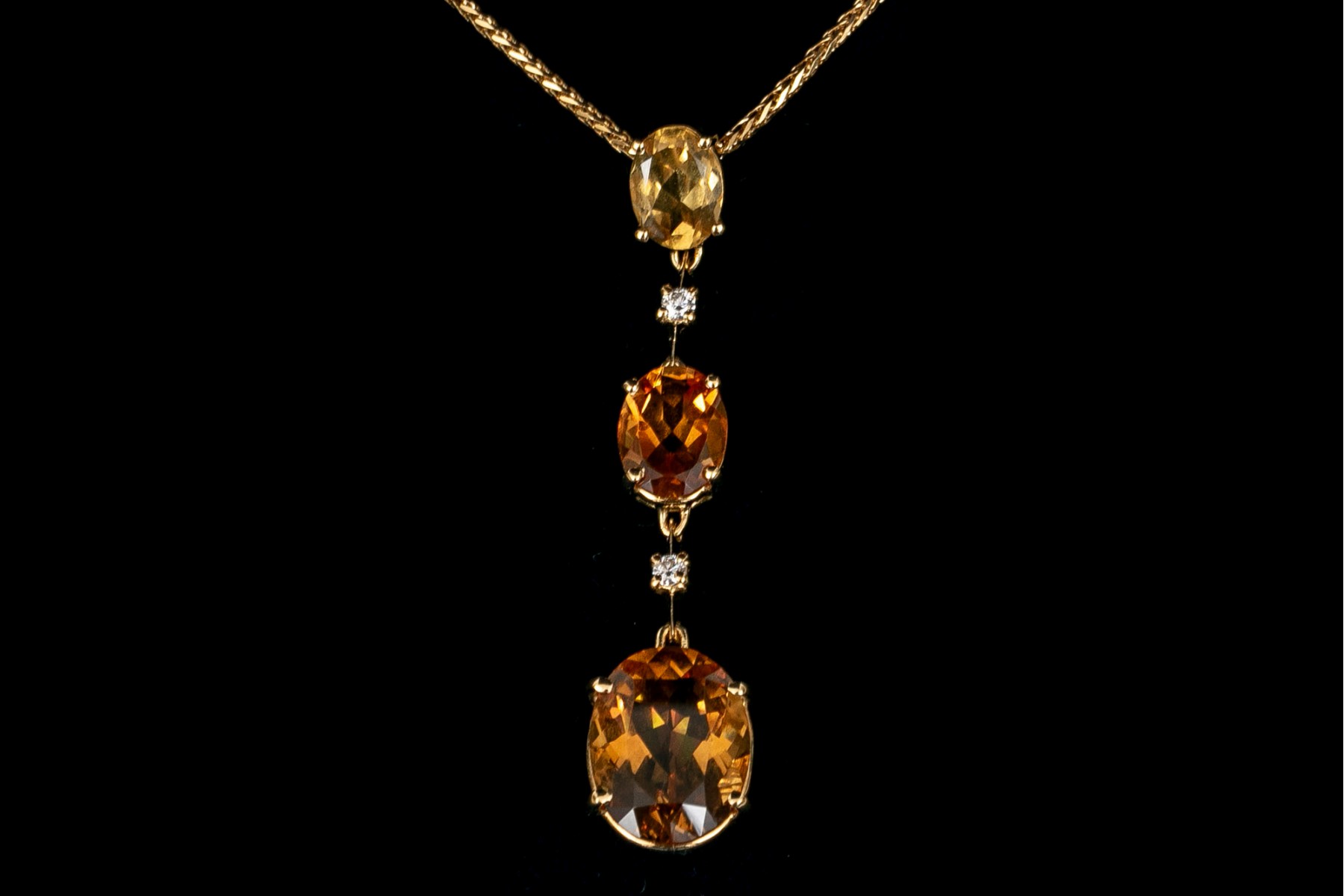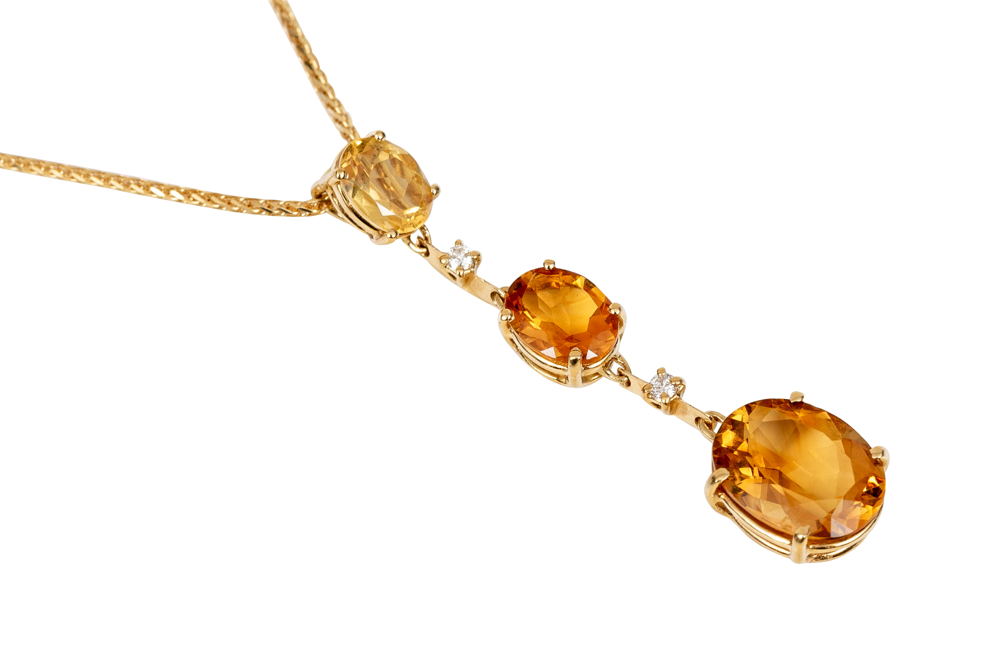 An 18K yellow gold pendant necklace by Antonin. Displayed on a wheat style chain is a stunning drop style pendant set with graduated oval cut citrines. Set between the citrines are round brilliant cut diamonds. The citrines are approximately 5.86 TCW and the diamonds approximately 0.06 TCW. Lobster claw clasp.