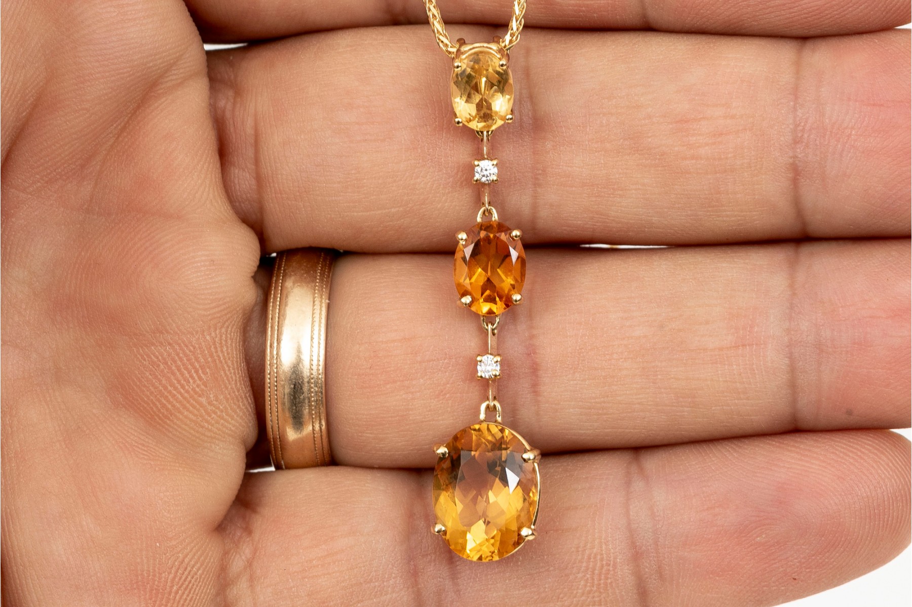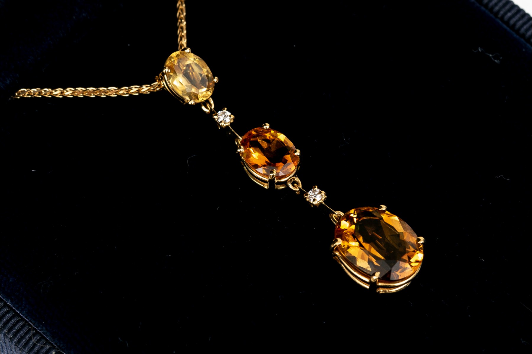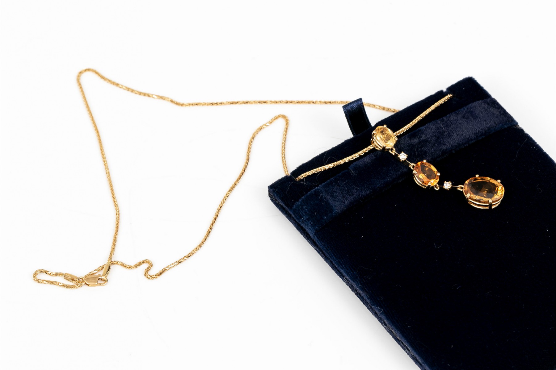 An 18K yellow gold pendant necklace by Antonin. Displayed on a wheat style chain is a stunning drop style pendant set with graduated oval cut citrines. Set between the citrines are round brilliant cut diamonds. The citrines are approximately 5.86 TCW and the diamonds approximately 0.06 TCW. Lobster claw clasp.
