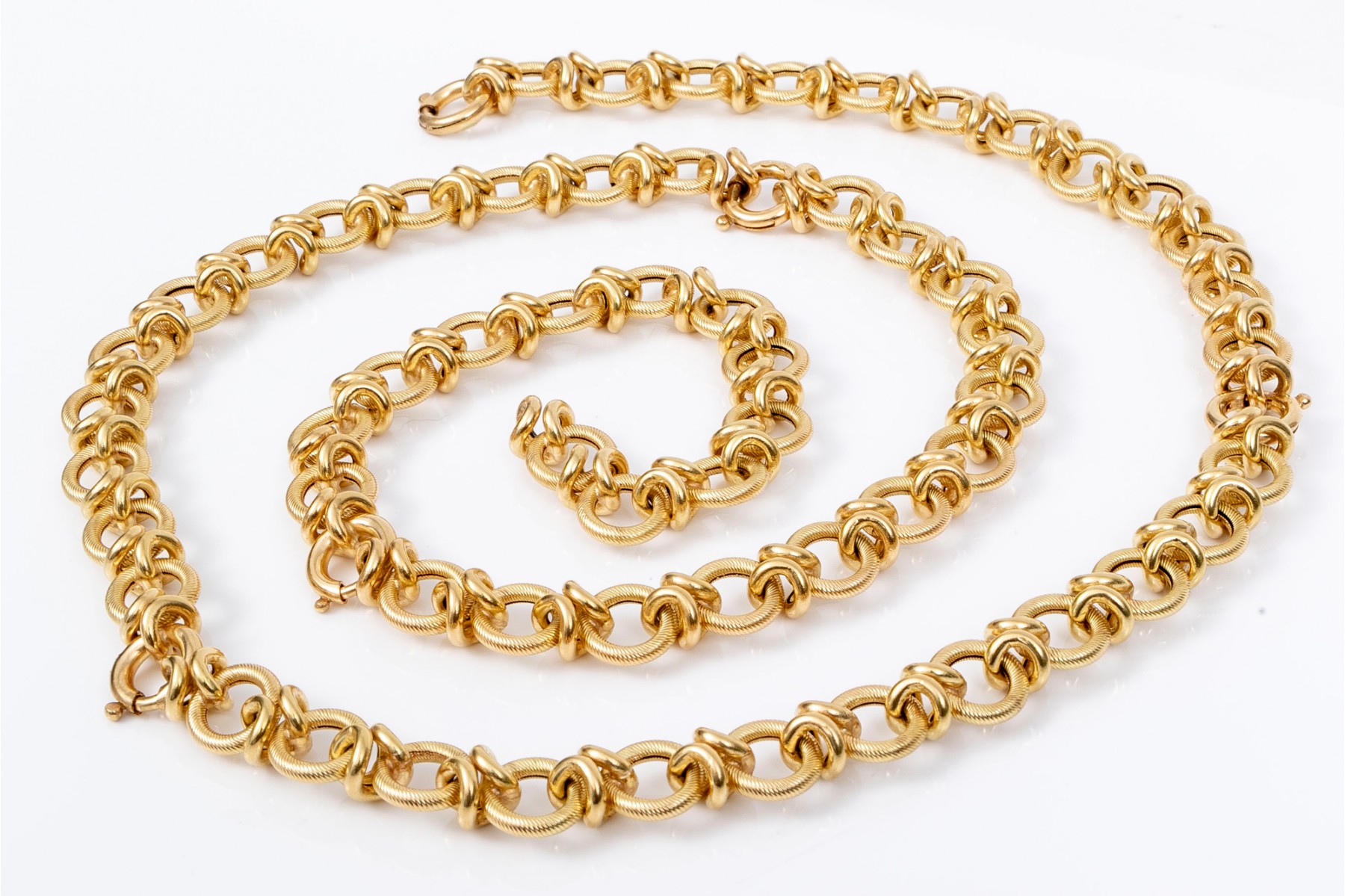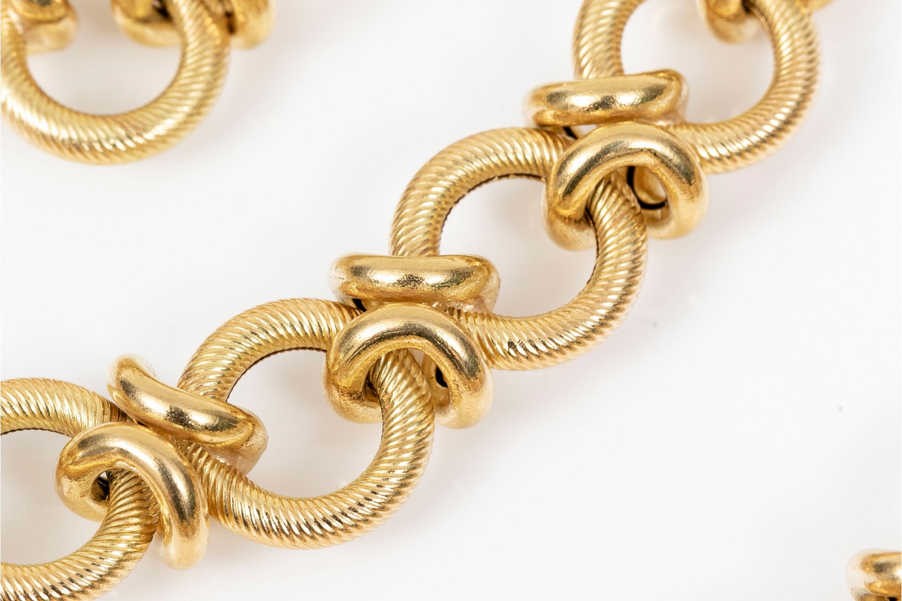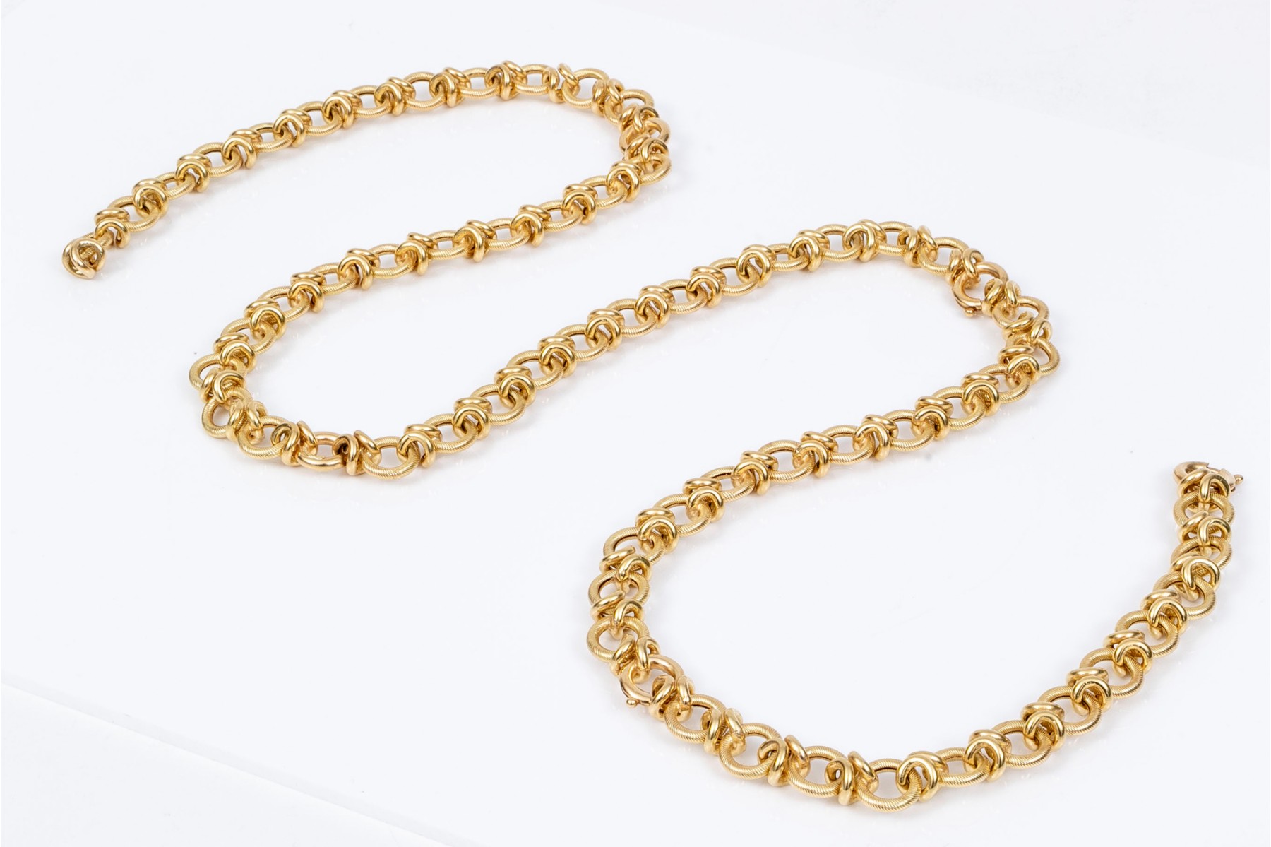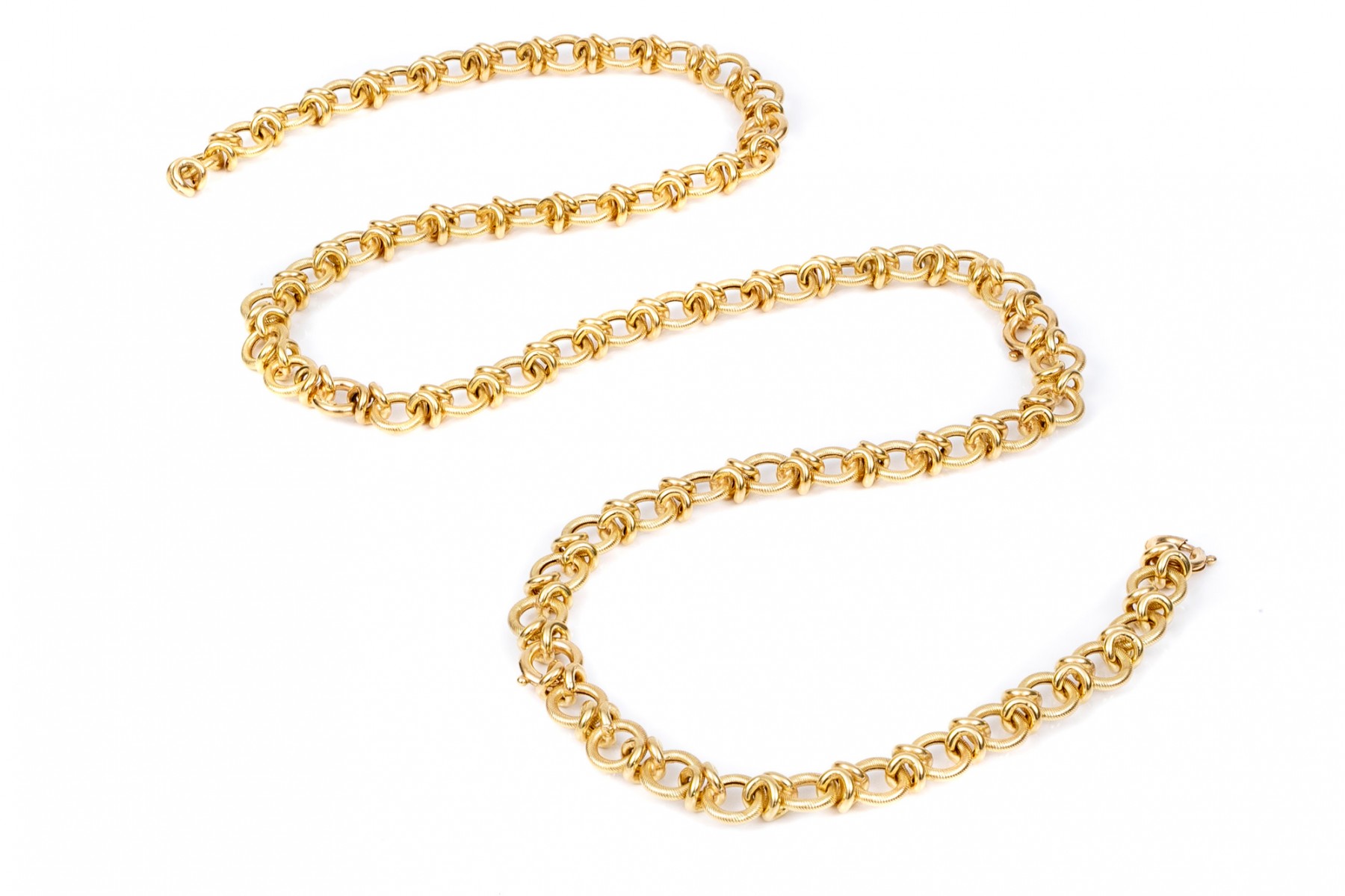 18K yellow gold necklace/bracelet set with contrasting polished and textured links. Versatile set of five bracelet length sections connect with hidden style spring ring clasps to create an 39" long opera length necklace. Wear as single necklace or disconnect to create necklace and bracelet set.