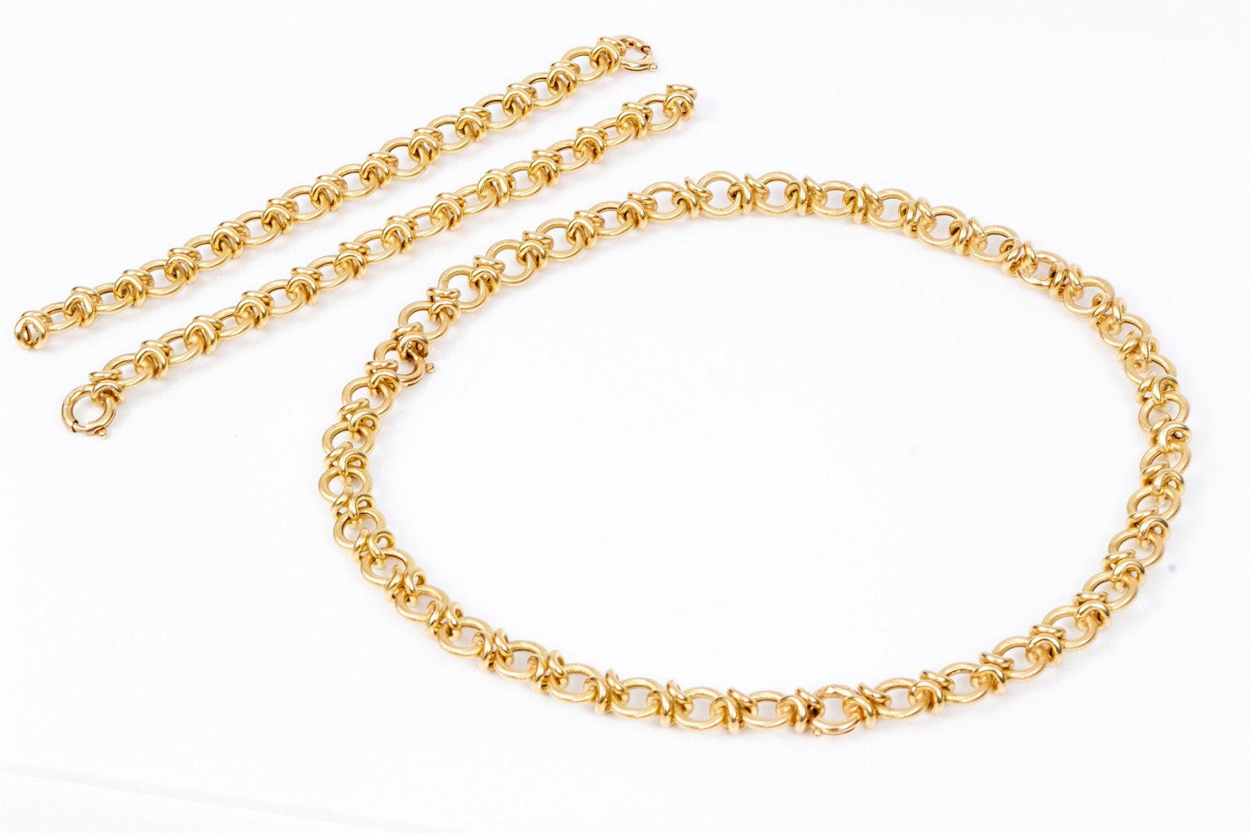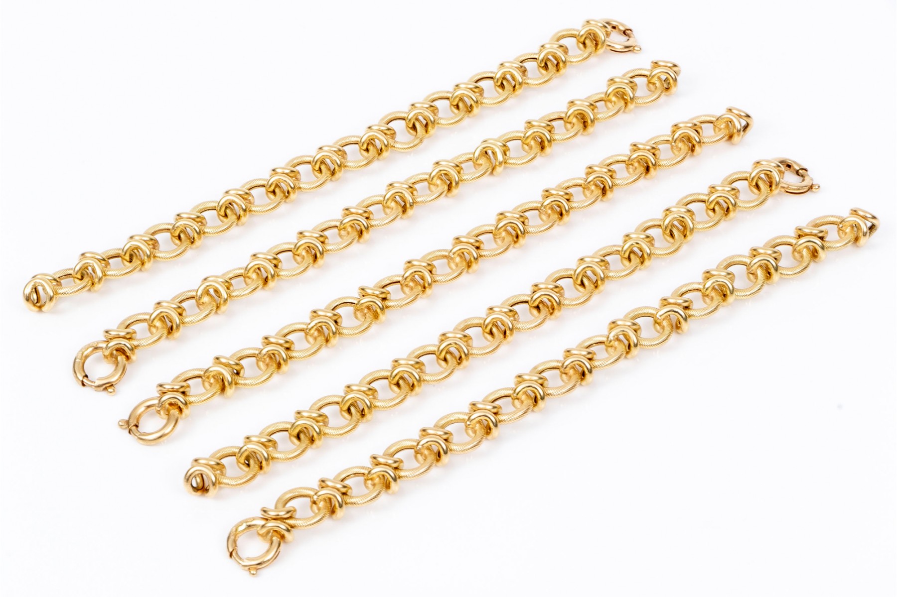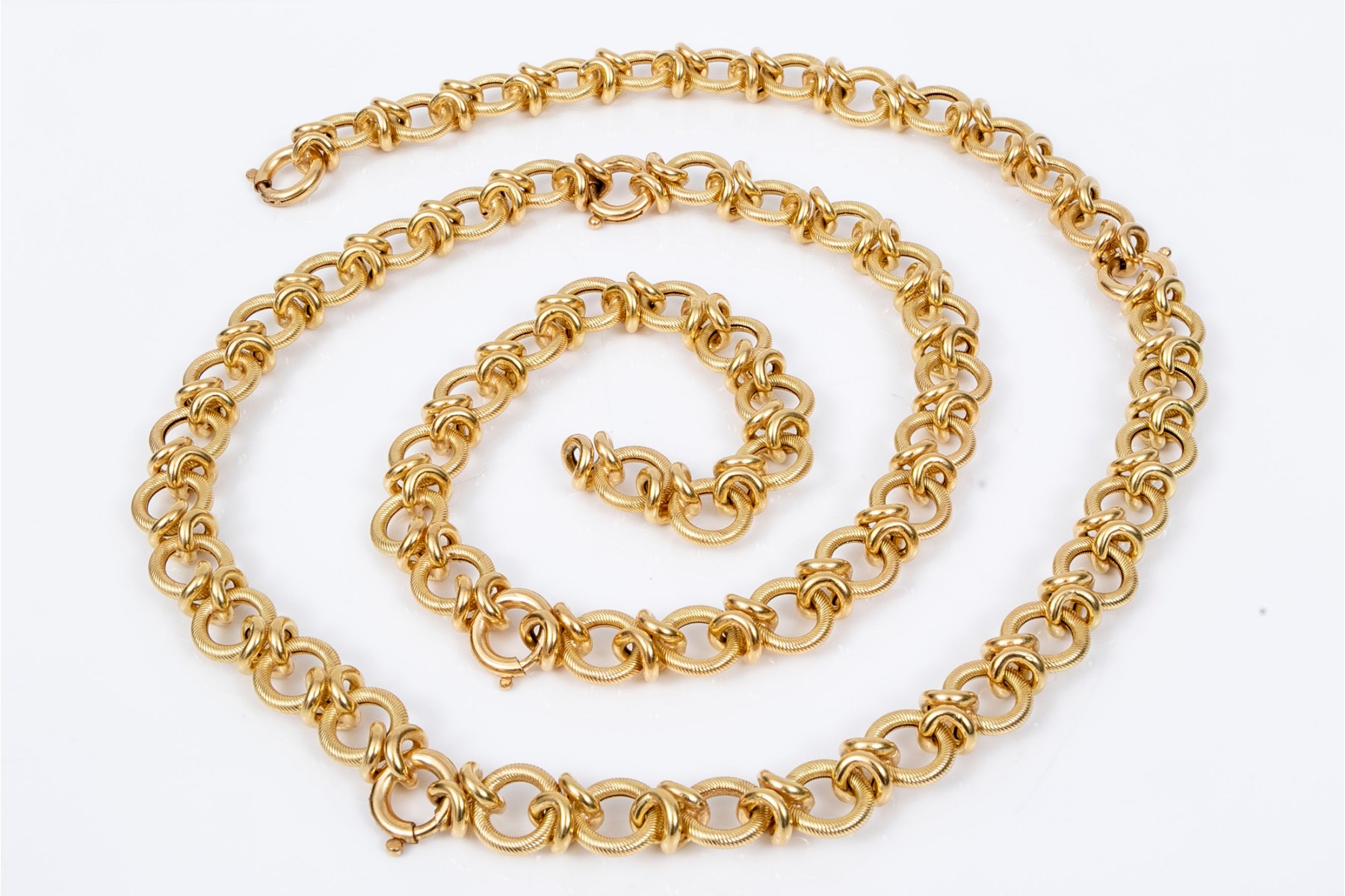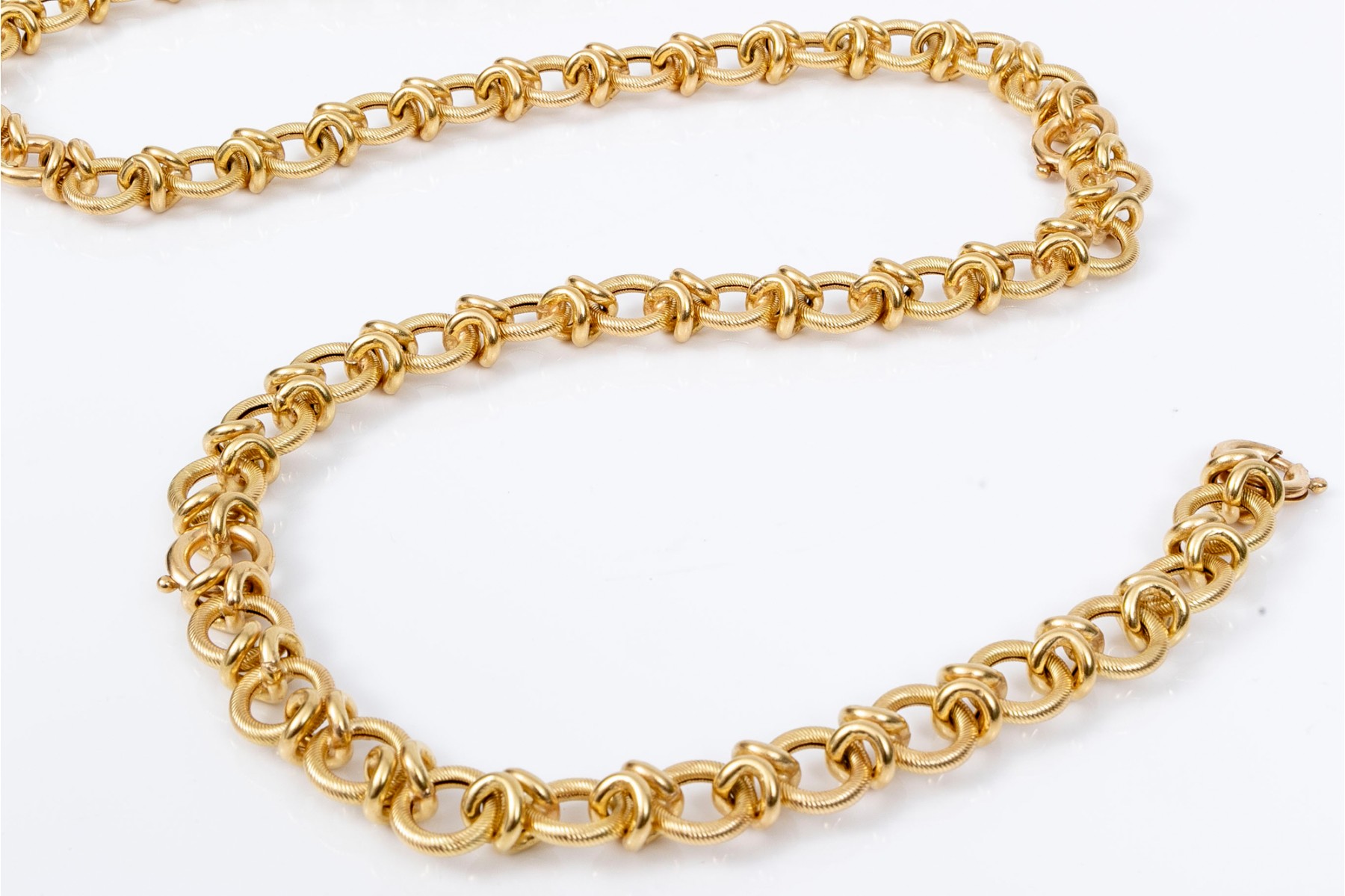 18K yellow gold necklace/bracelet set with contrasting polished and textured links. Versatile set of five bracelet length sections connect with hidden style spring ring clasps to create an 39" long opera length necklace. Wear as single necklace or disconnect to create necklace and bracelet set.