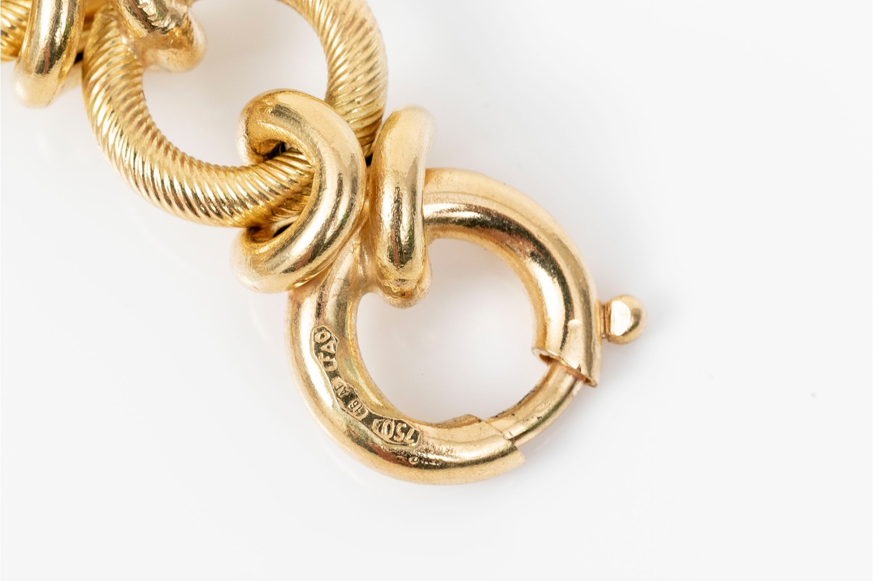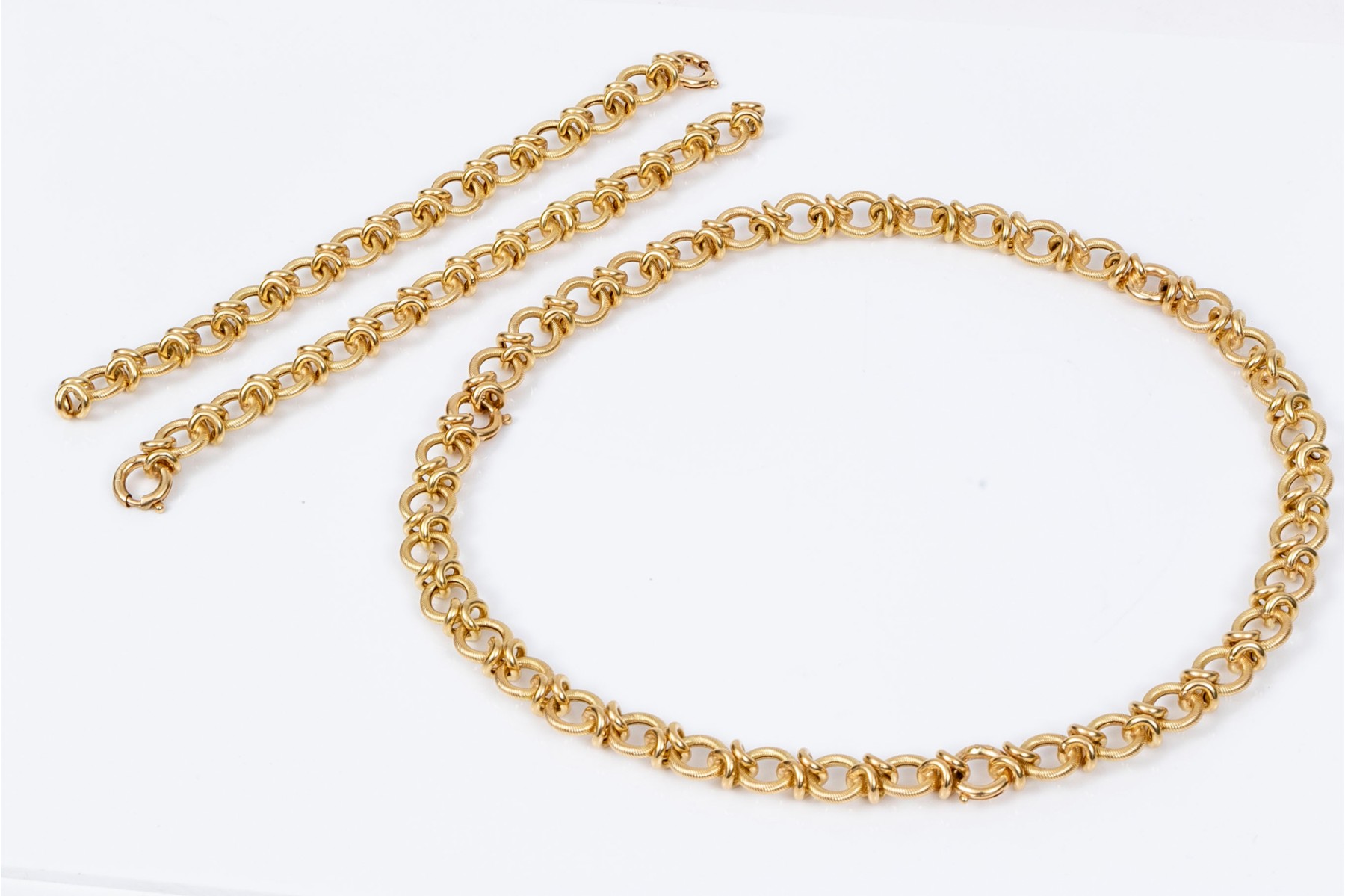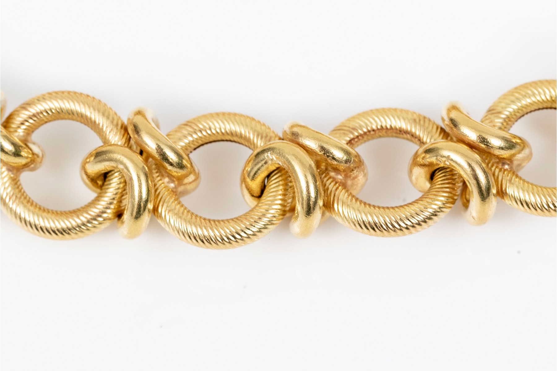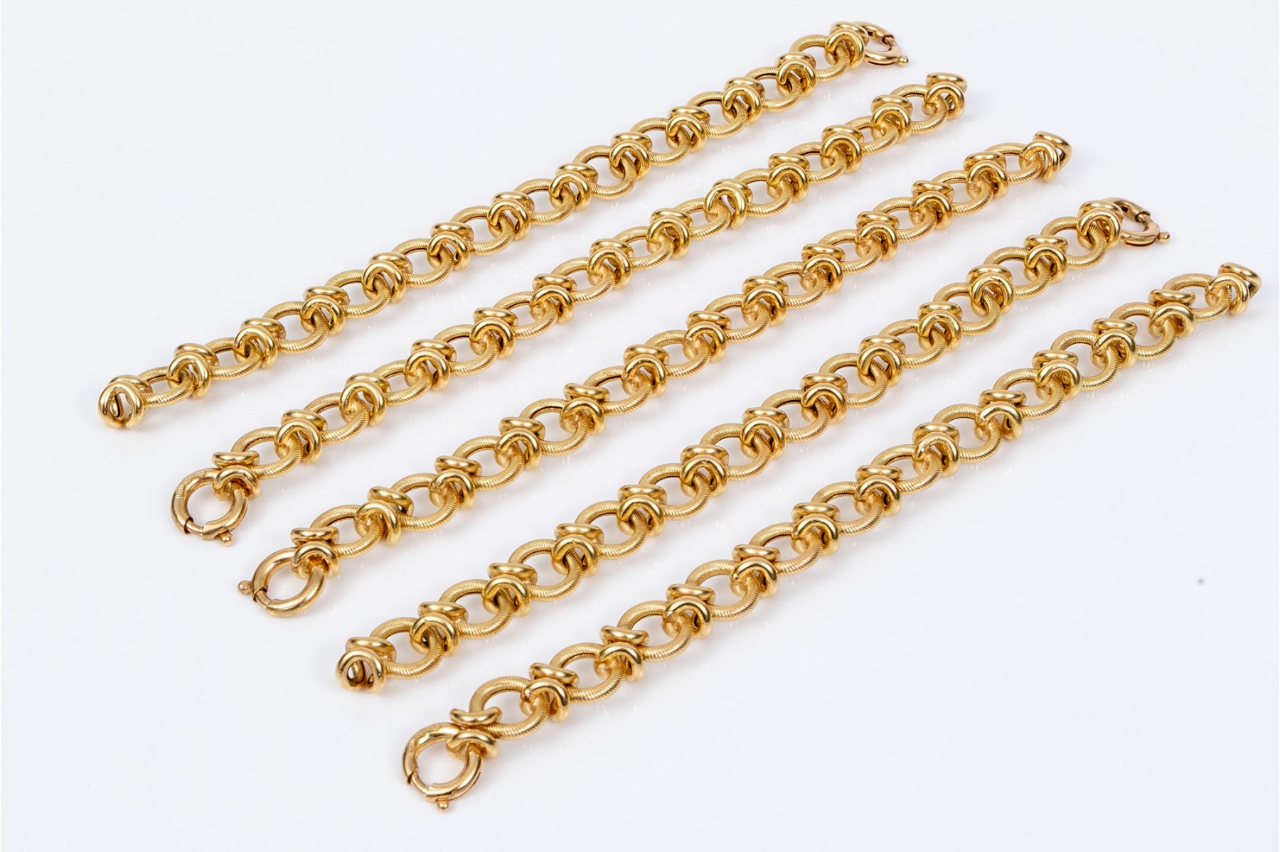 18K yellow gold necklace/bracelet set with contrasting polished and textured links. Versatile set of five bracelet length sections connect with hidden style spring ring clasps to create an 39" long opera length necklace. Wear as single necklace or disconnect to create necklace and bracelet set.
