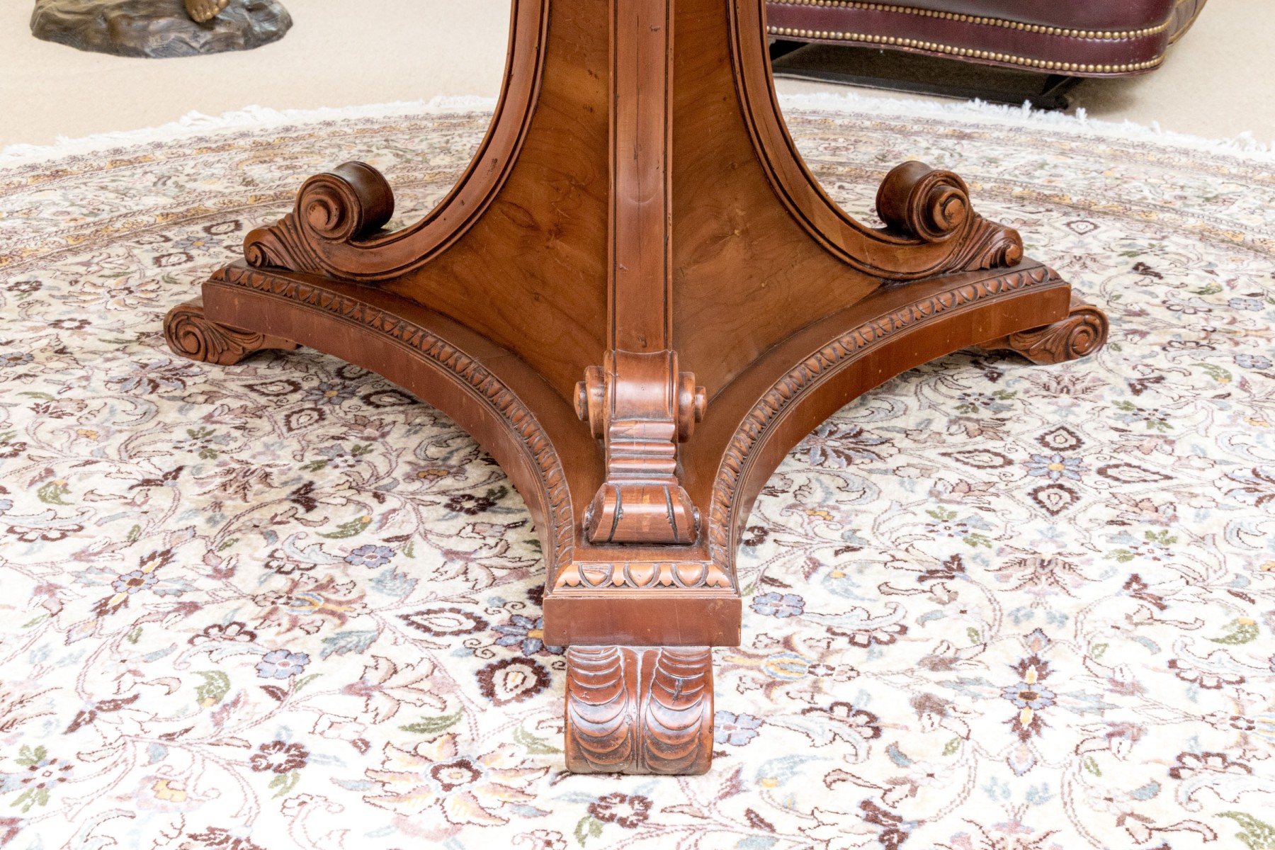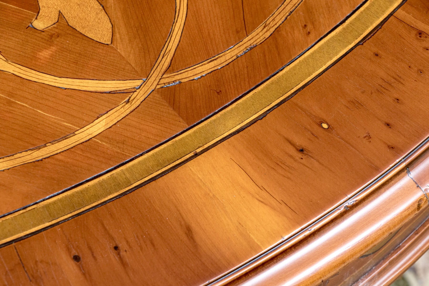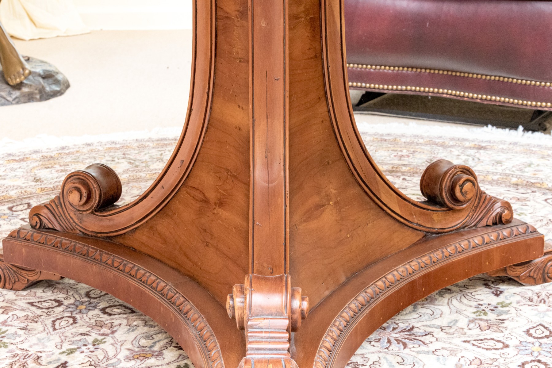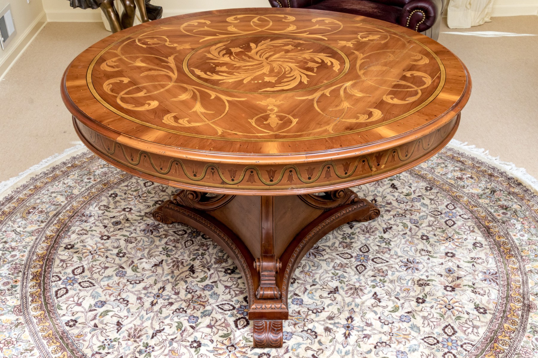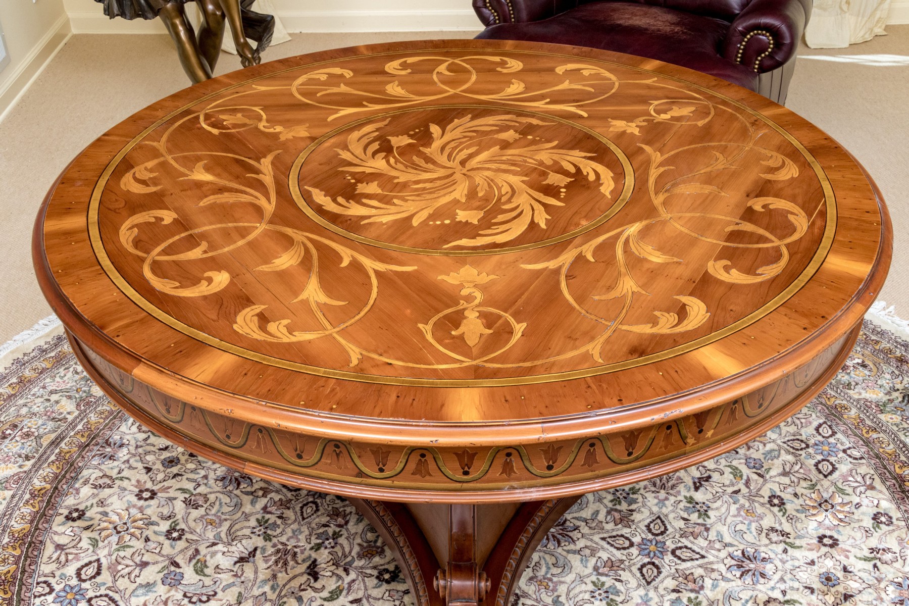 A stunning Alfonso Marina "San Marino" empire style center table in richly hued honeyed medium brown, showcasing lighter brown marquetry-styled details on the circular top depicting ornate foliate scrolls and bands. The motif is continued around the apron, incorporating a waving band with floral medallions between. Raised on a pedestal base tapering out to an elegant tripod of carved scrolls, egg and dart trims, and foliate flourishes.