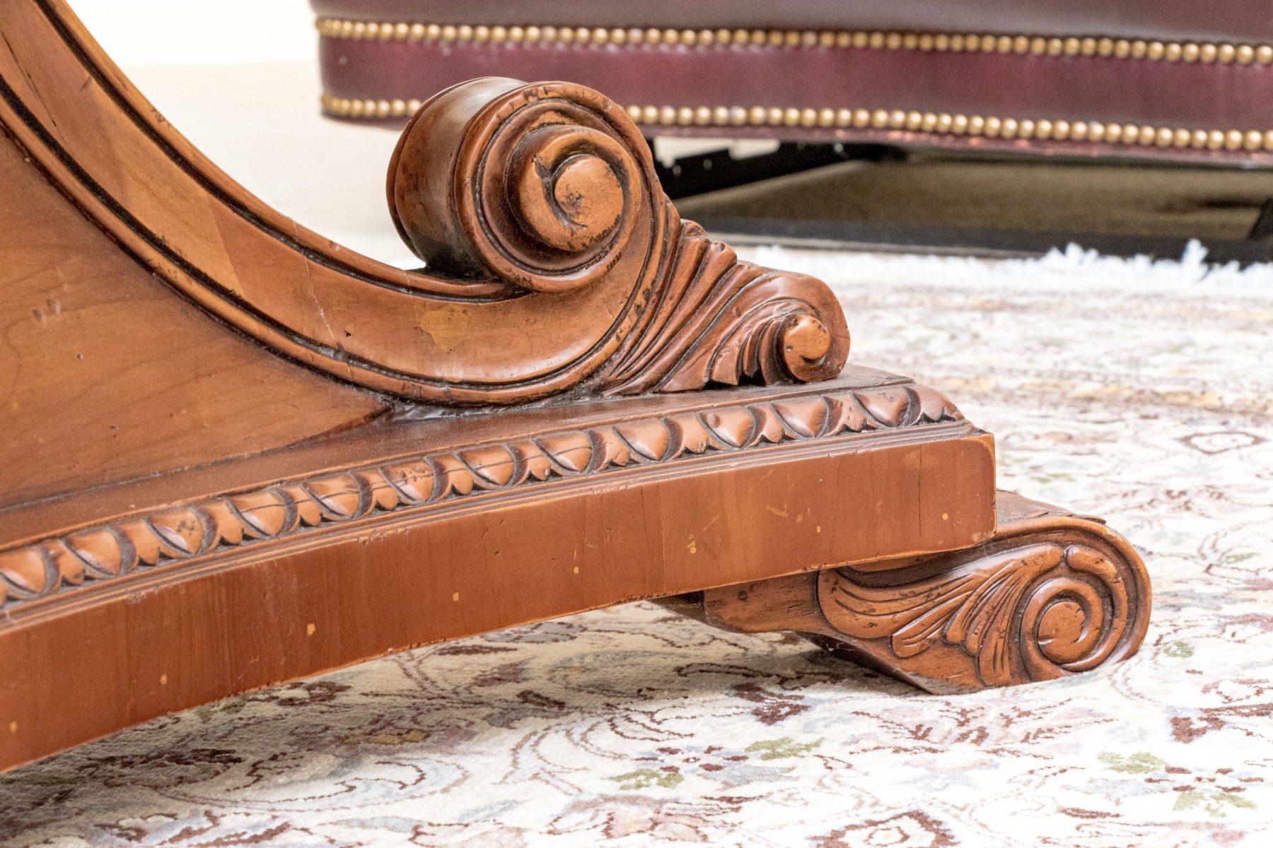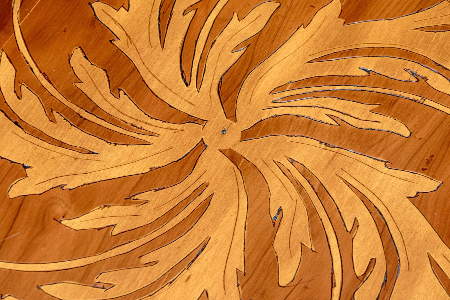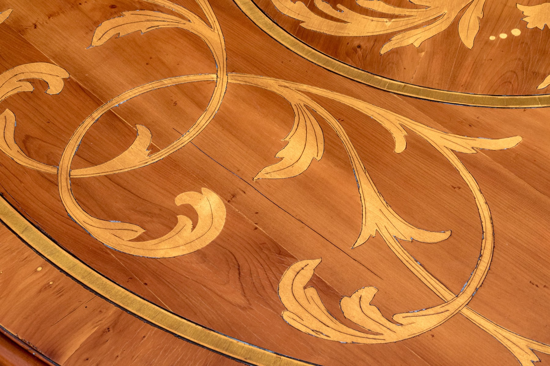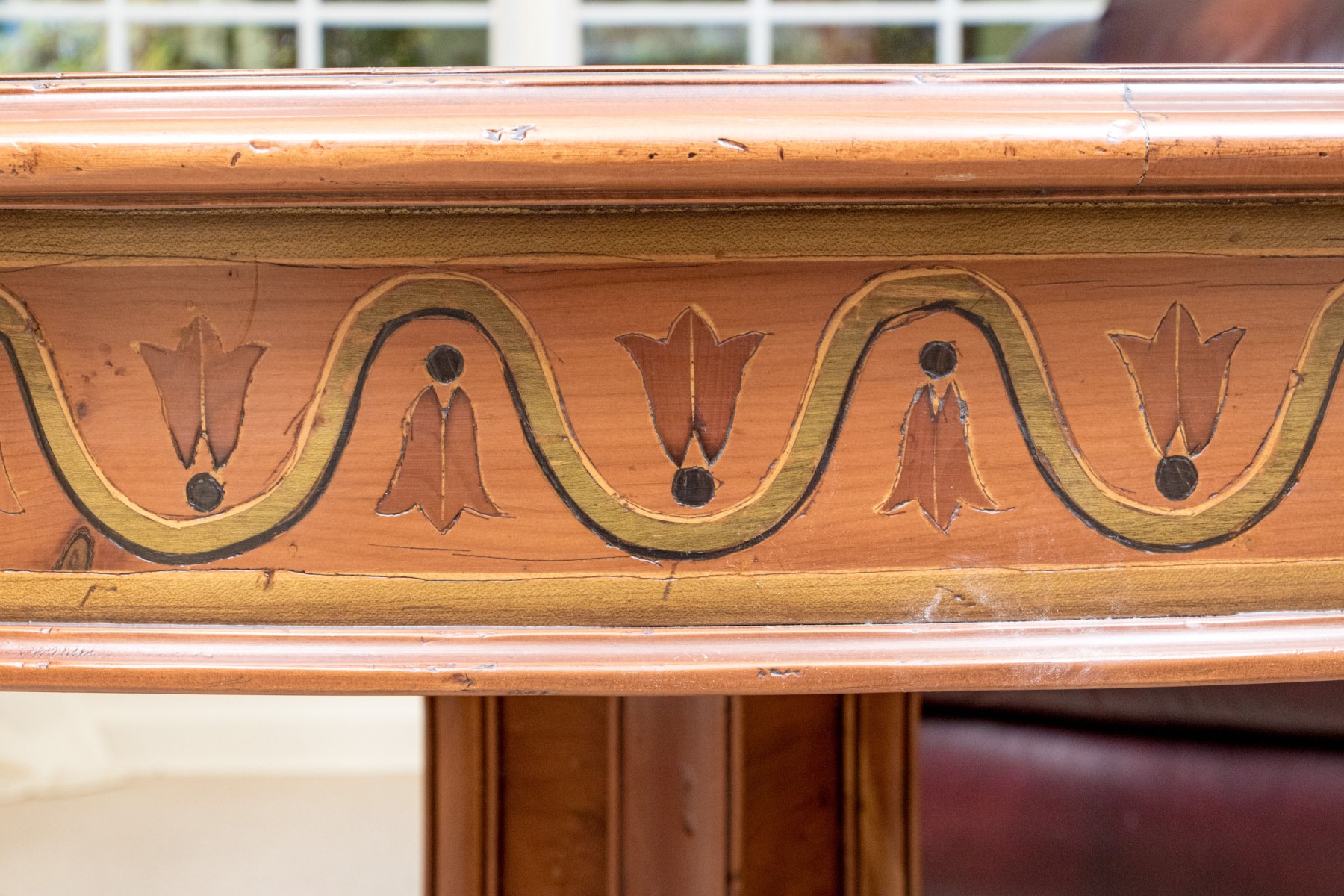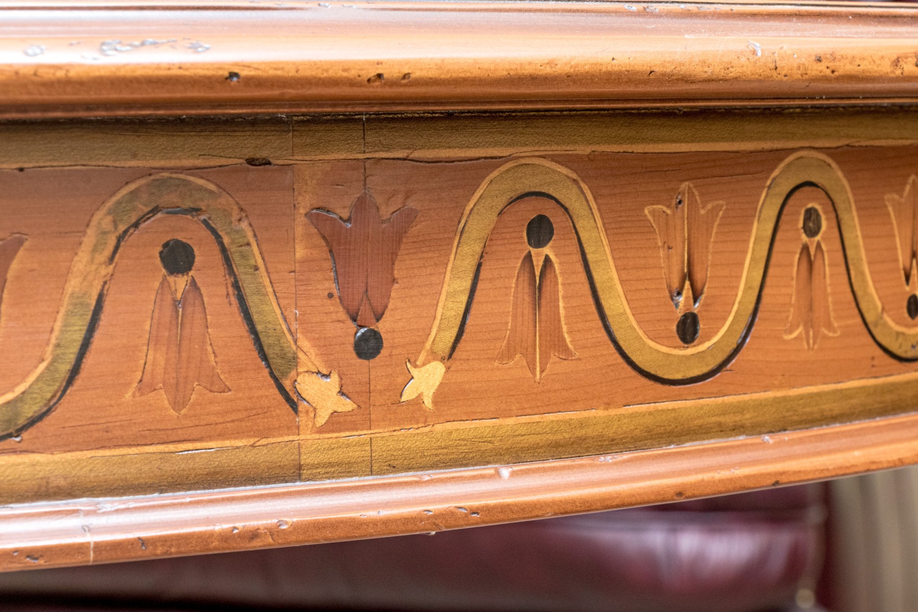 A stunning Alfonso Marina "San Marino" empire style center table in richly hued honeyed medium brown, showcasing lighter brown marquetry-styled details on the circular top depicting ornate foliate scrolls and bands. The motif is continued around the apron, incorporating a waving band with floral medallions between. Raised on a pedestal base tapering out to an elegant tripod of carved scrolls, egg and dart trims, and foliate flourishes.