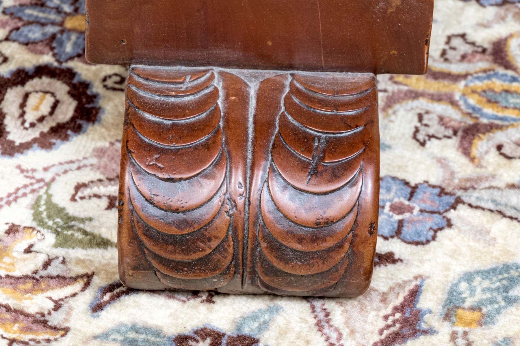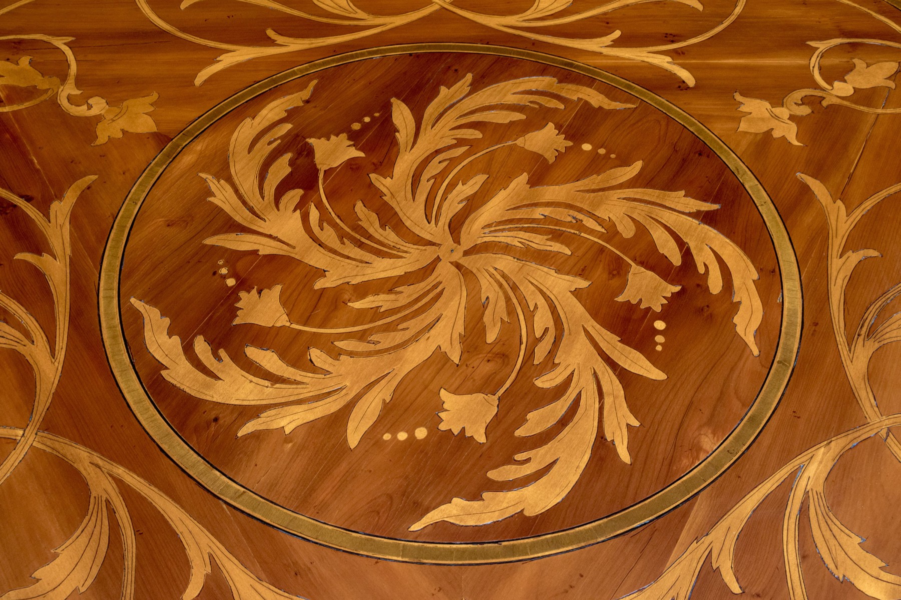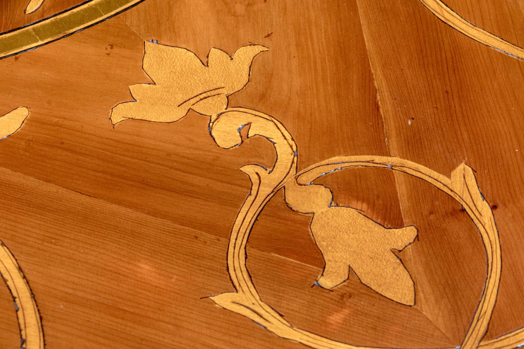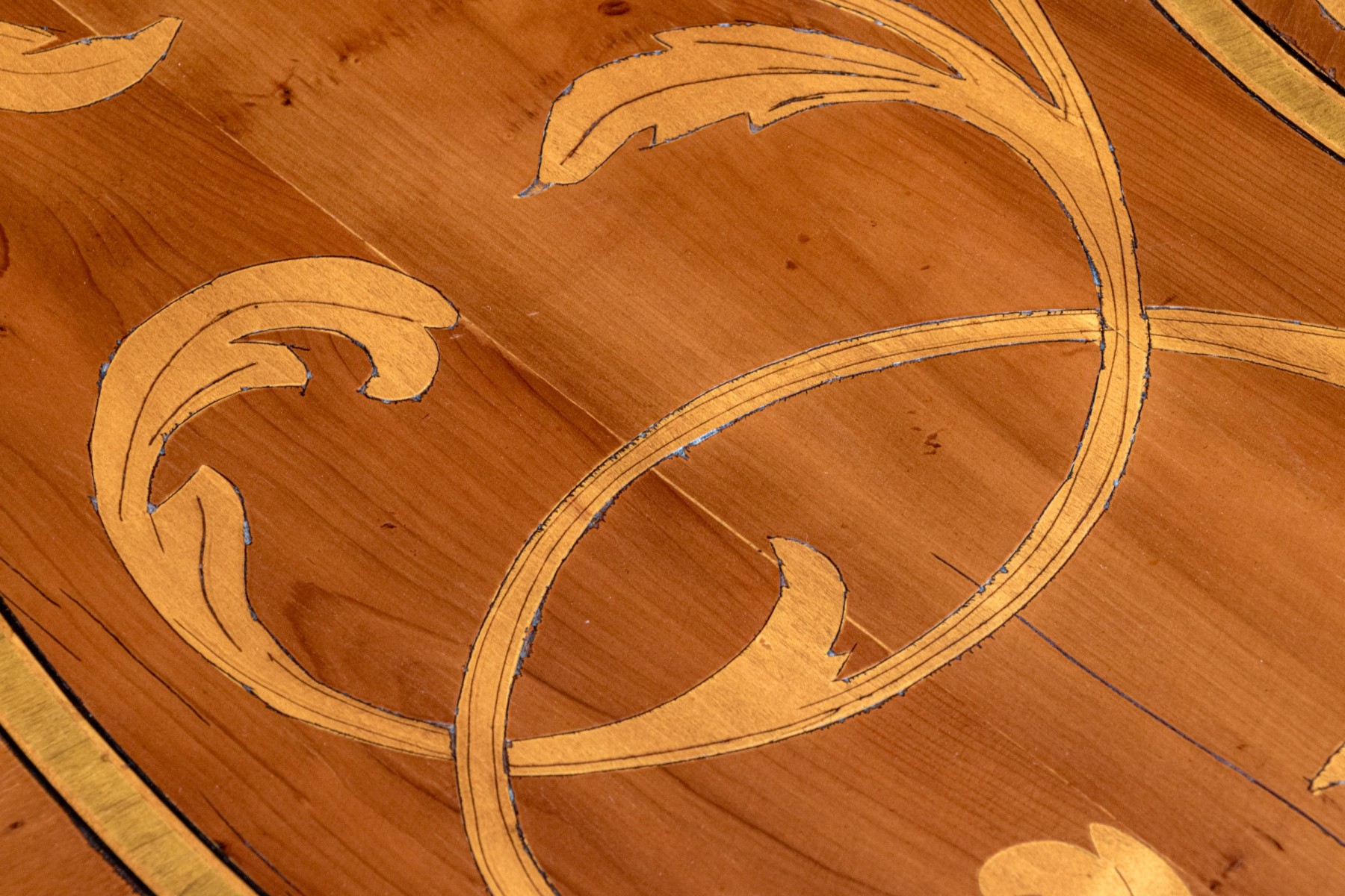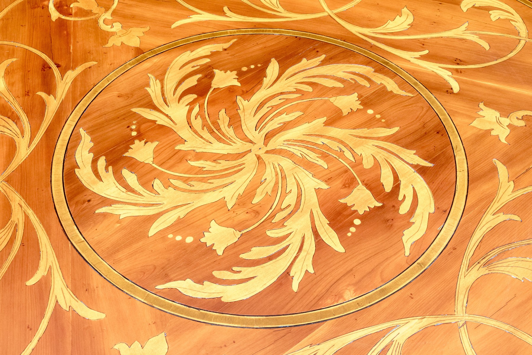 A stunning Alfonso Marina "San Marino" empire style center table in richly hued honeyed medium brown, showcasing lighter brown marquetry-styled details on the circular top depicting ornate foliate scrolls and bands. The motif is continued around the apron, incorporating a waving band with floral medallions between. Raised on a pedestal base tapering out to an elegant tripod of carved scrolls, egg and dart trims, and foliate flourishes.