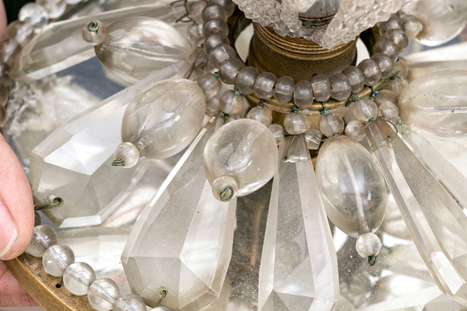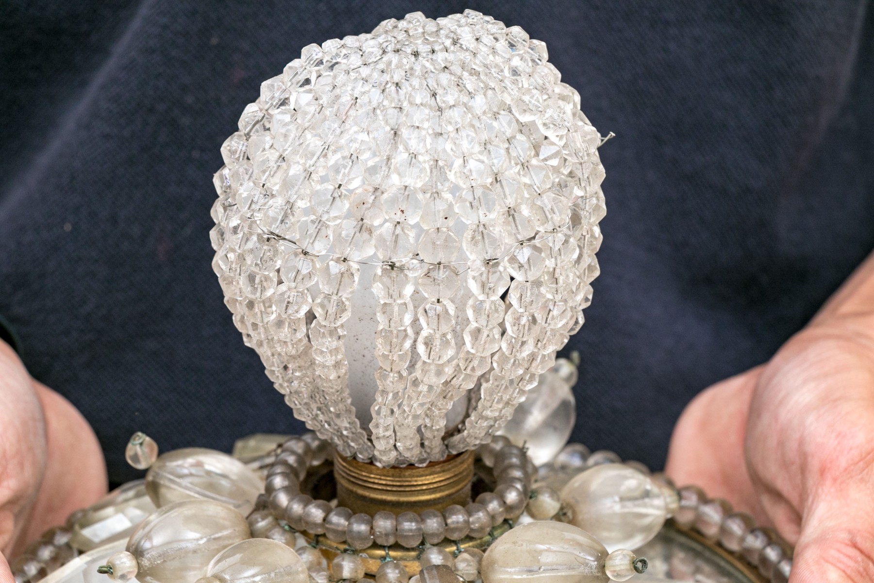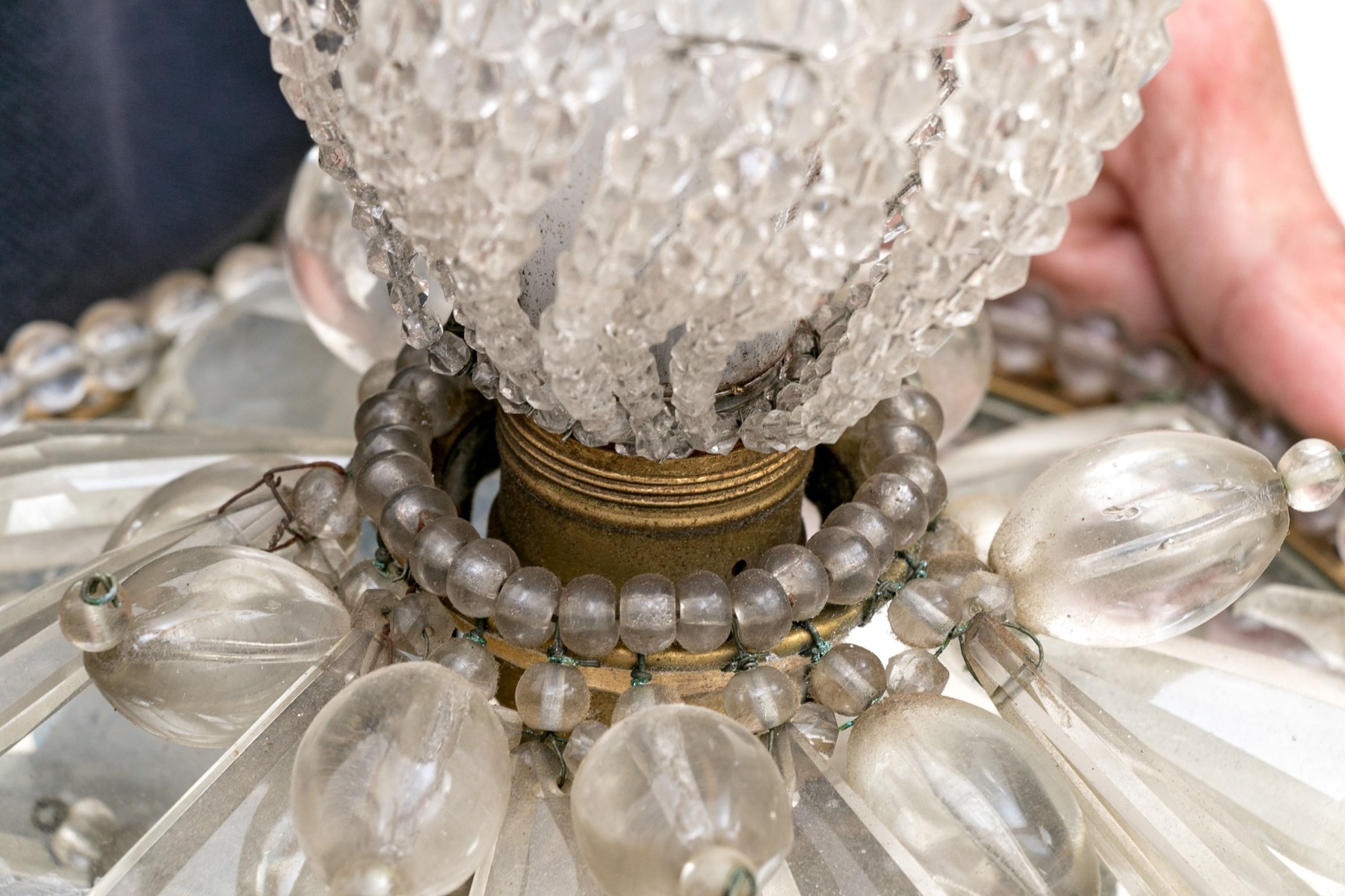 A stunning Antique French Empire Flushmount Ceiling Fixture featuring a crystal-beaded strung finial supported by a round plate adorned with beaded and faceted cut crystal pendants.