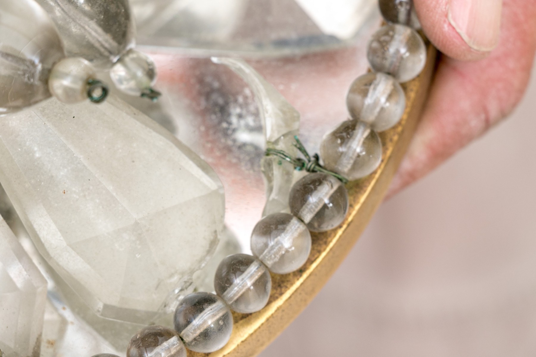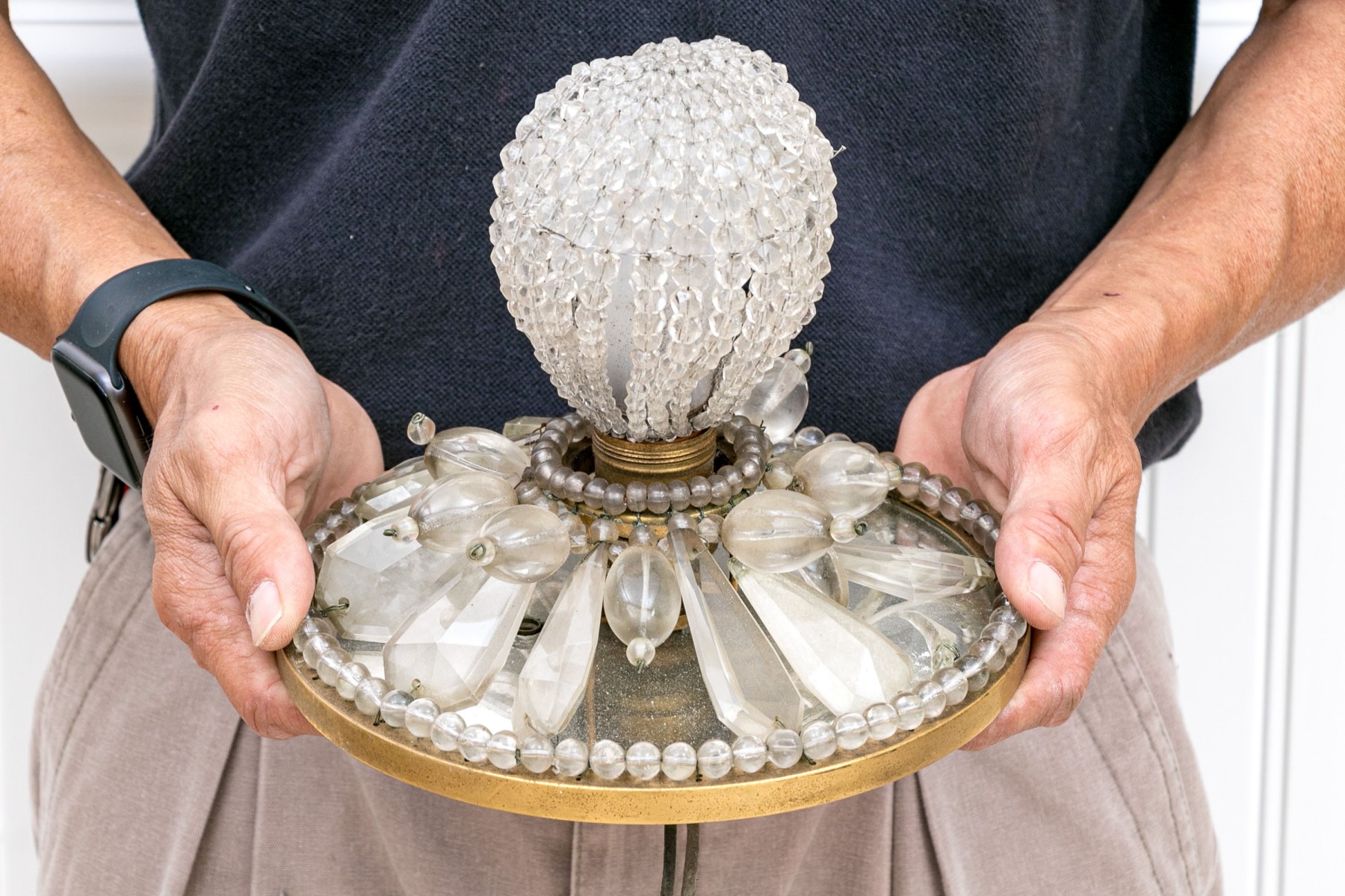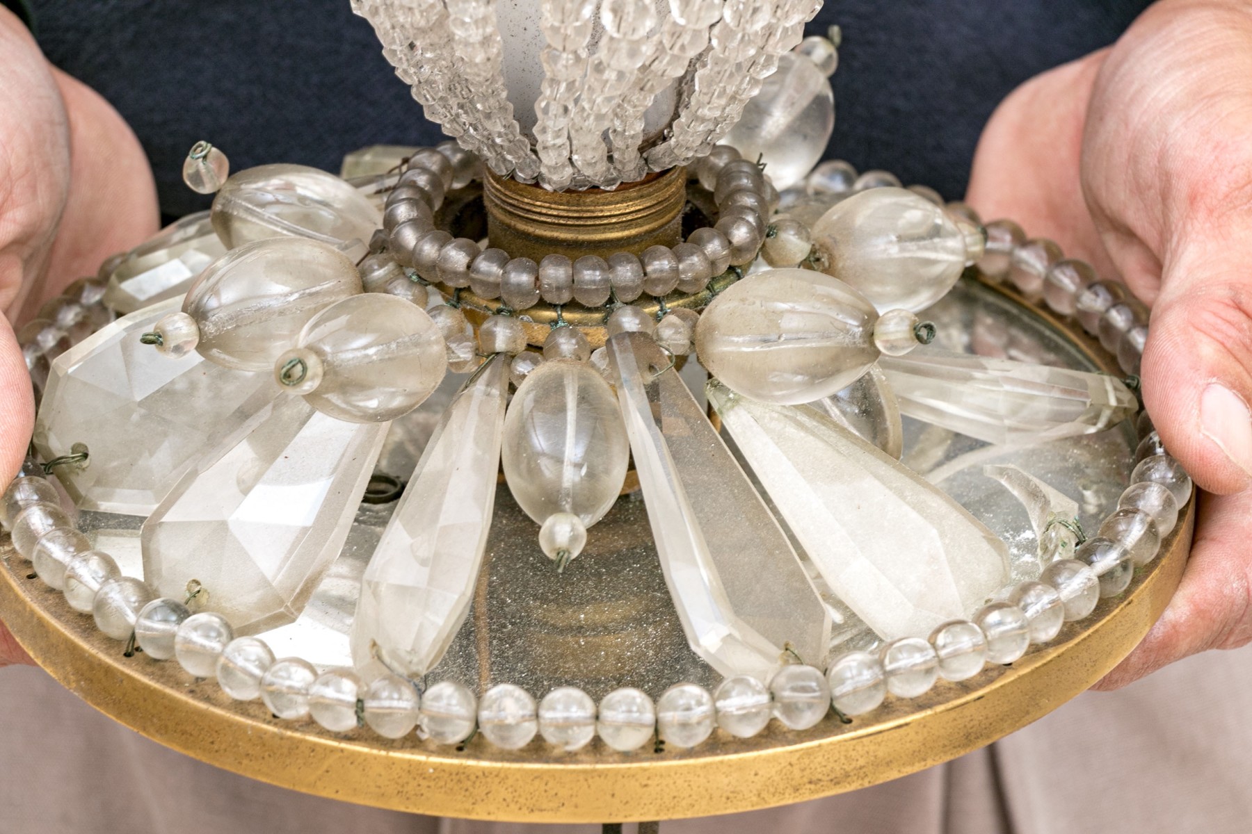 A stunning Antique French Empire Flushmount Ceiling Fixture featuring a crystal-beaded strung finial supported by a round plate adorned with beaded and faceted cut crystal pendants.