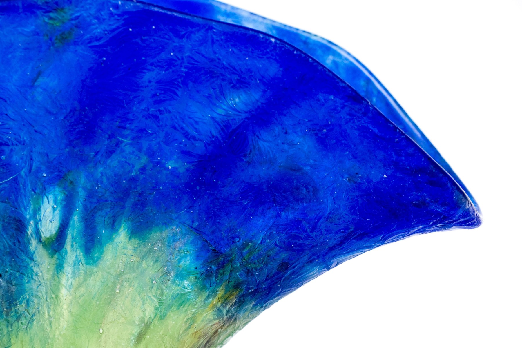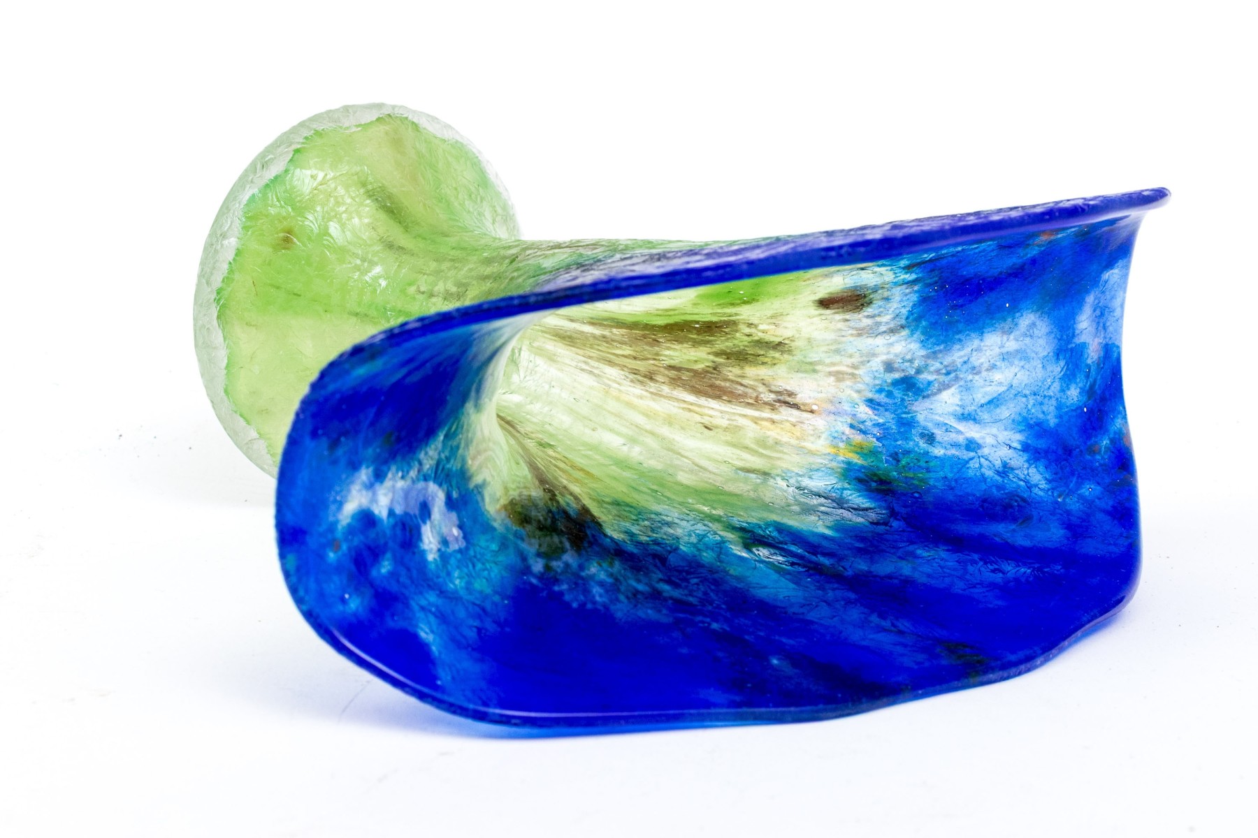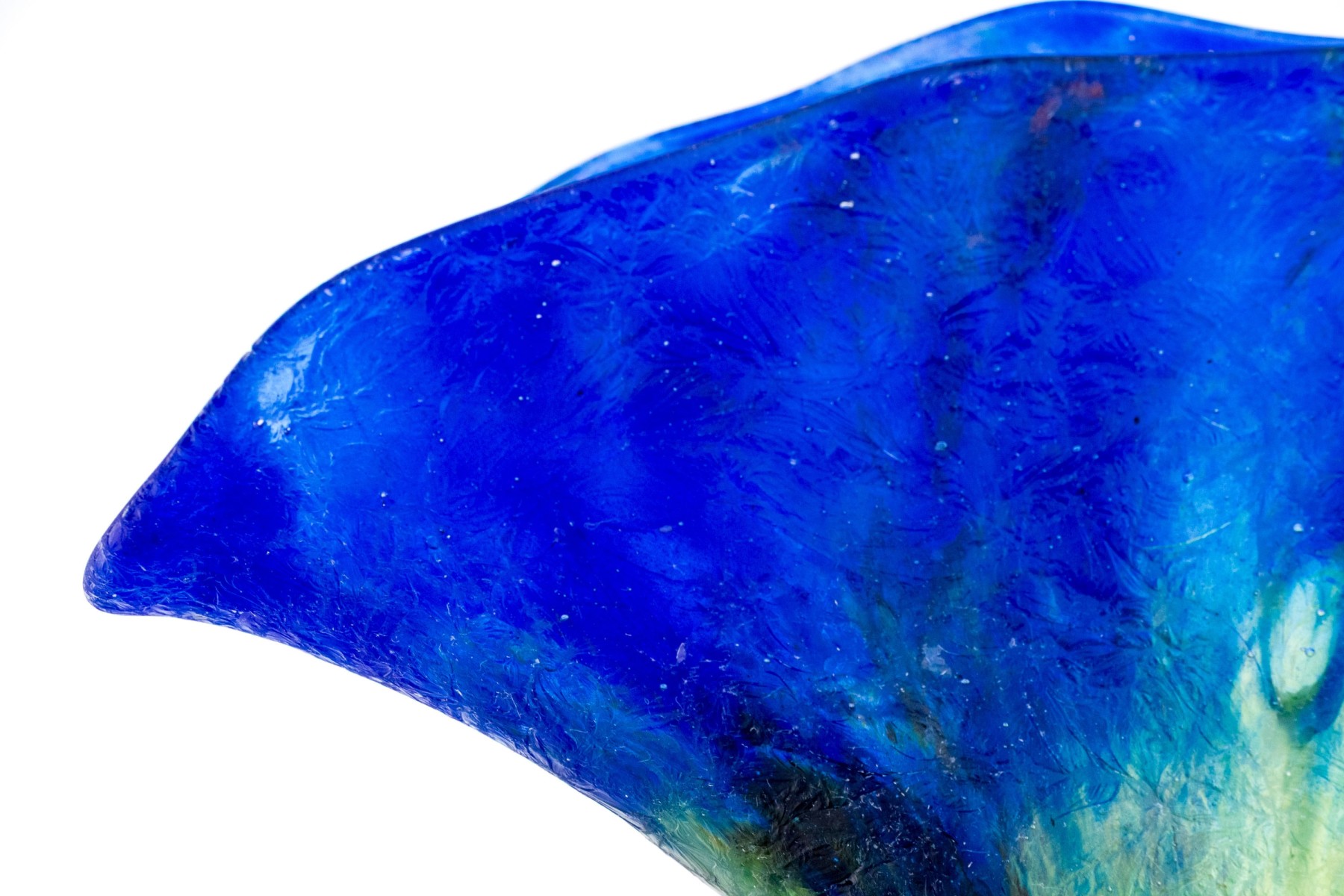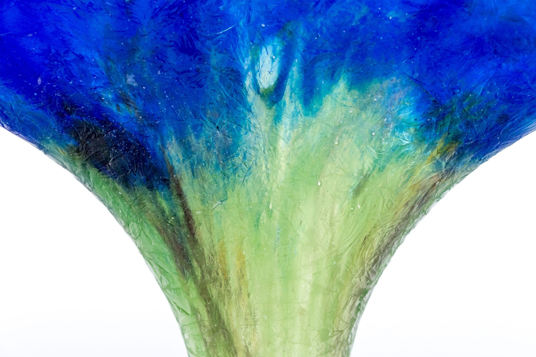 A stunning artisanal art glass vase with a stylish abstract floral design showcasing a wide fanned cobalt blue top with a gently undulating rim dramatically tapering down to a green conical neck with a circular foot.