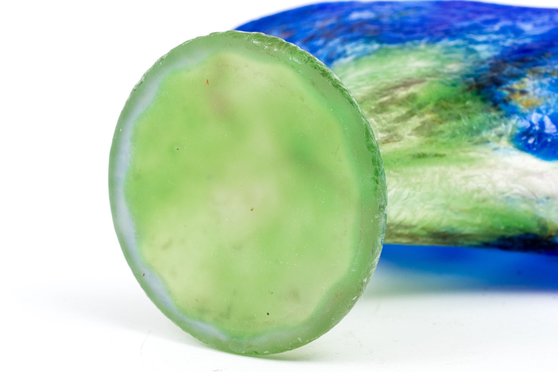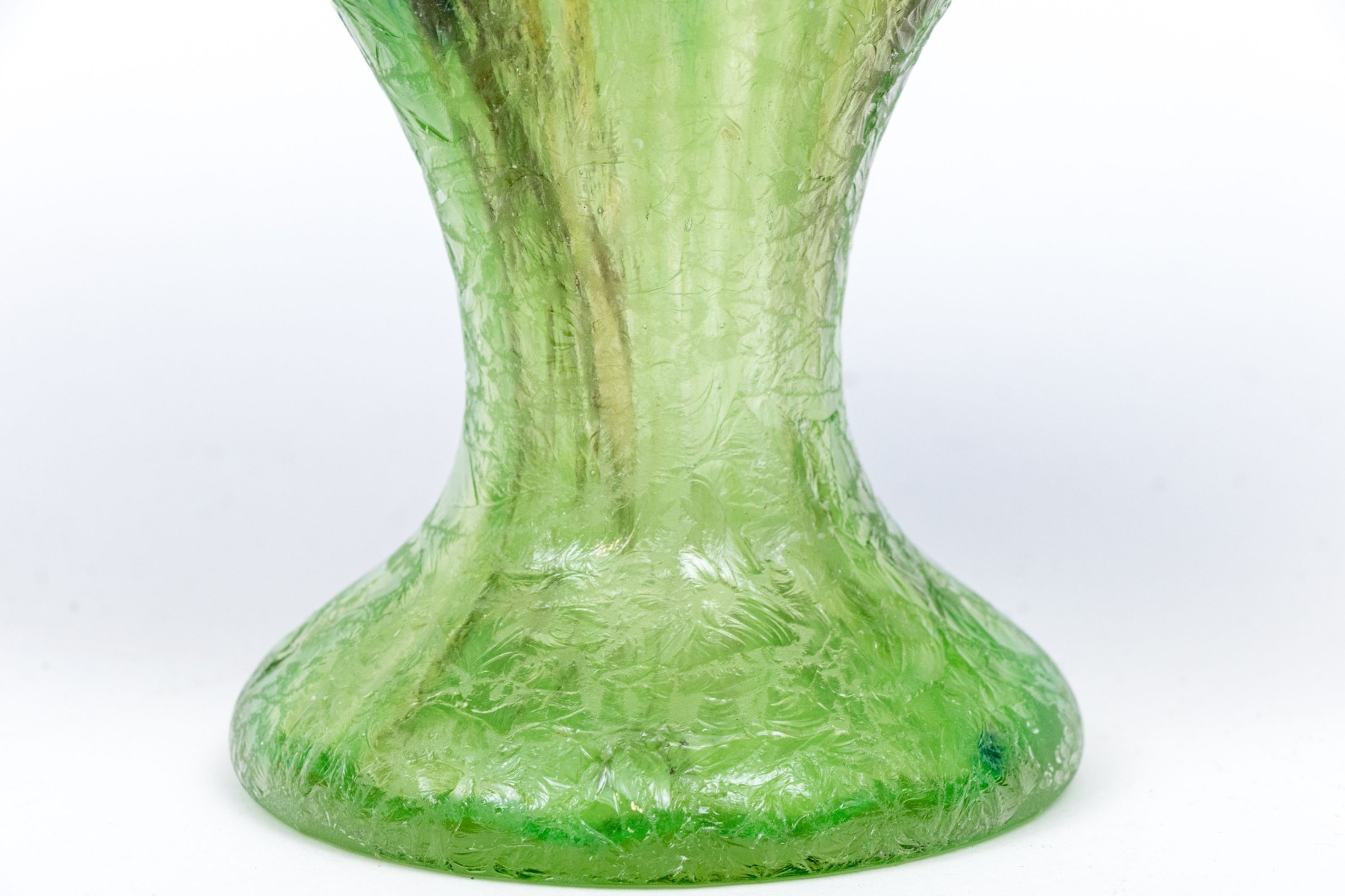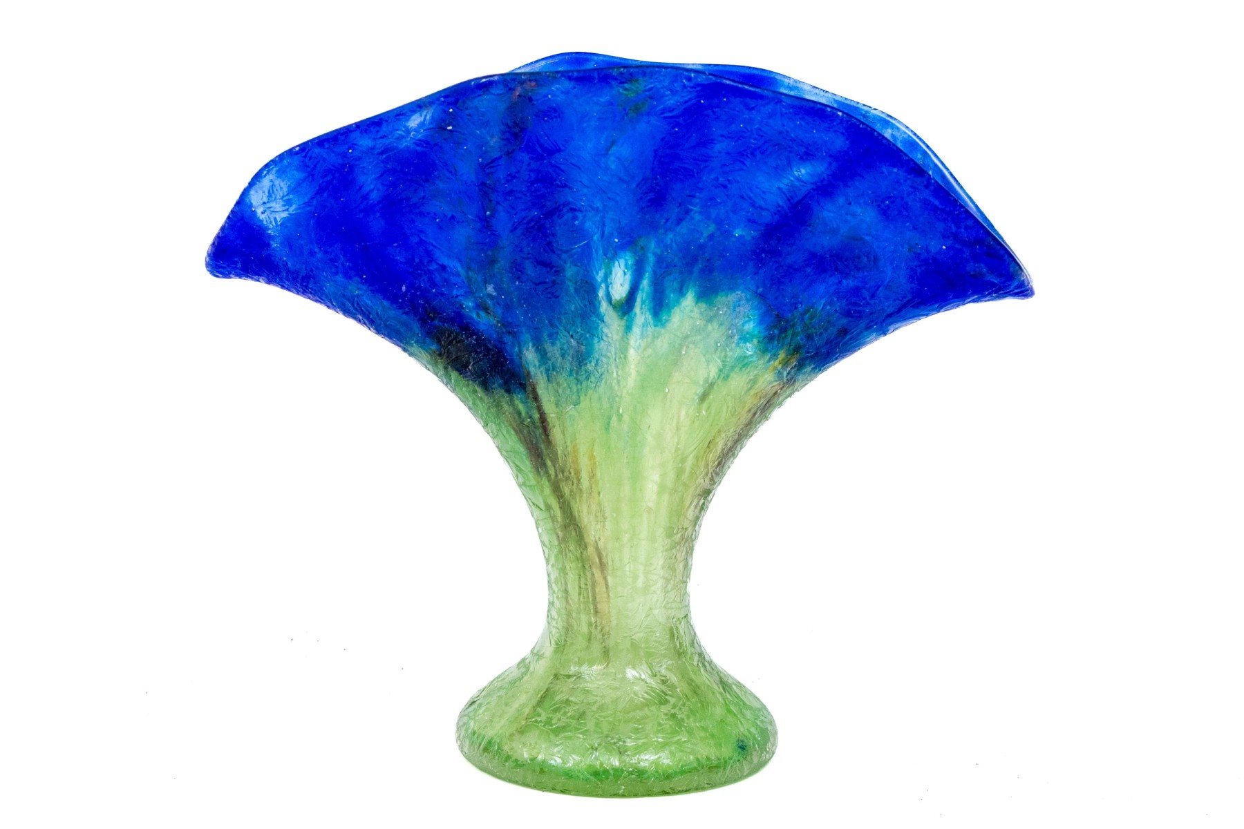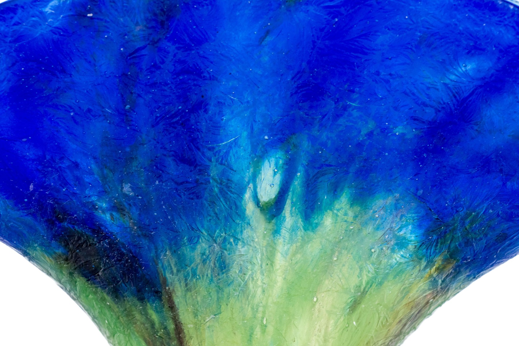 A stunning artisanal art glass vase with a stylish abstract floral design showcasing a wide fanned cobalt blue top with a gently undulating rim dramatically tapering down to a green conical neck with a circular foot.
