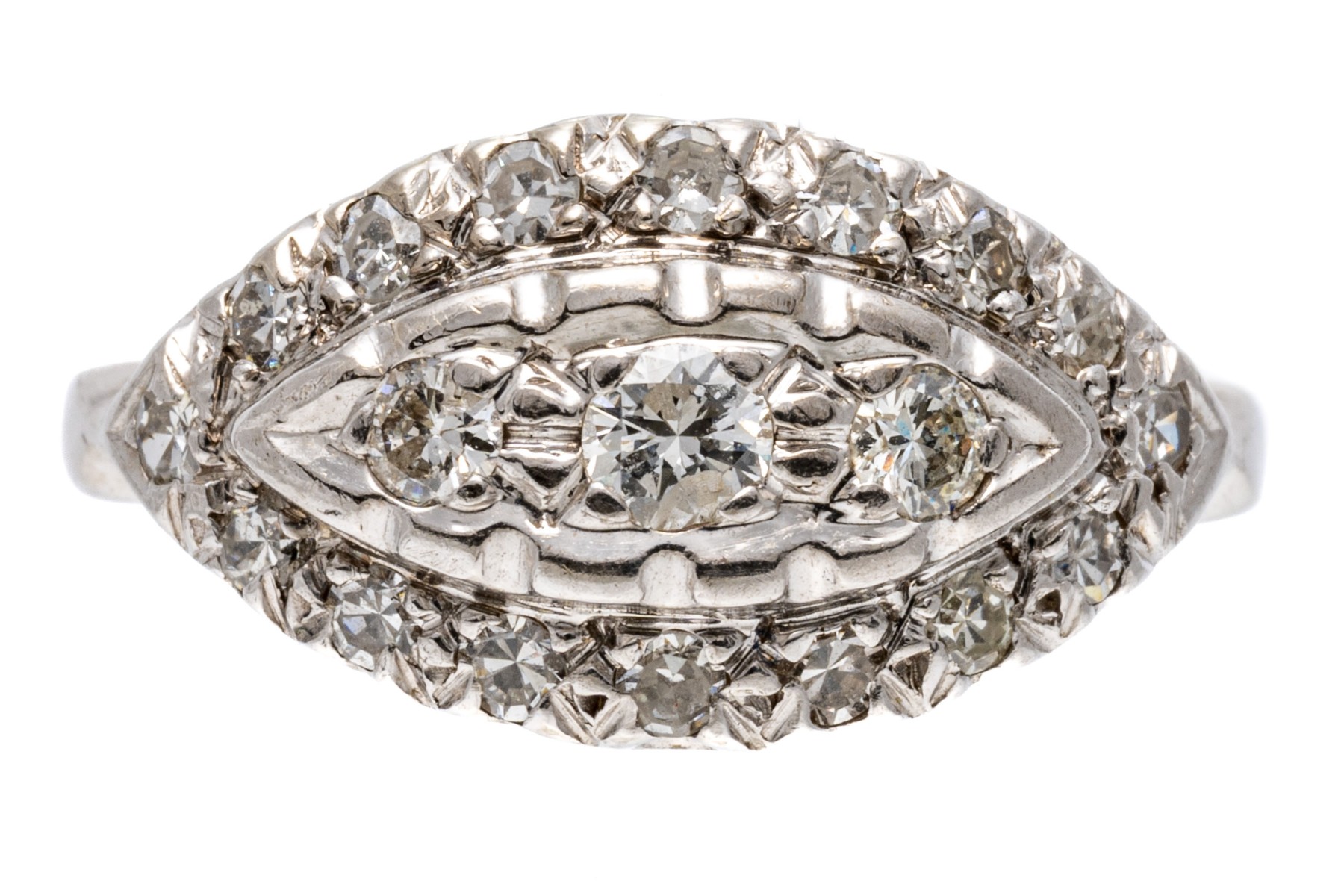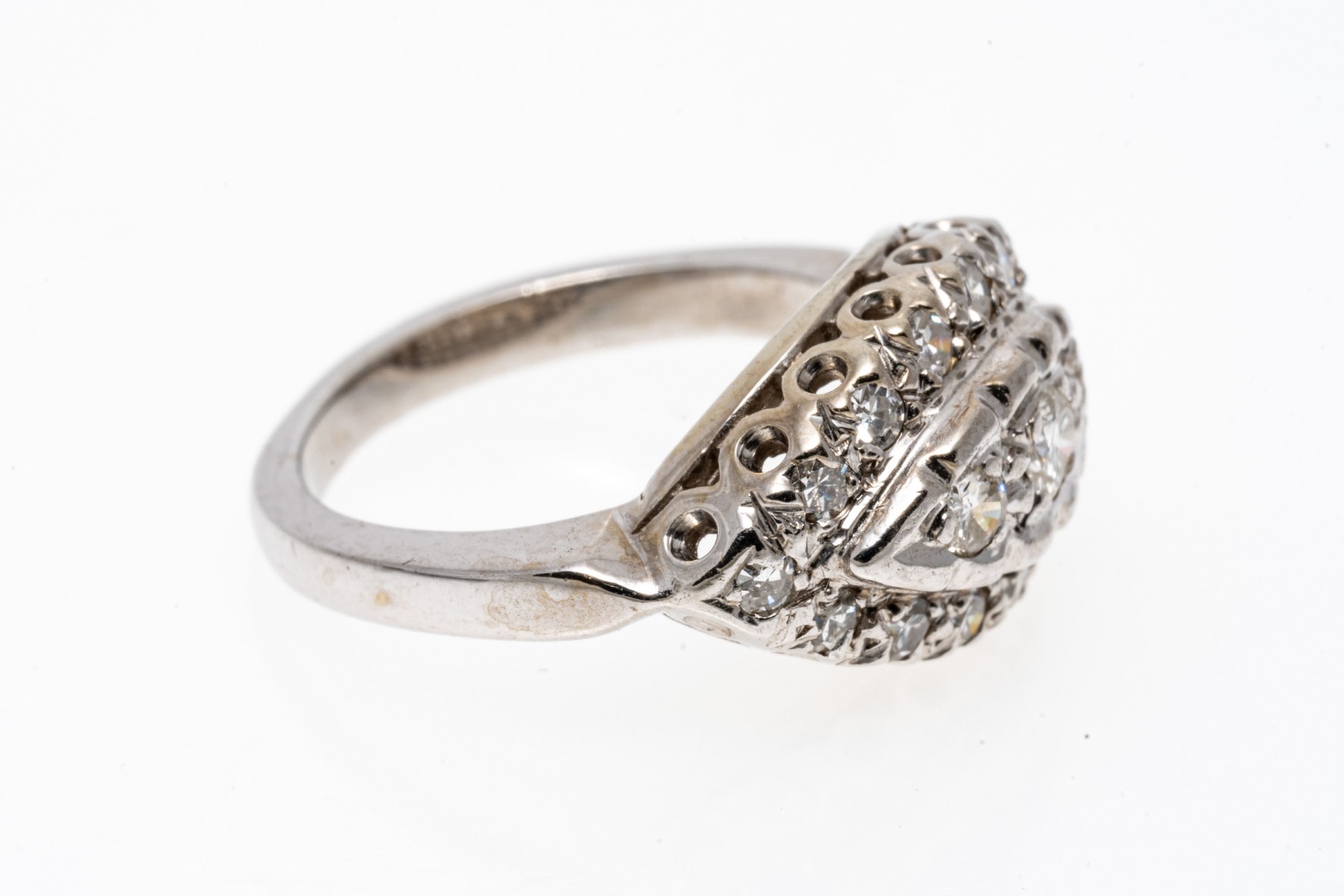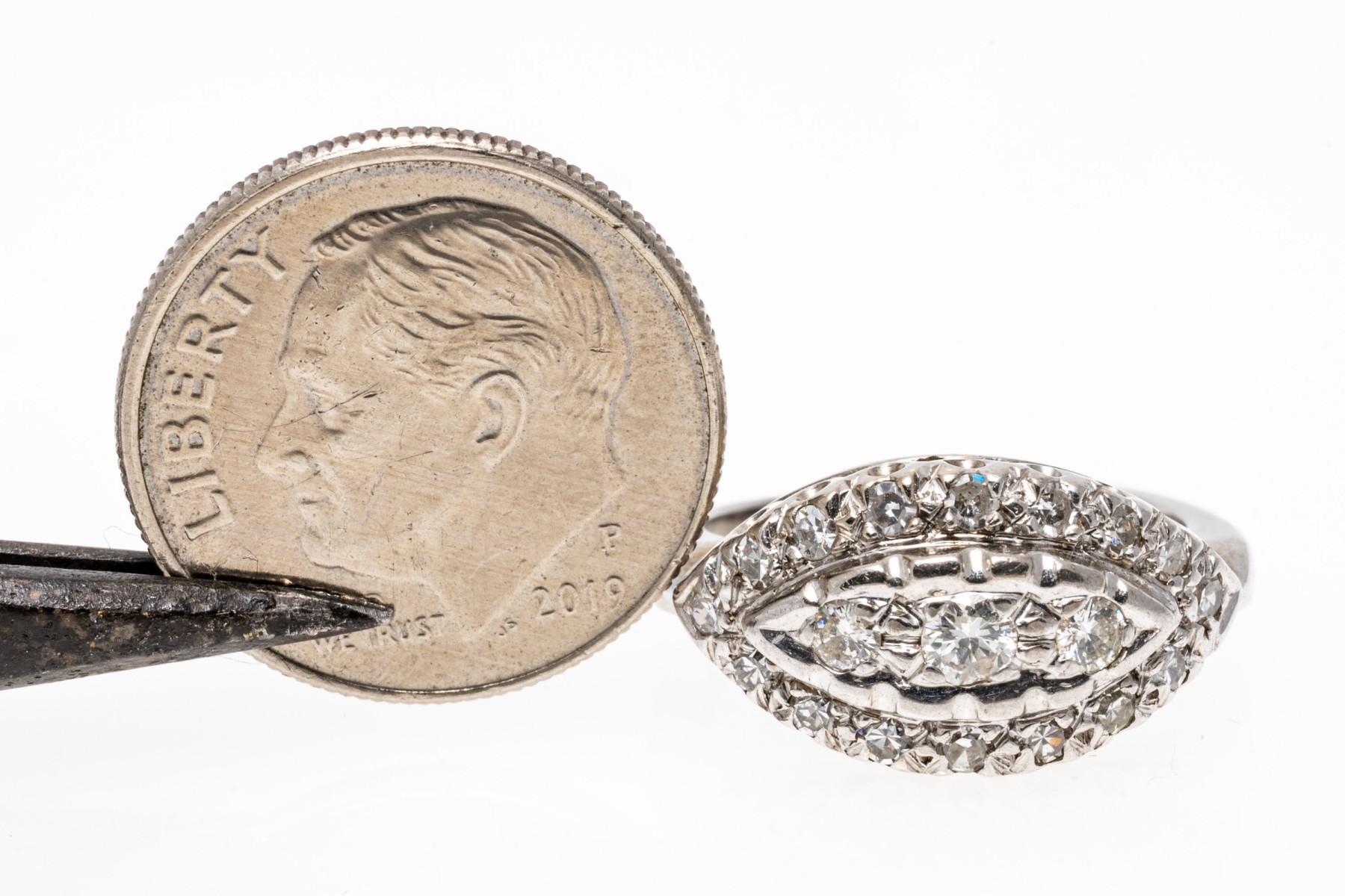 Bright diamond set 14K white old ring. The ring is set with round and round brilliant cut diamonds. The diamonds are approximately 0.44 TCW. Ring size 3.