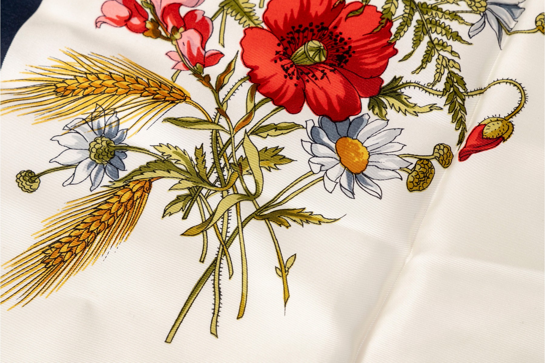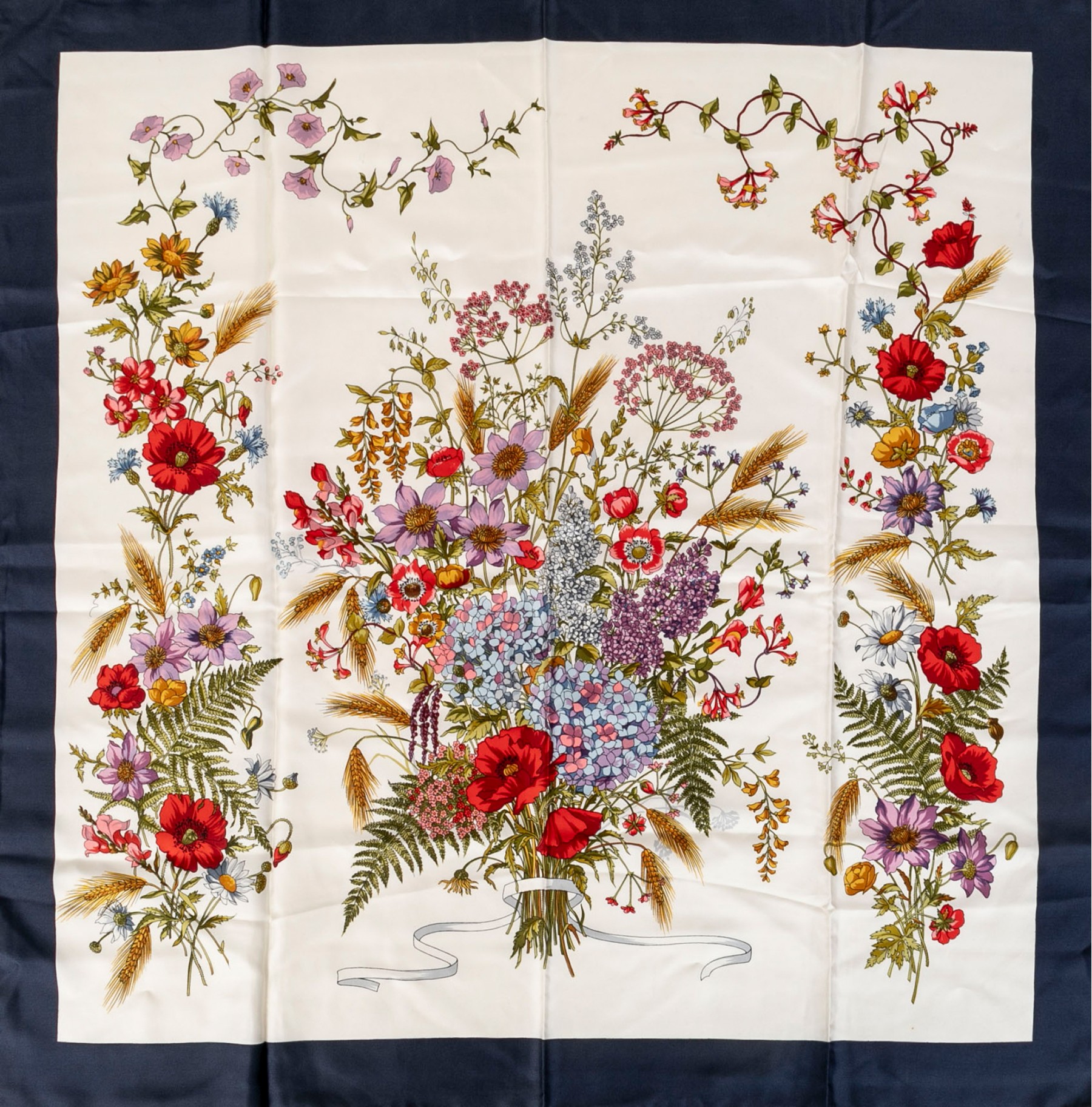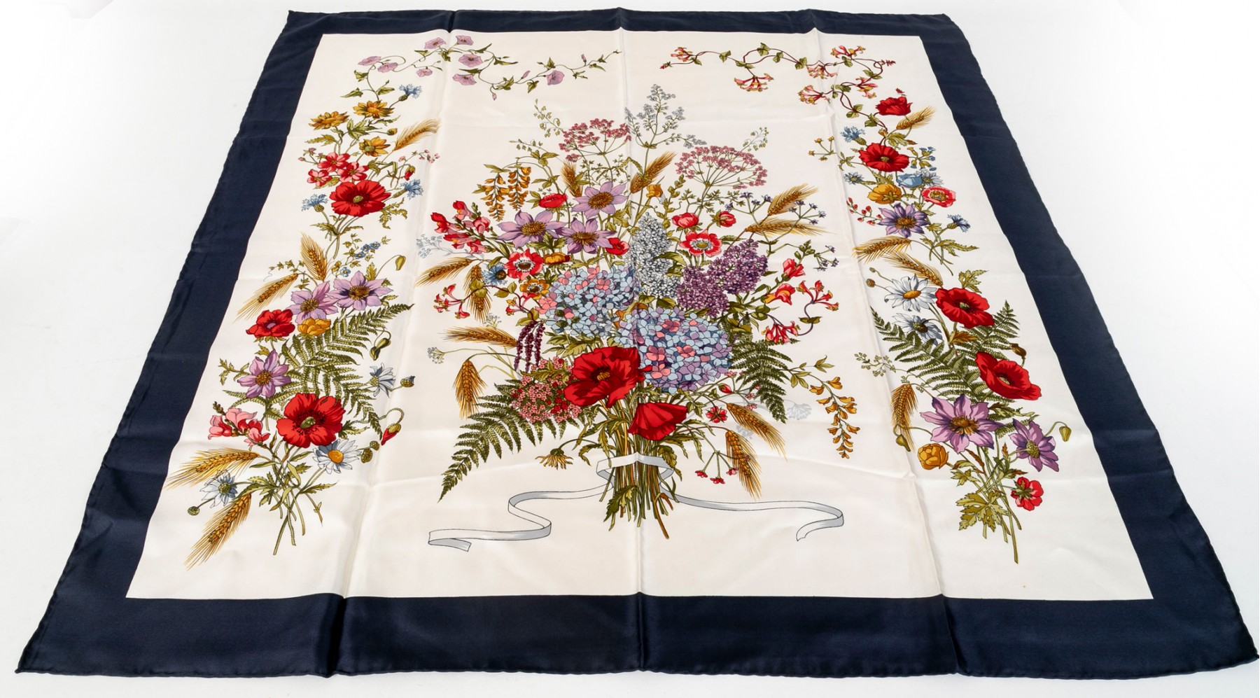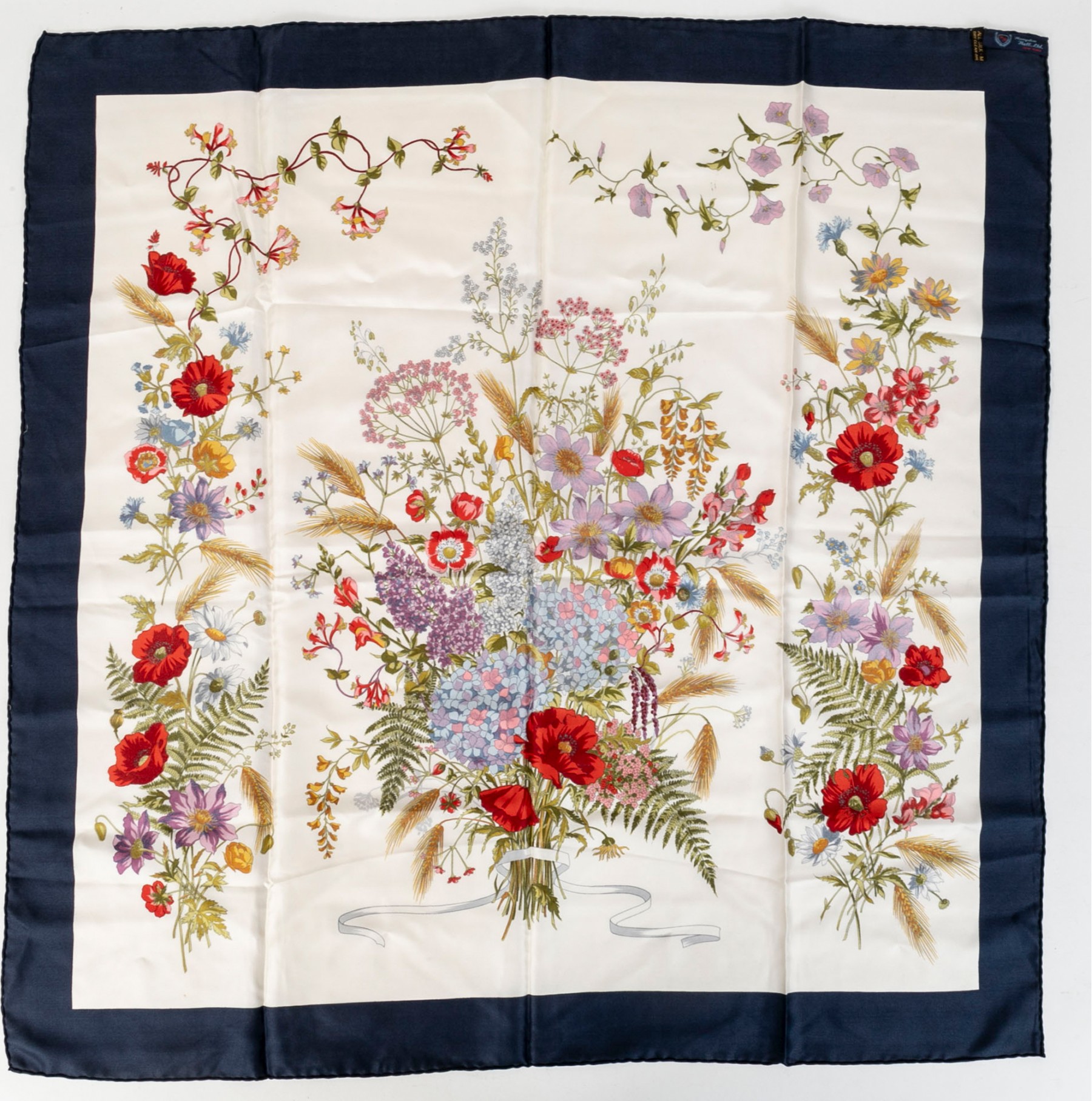 One stunning floral silk scarf with a navy blue boarder. Dry clean only.