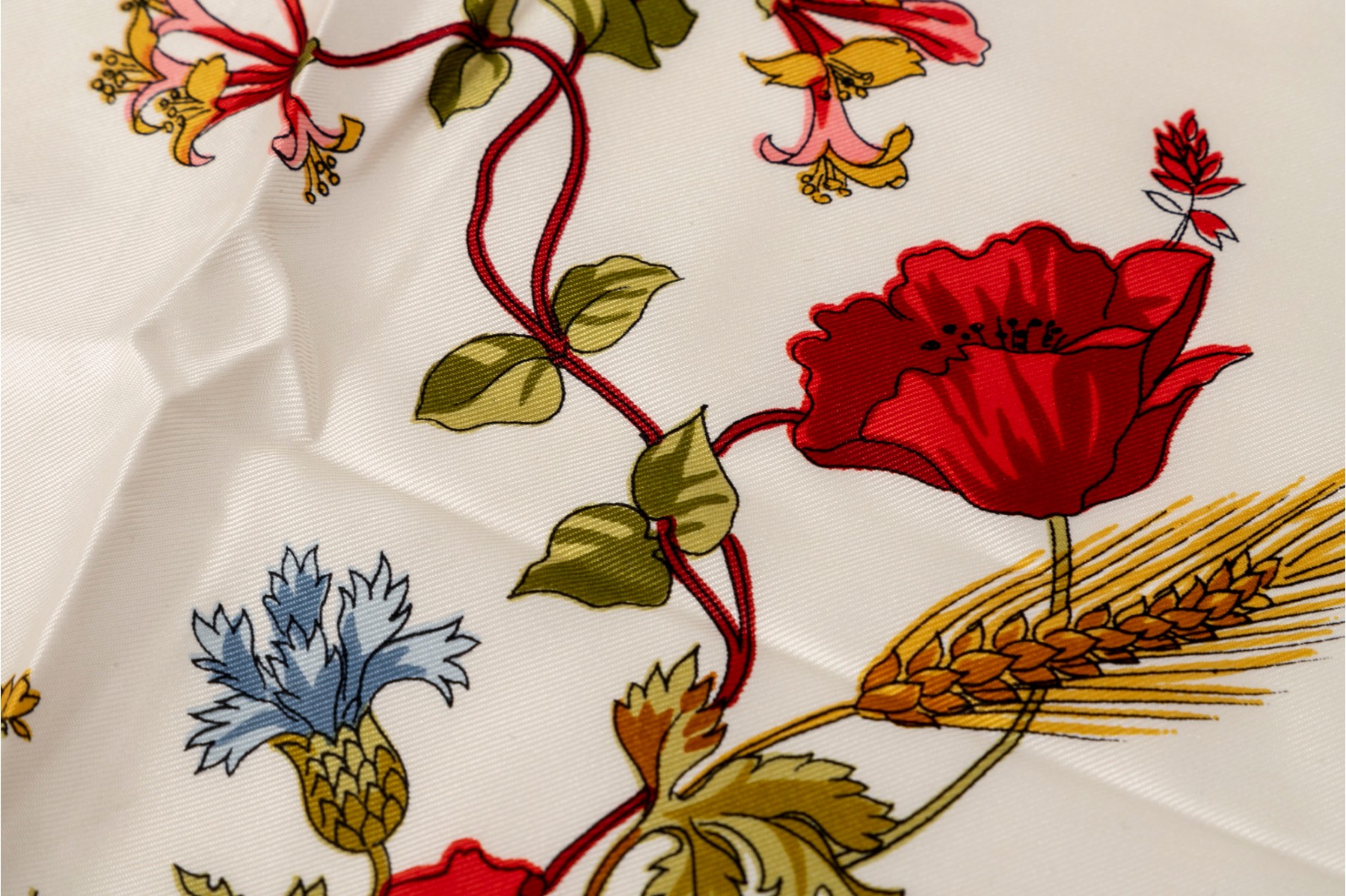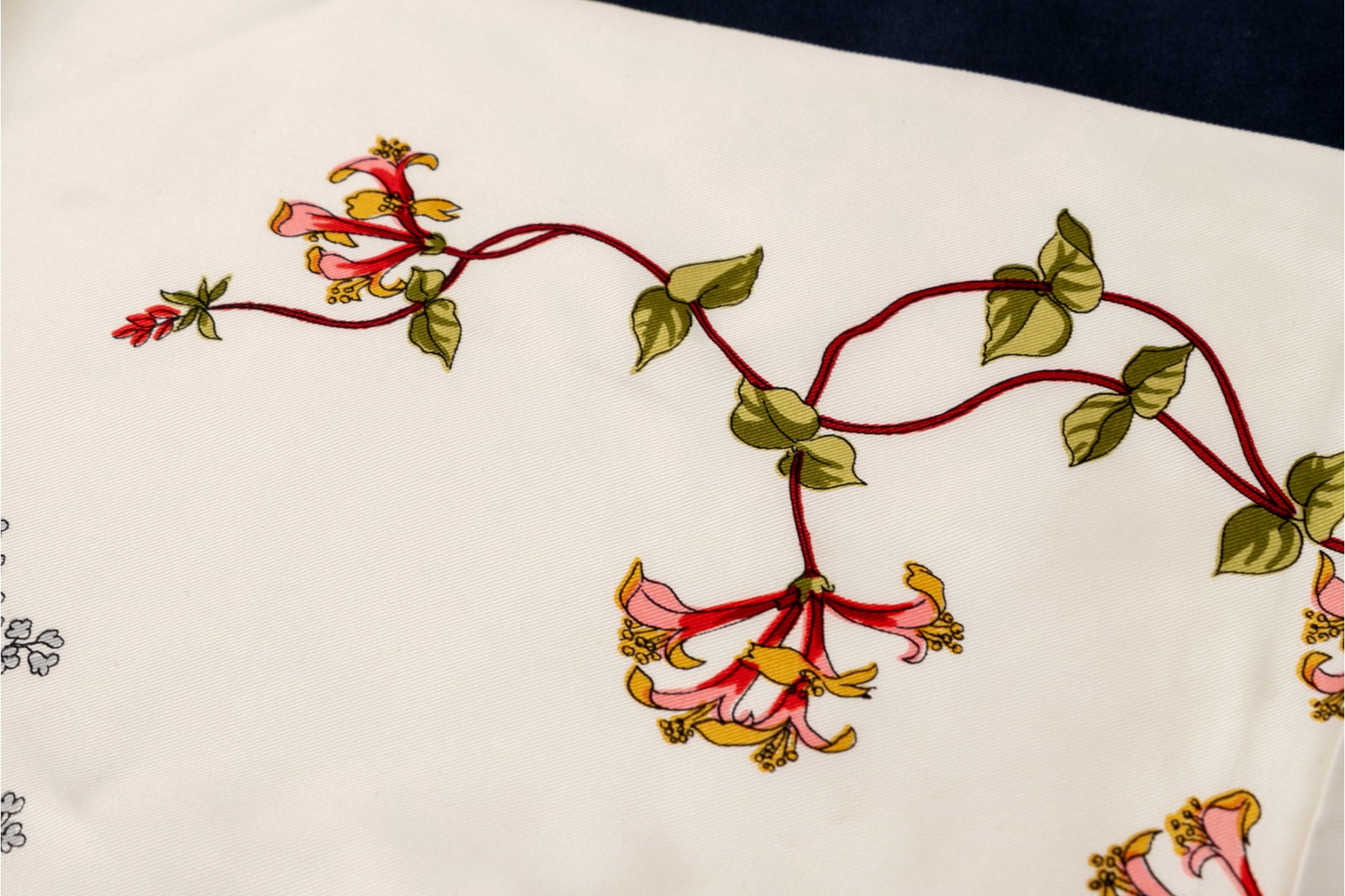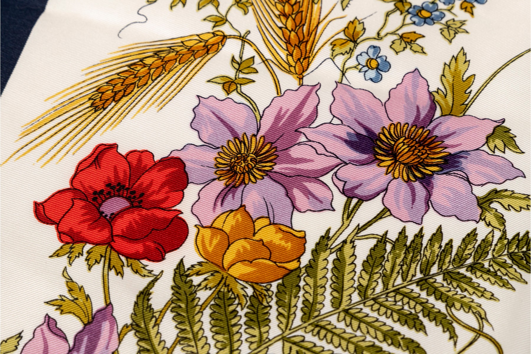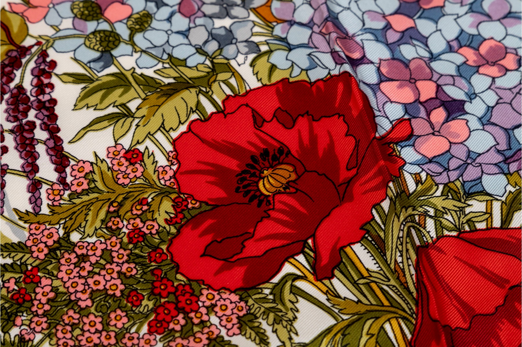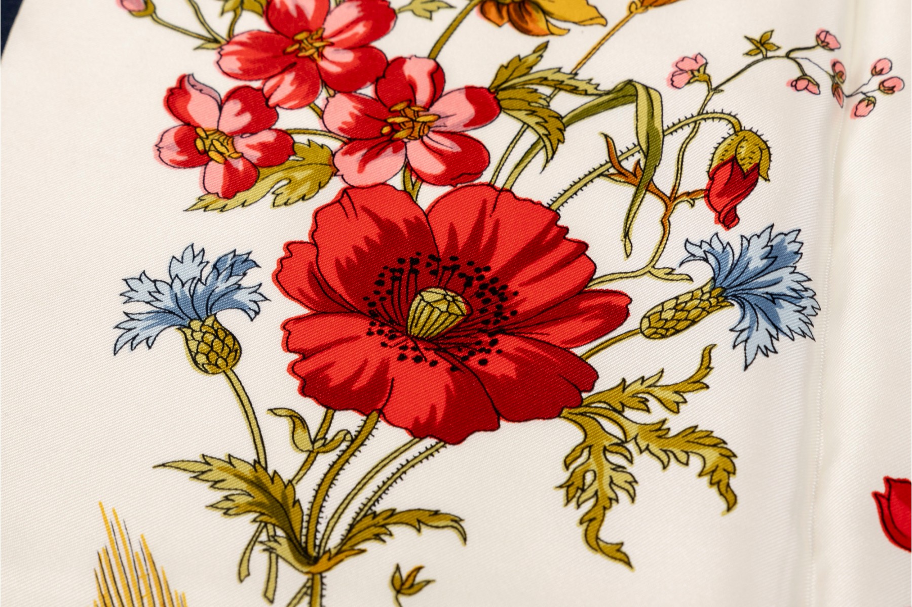 One stunning floral silk scarf with a navy blue boarder. Dry clean only.
