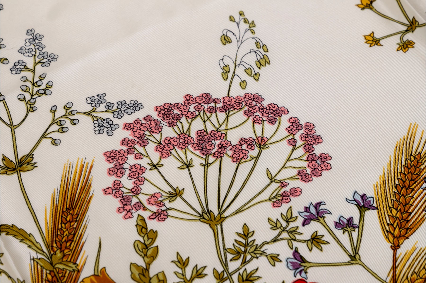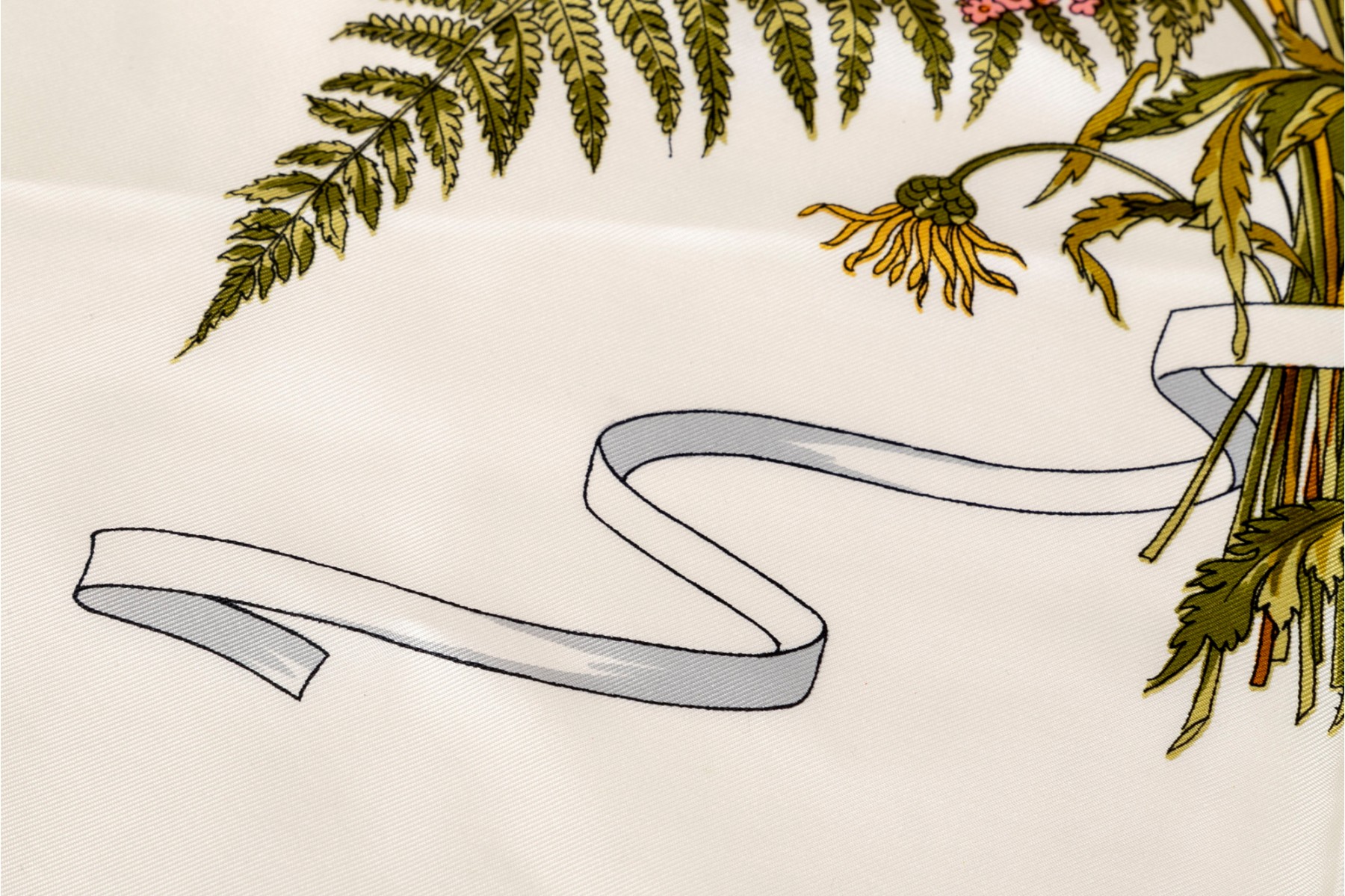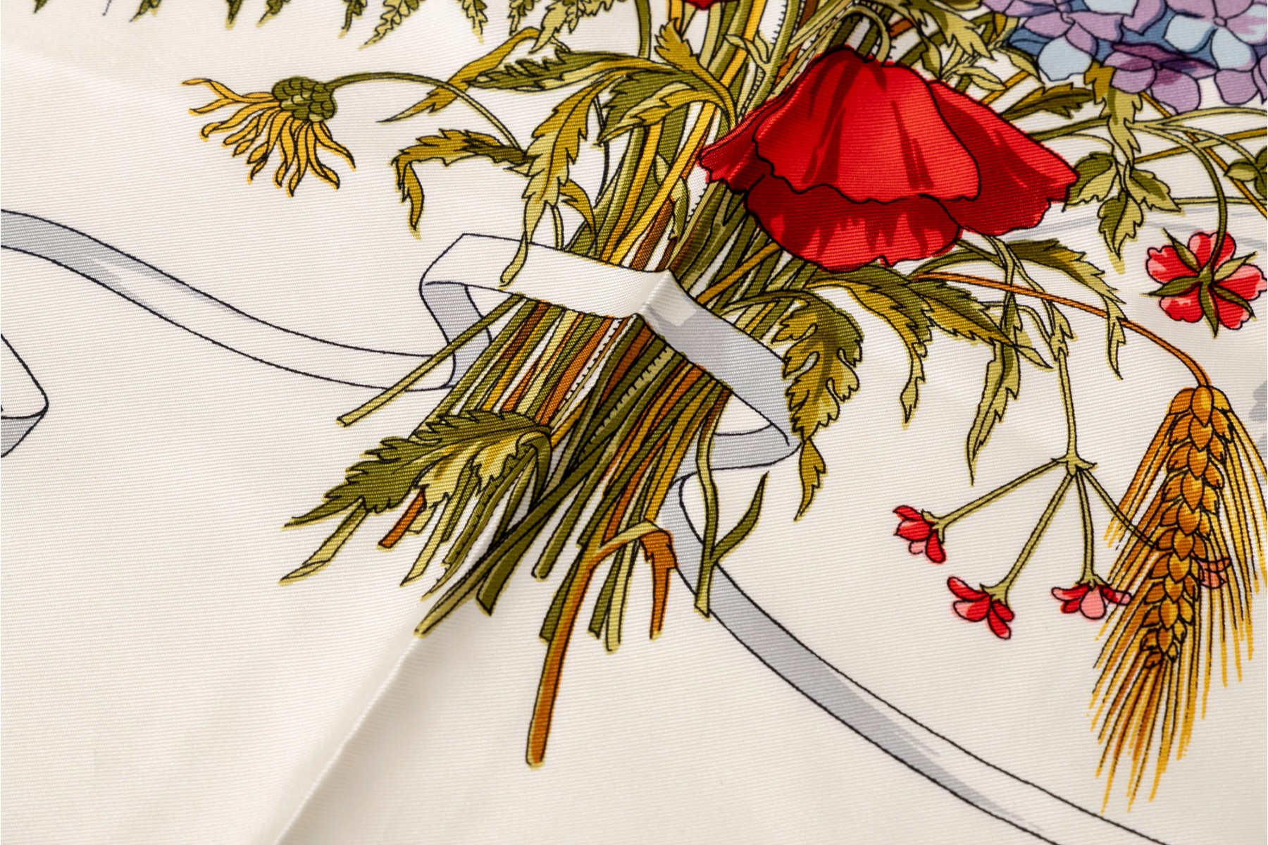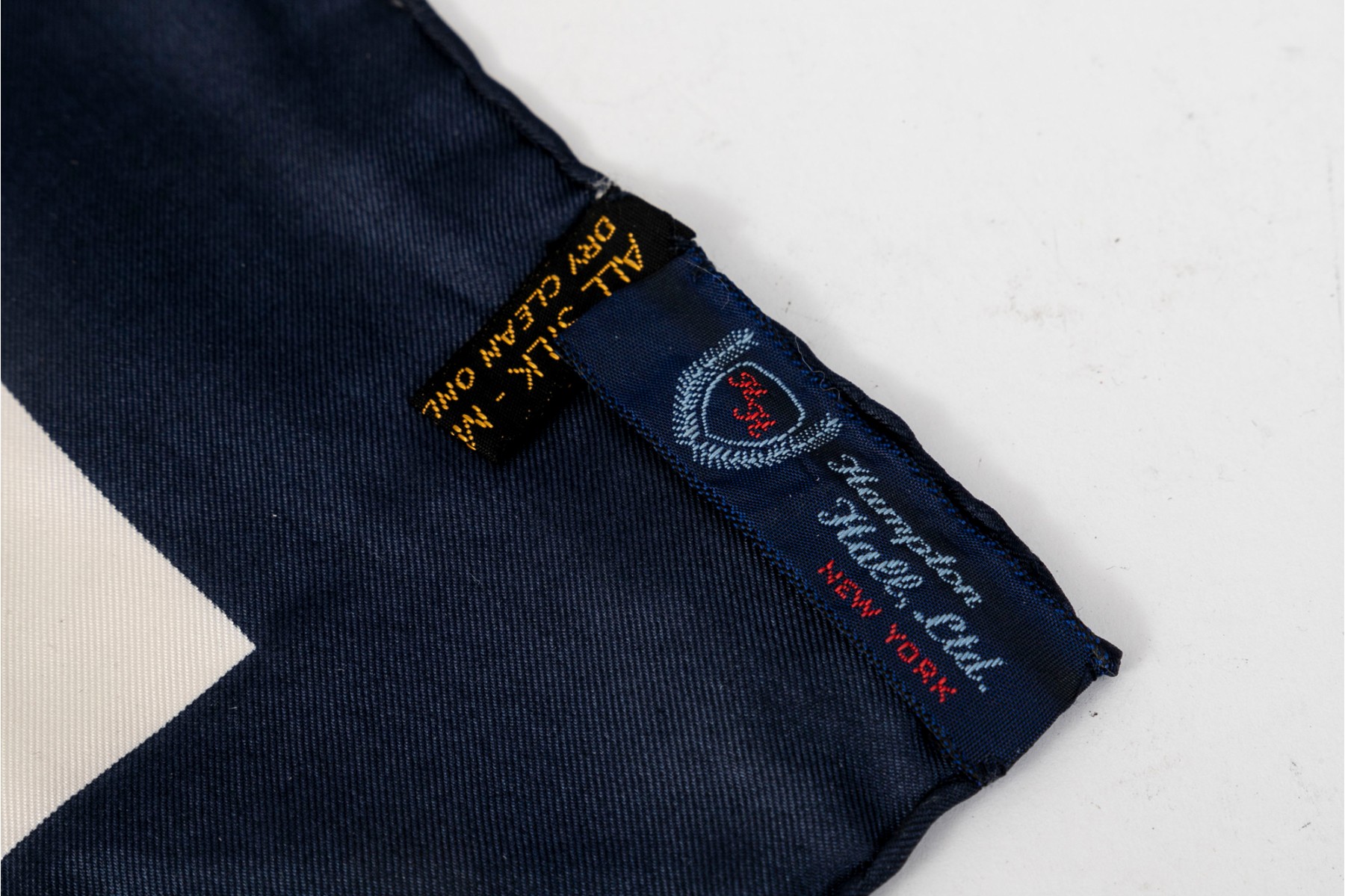 One stunning floral silk scarf with a navy blue boarder. Dry clean only.