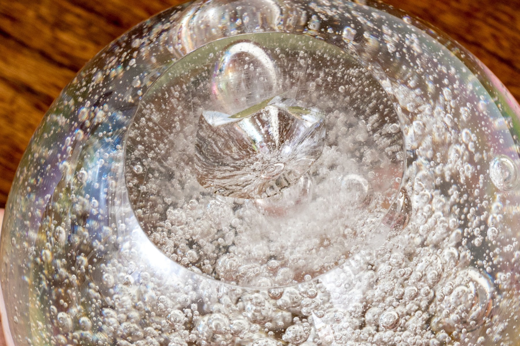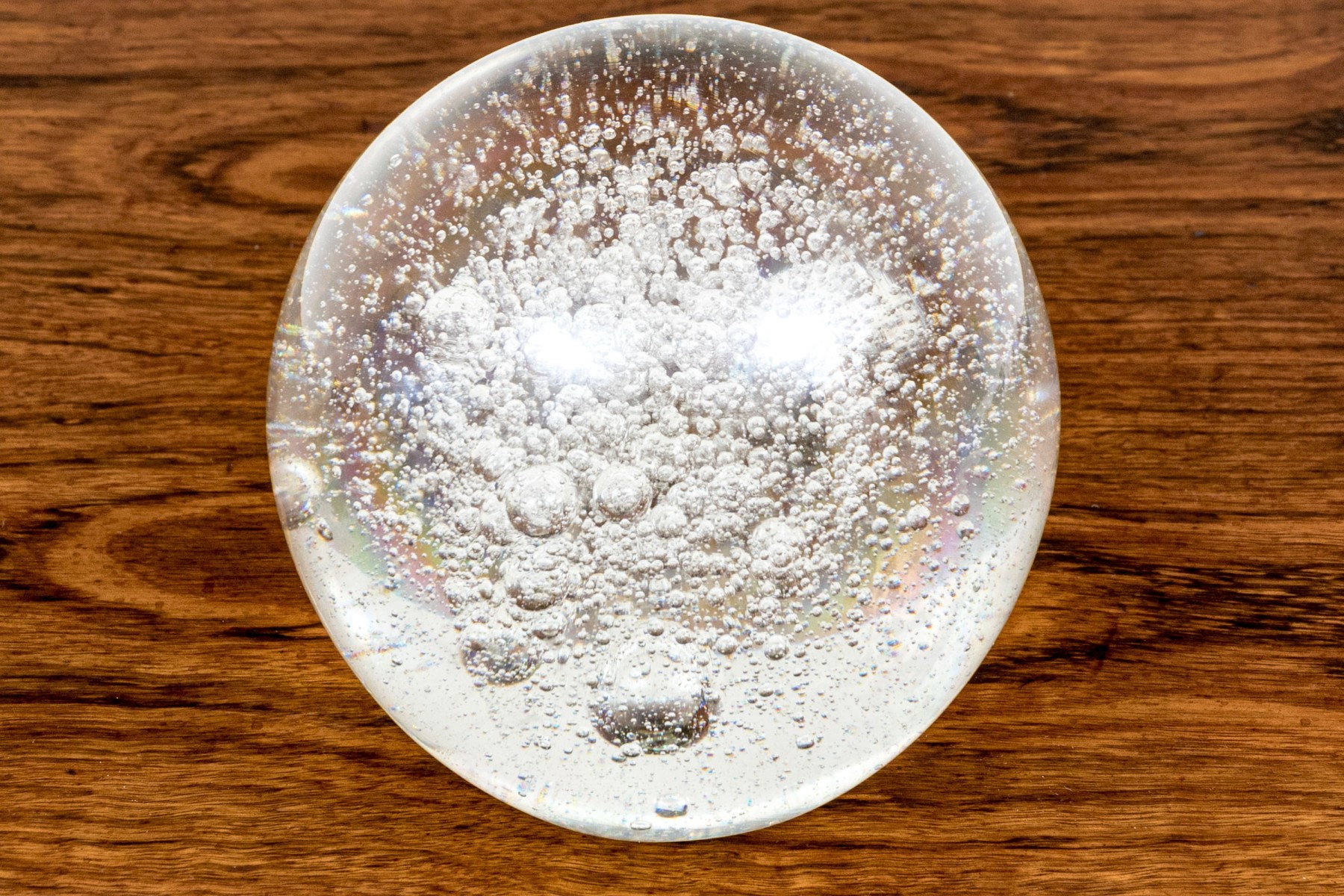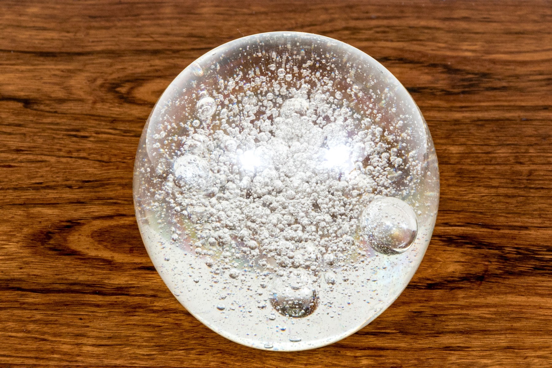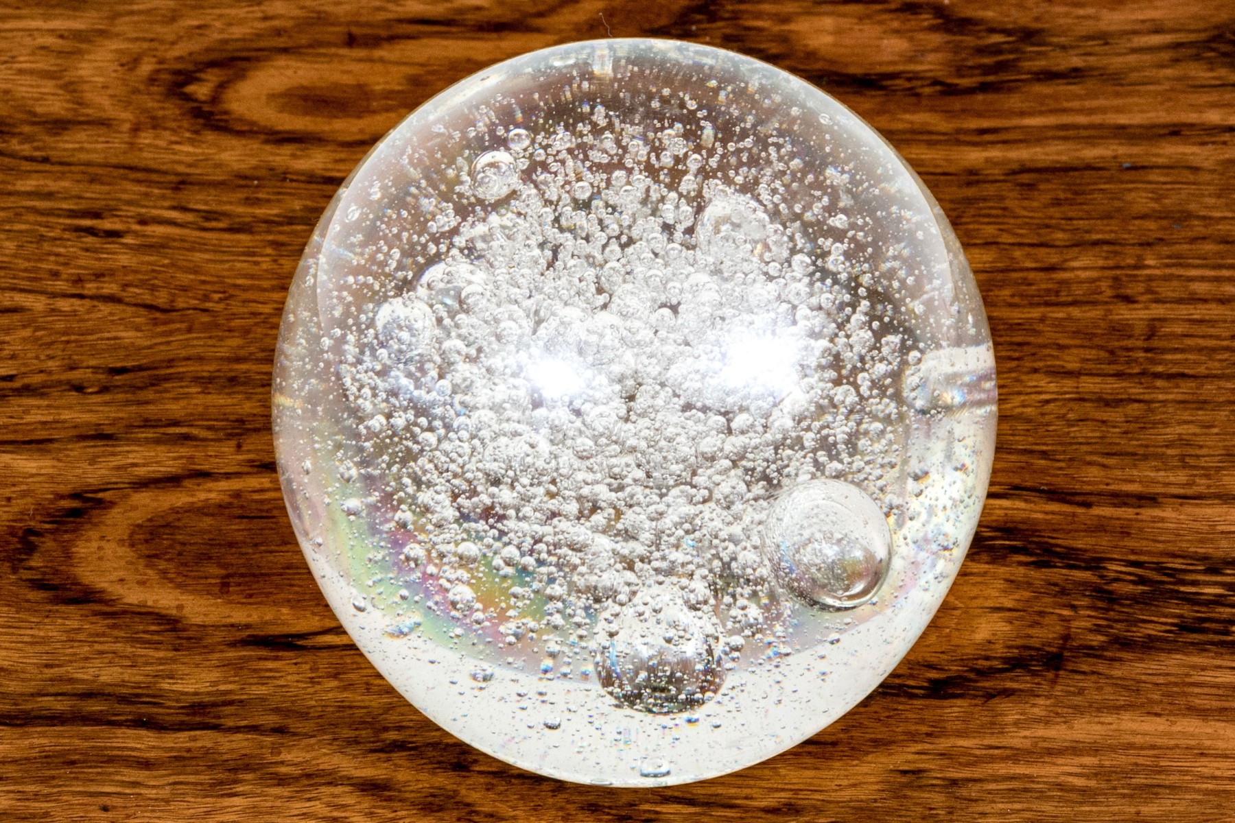 Ball form with a flat bottom to stand in place. Magnificently suffused with varied sized bubbles in a naturalistic manner.