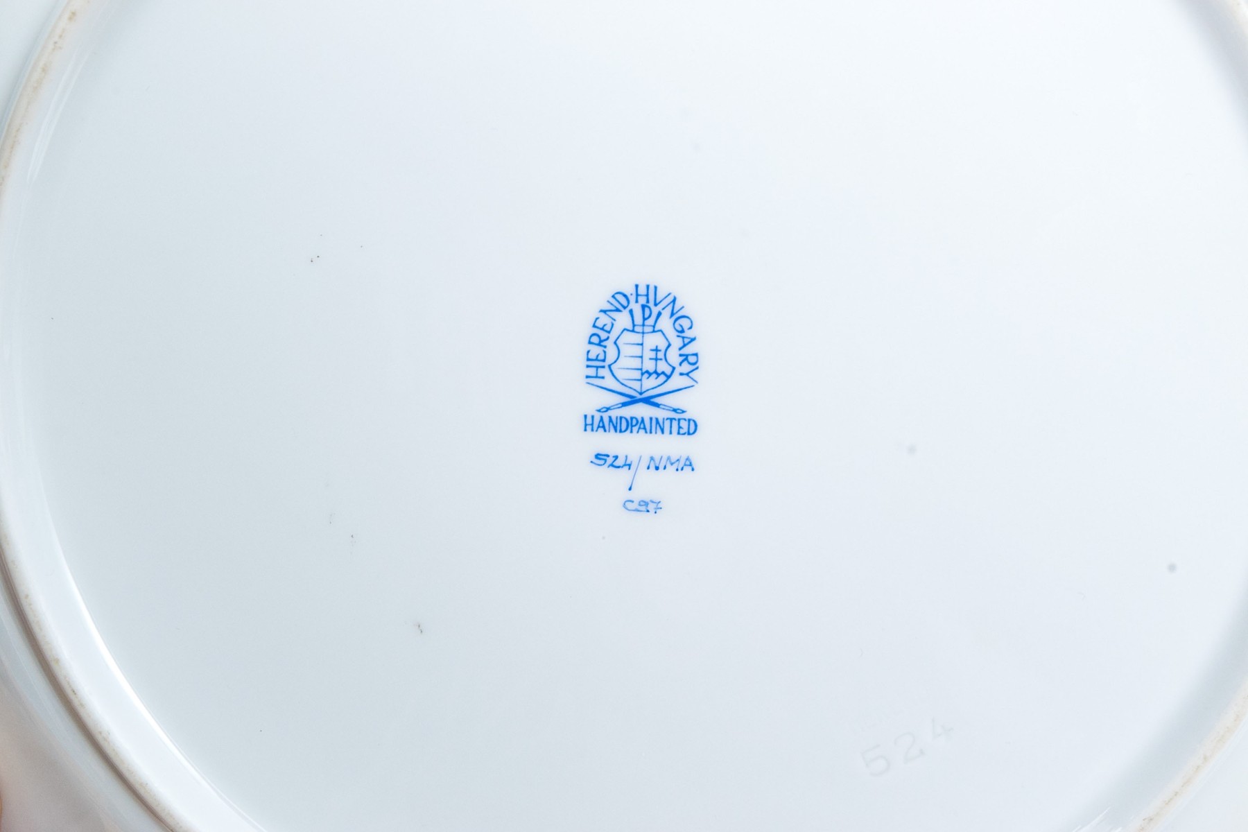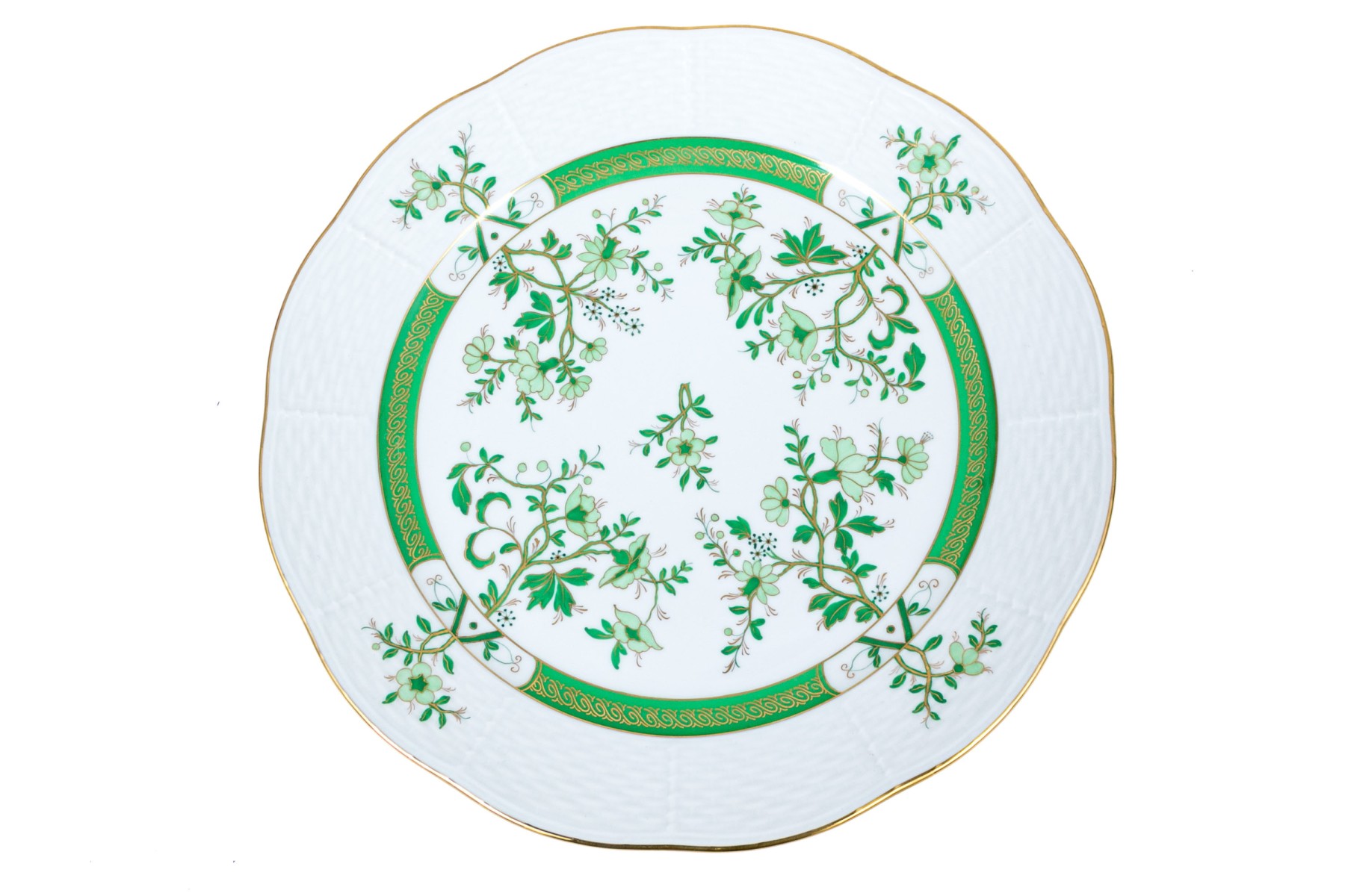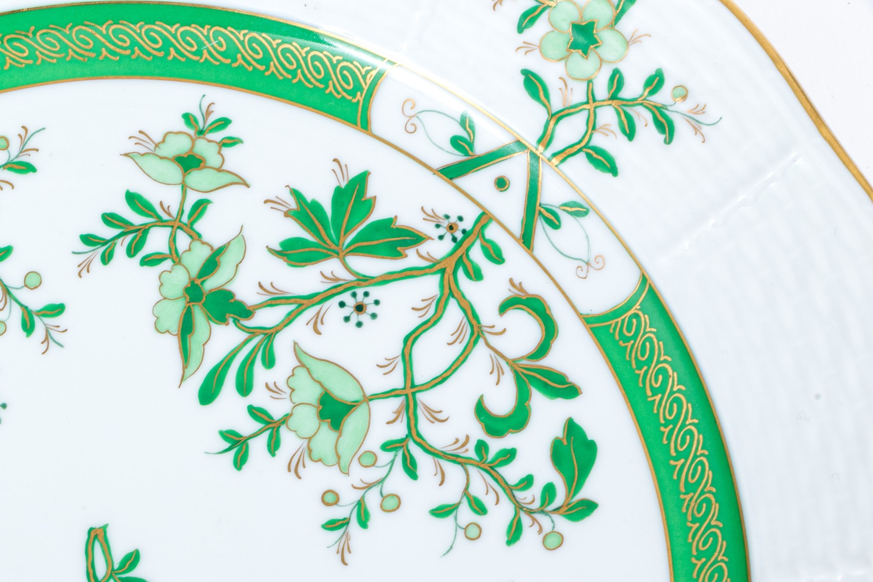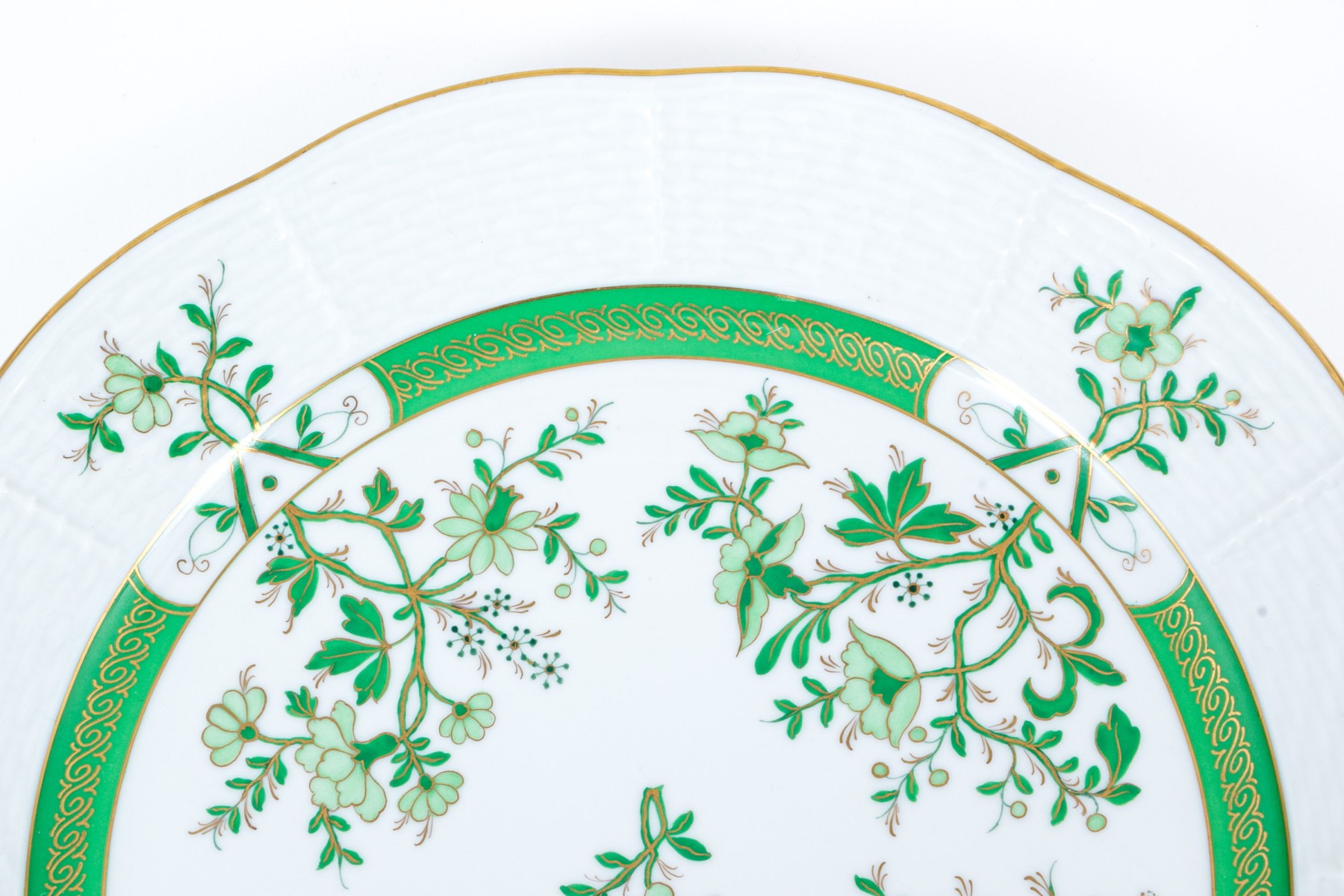 This stunning Herend plate showcases a green and gold gilt floral pattern over a white background. The border of the plate has a textured design with gold gilt edge.