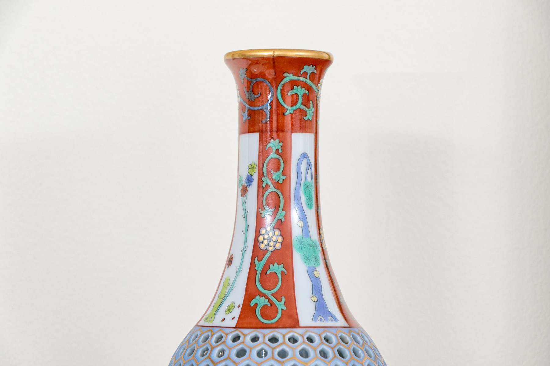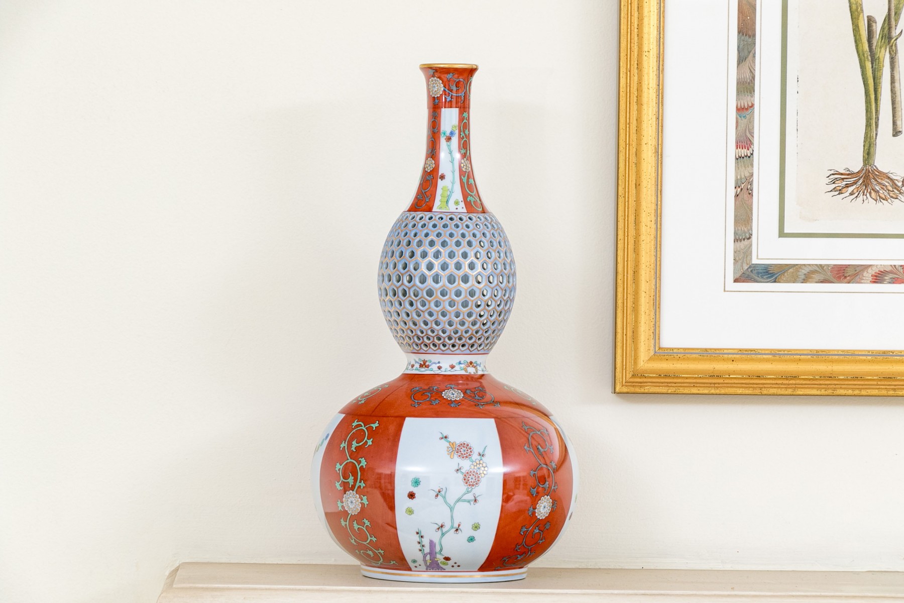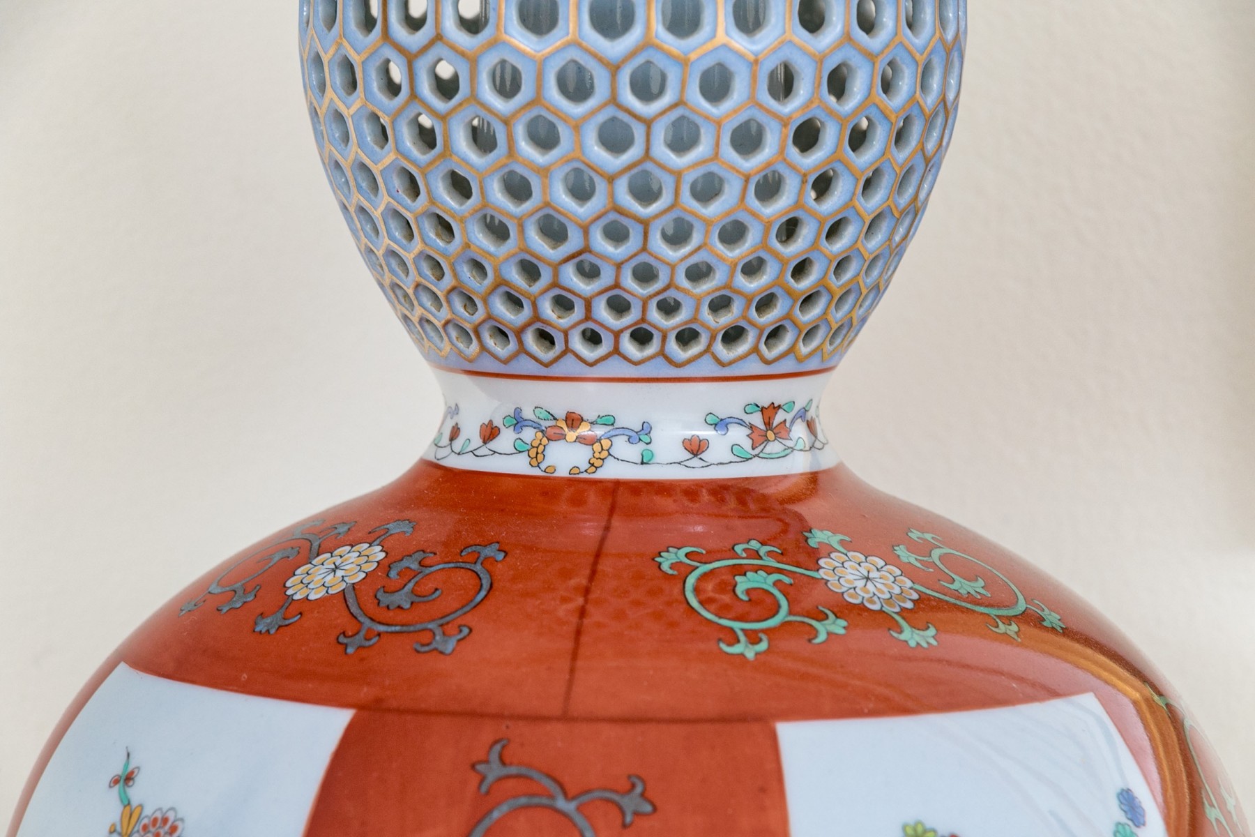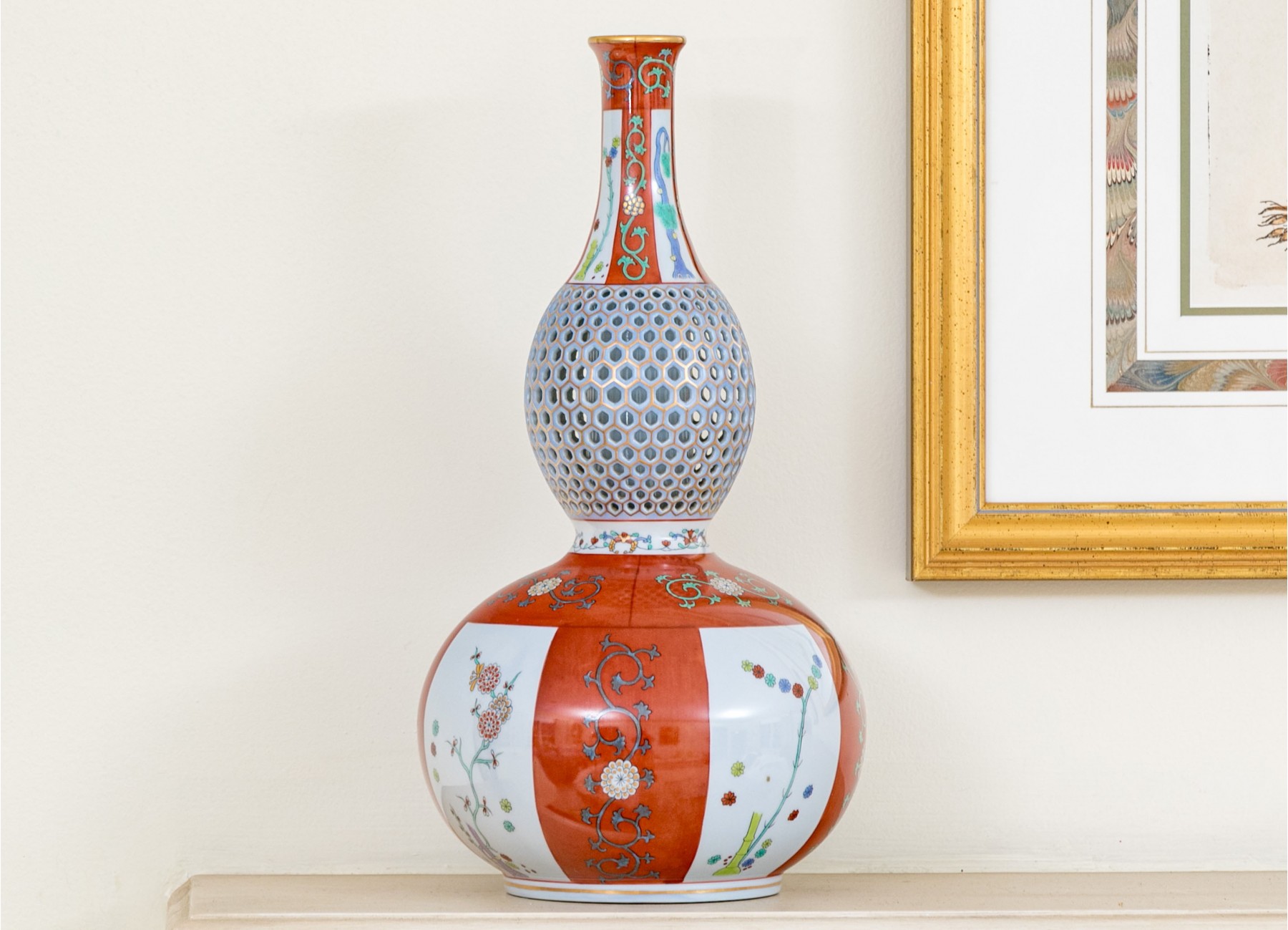 Magnificent Herend porcelain Cubash vase, featuring a double gourd design with intricate openwork detailing, and meticulously hand-painted. Bears the signature blue heron stamp and is marked "6712/G" on the bottom.