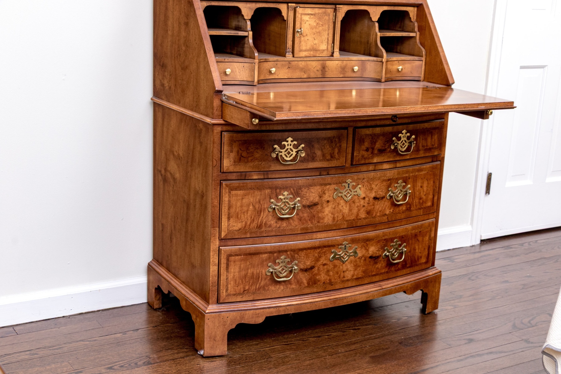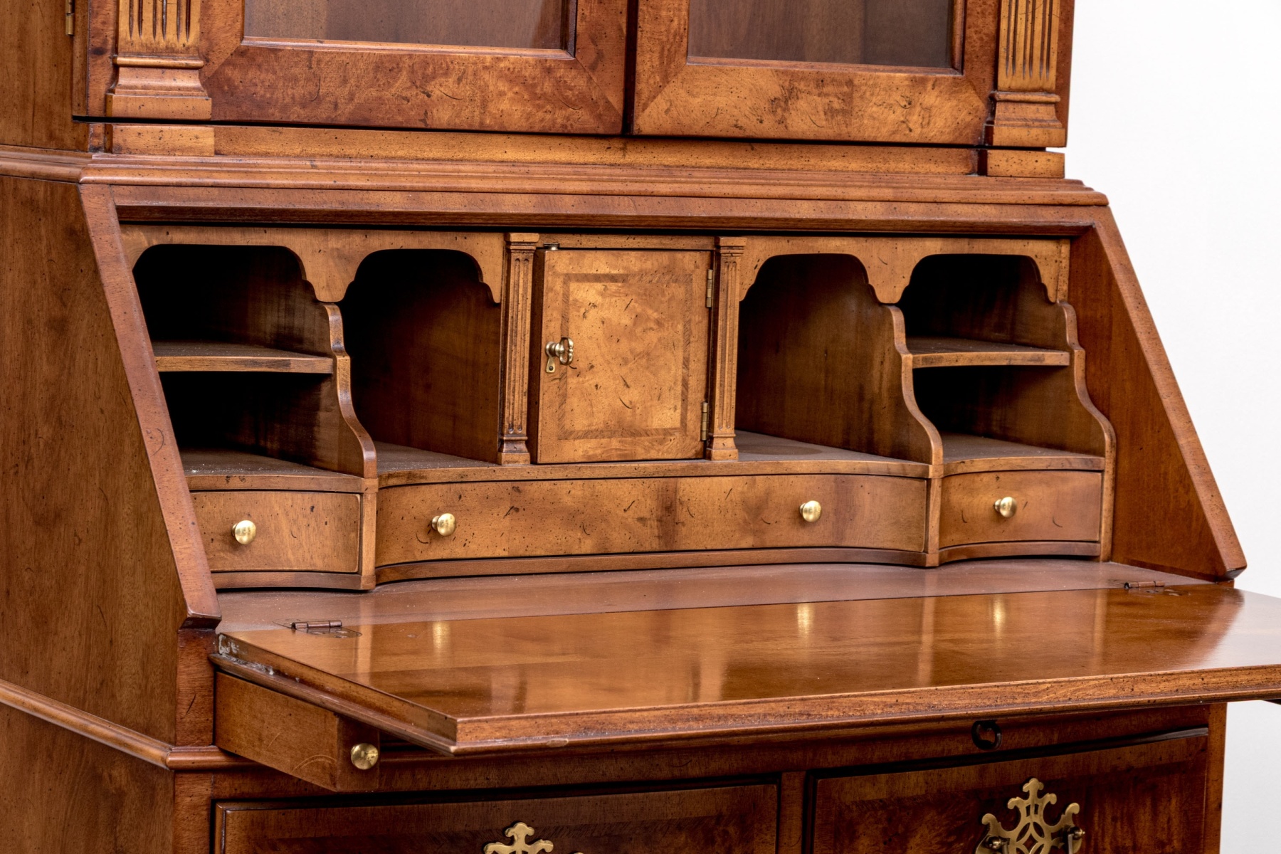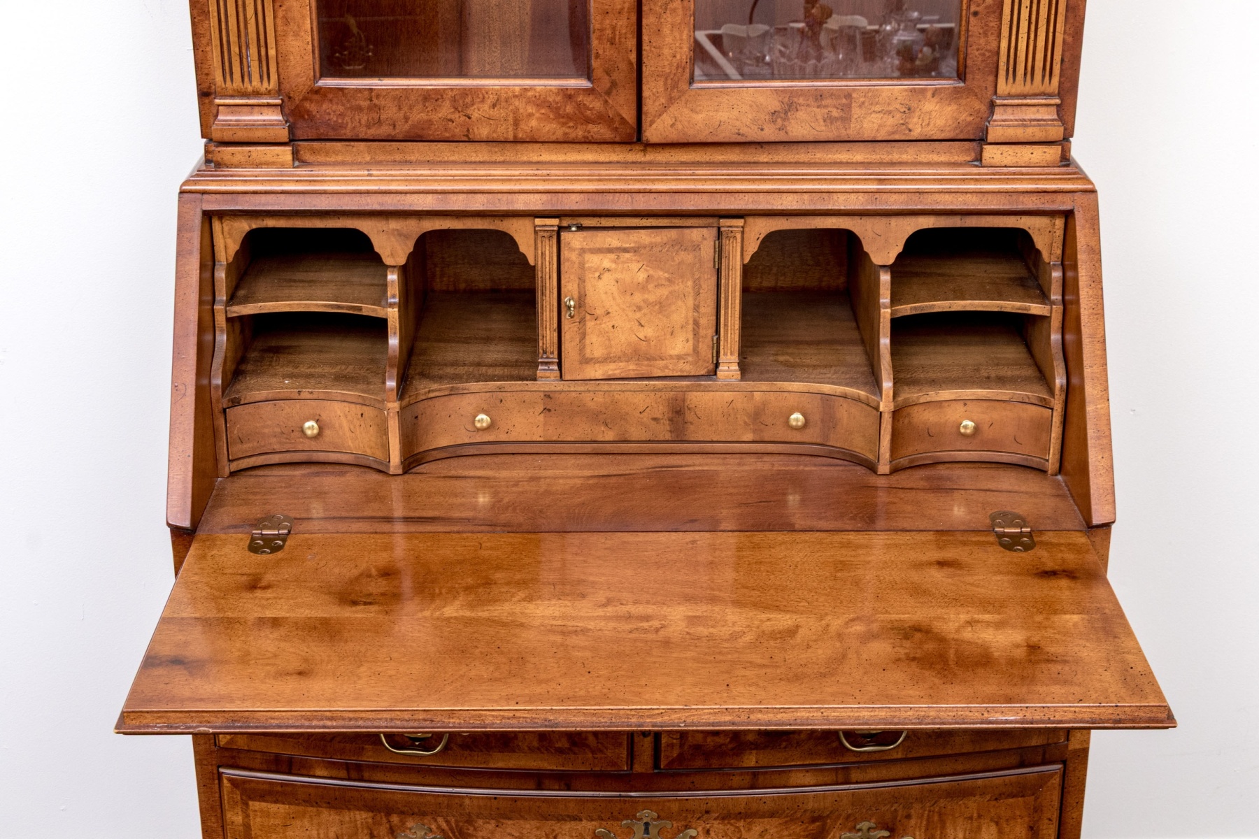 In one piece. Standing on four supports, the chest has four bow front drawers, with brass drawer pulls. The top two drawers, with slide pulls to support the slant front writing desk. Desk opens to reveal drawers, a cabinet and miniature open compartments. Above are two glass paned hinged doors with brass pulls opening to interior drawers with fantastically carved broken arch pediment.