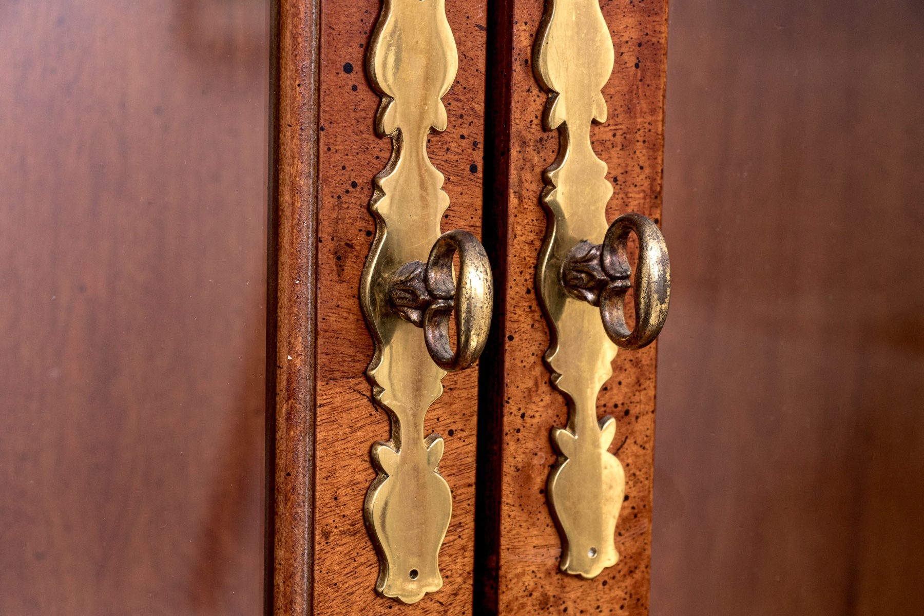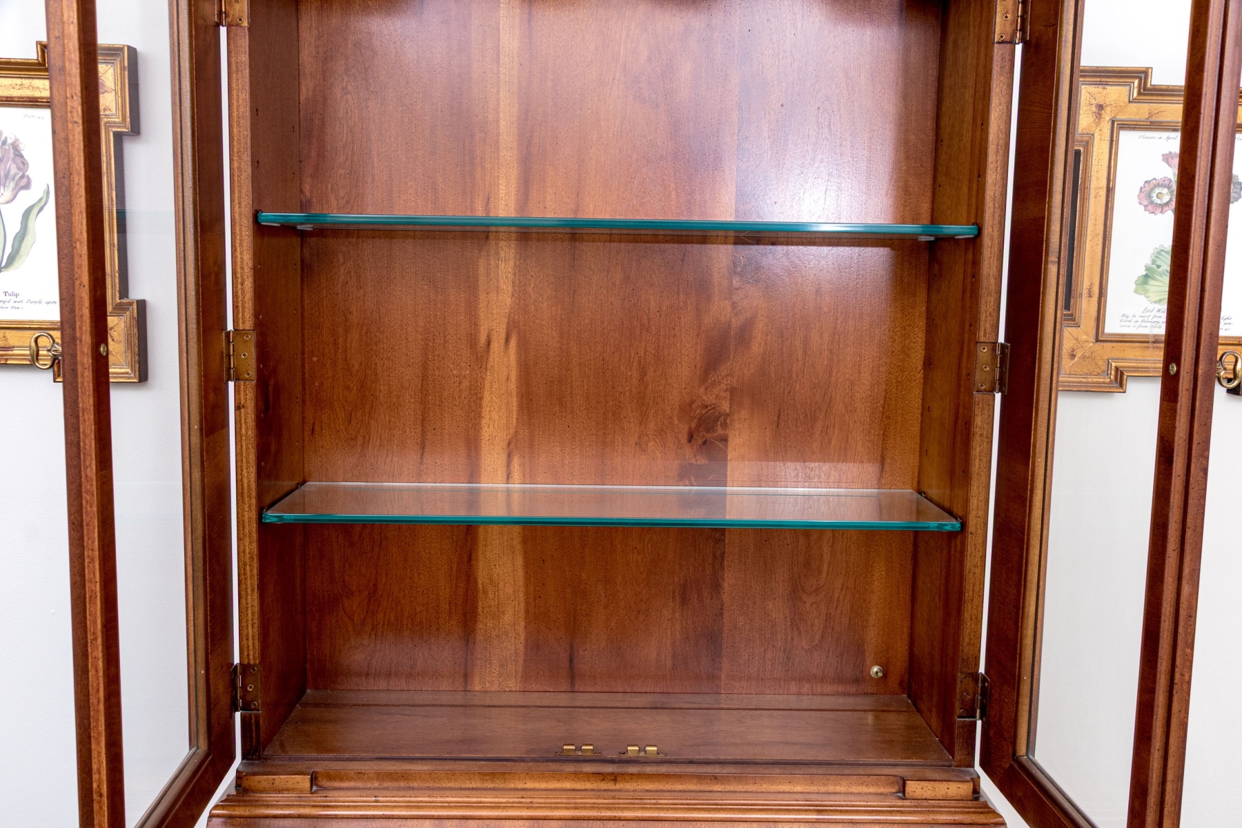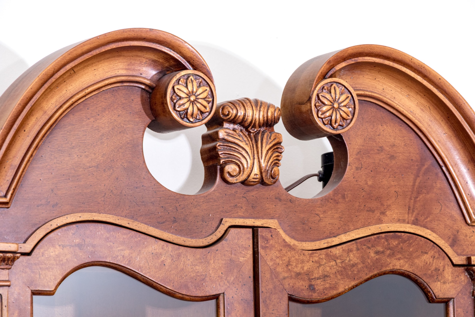 In one piece. Standing on four supports, the chest has four bow front drawers, with brass drawer pulls. The top two drawers, with slide pulls to support the slant front writing desk. Desk opens to reveal drawers, a cabinet and miniature open compartments. Above are two glass paned hinged doors with brass pulls opening to interior drawers with fantastically carved broken arch pediment.