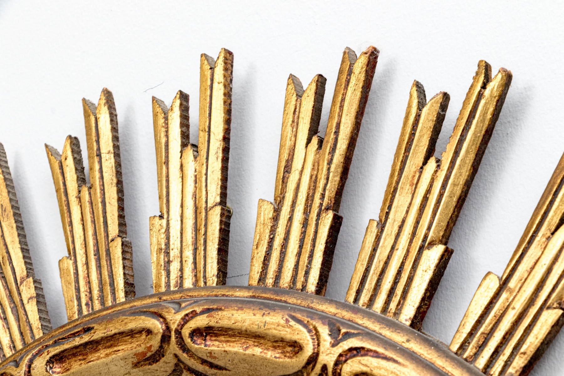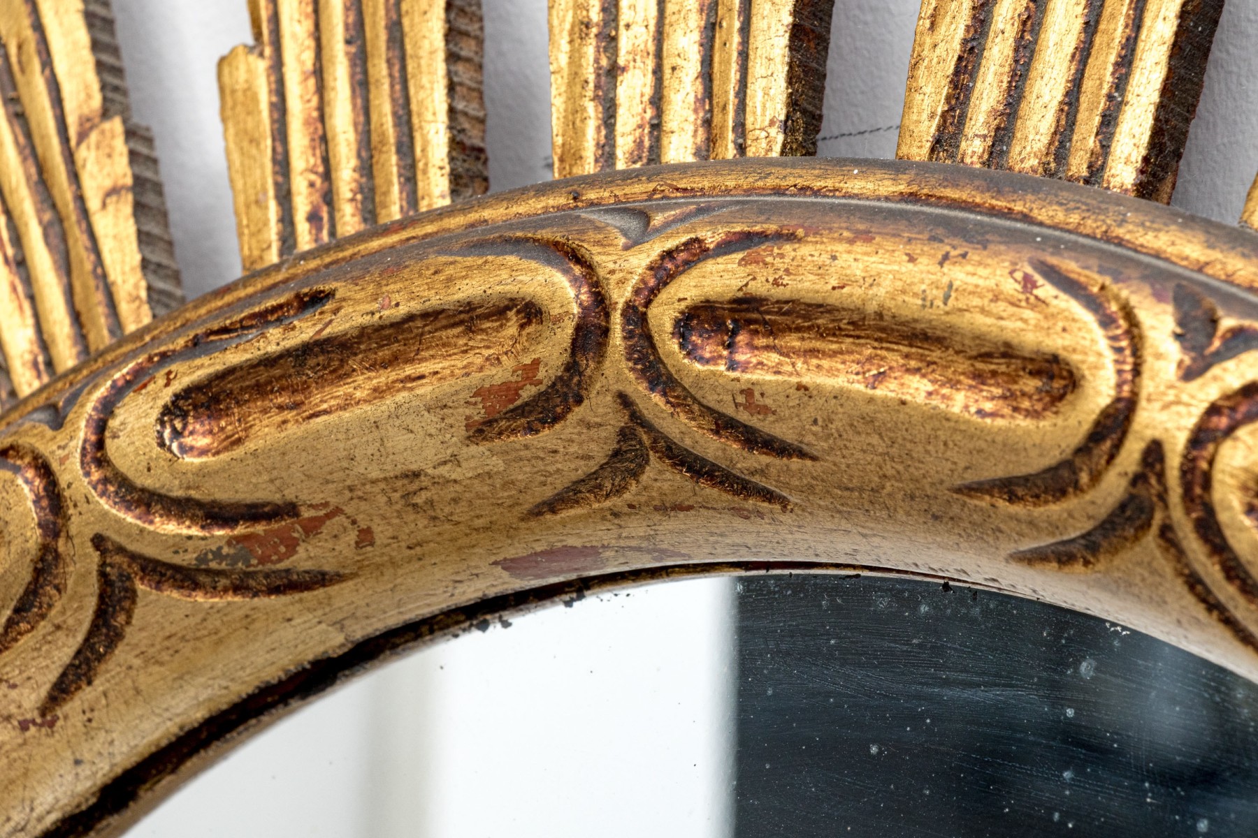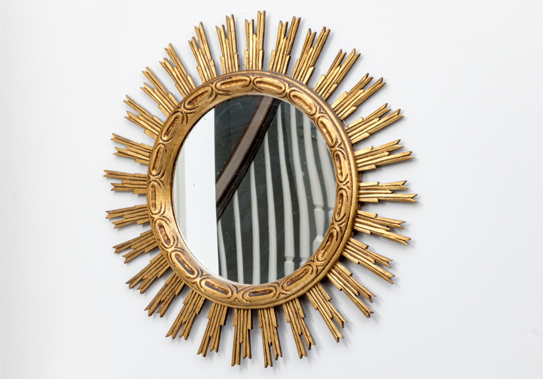 An eye-catching Italianate mirror with a wonderful sun design, showcasing a circular center with a raised rim carved with oval and line motifs surrounded by sculptural rays in a rich gilt finish.